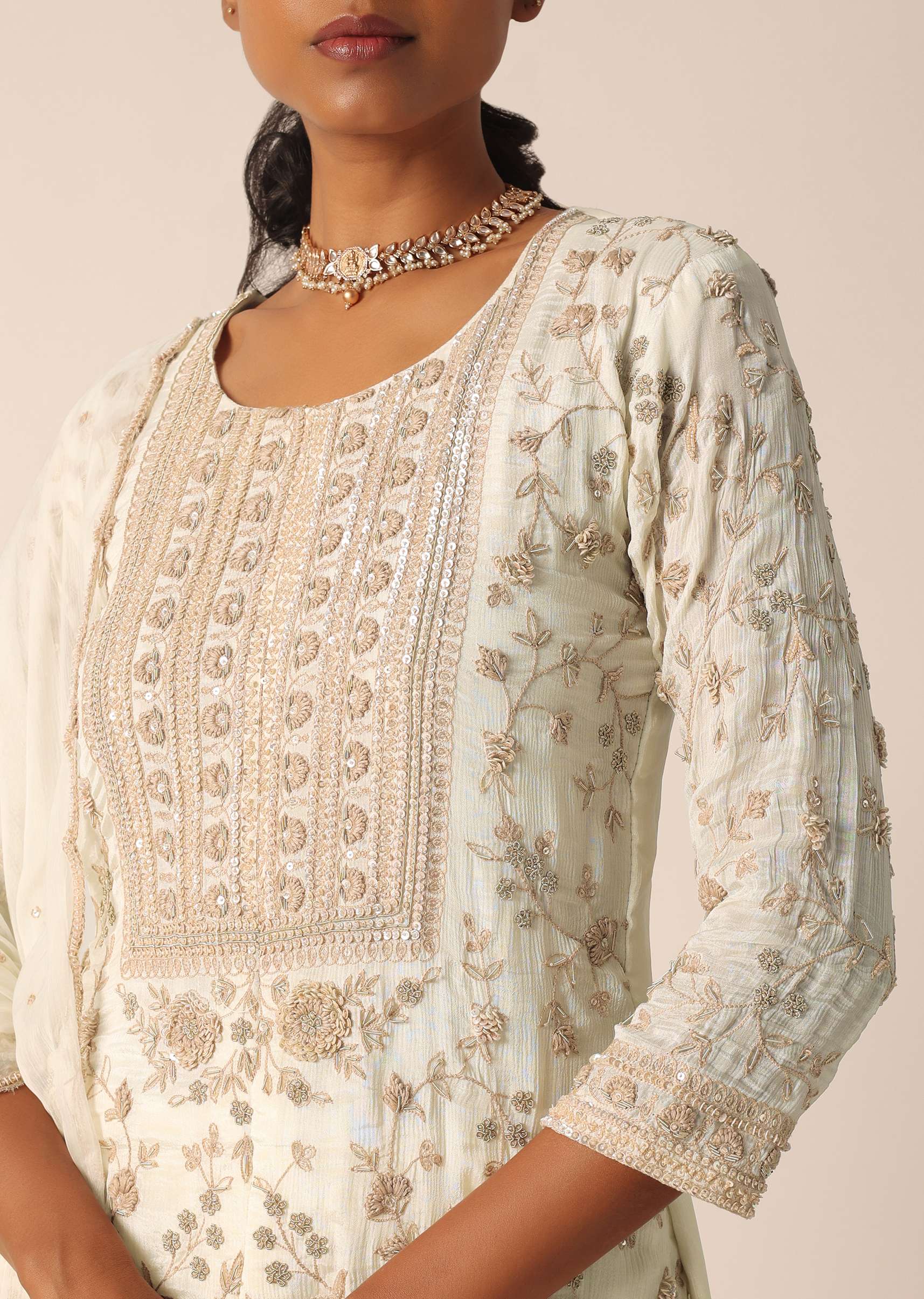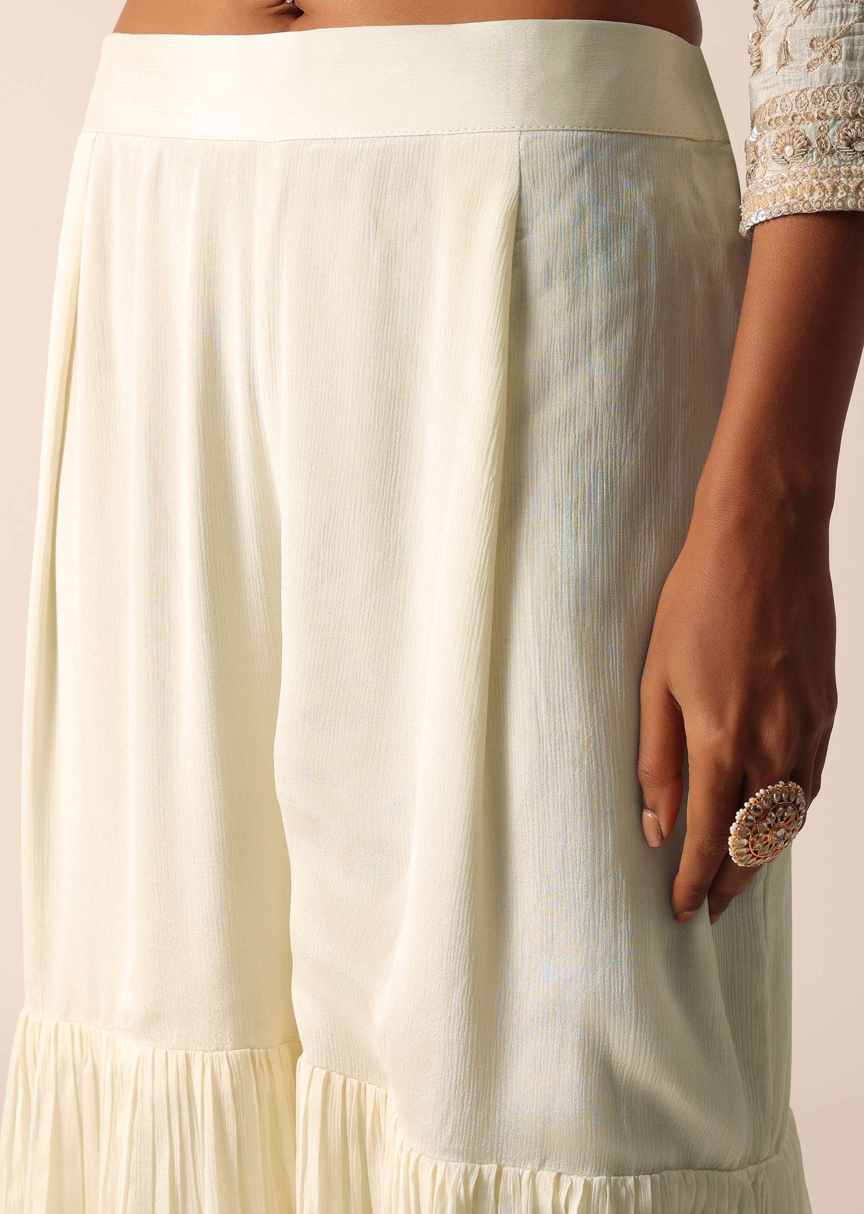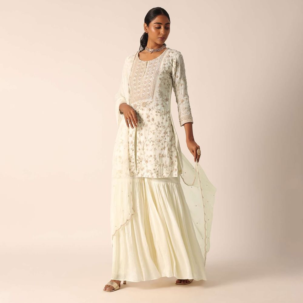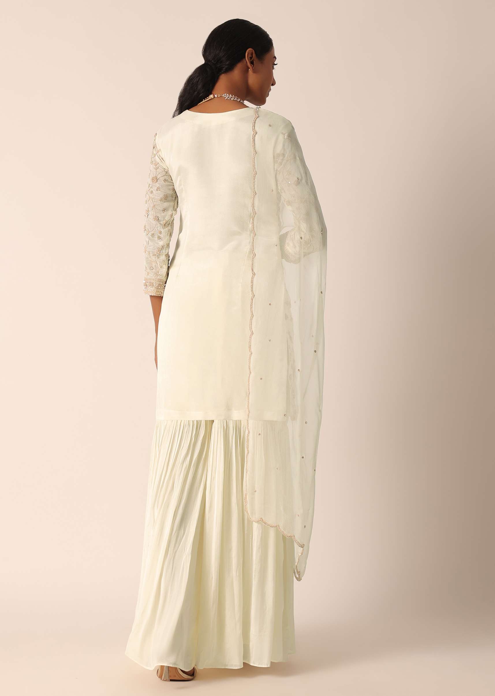 Adding grace and charm to any festive occasion is this beautiful kurta sharara set. Set on a serene white base, it is fabricated from flowy chiffon fabric. Adorned with all-over... More Product Details