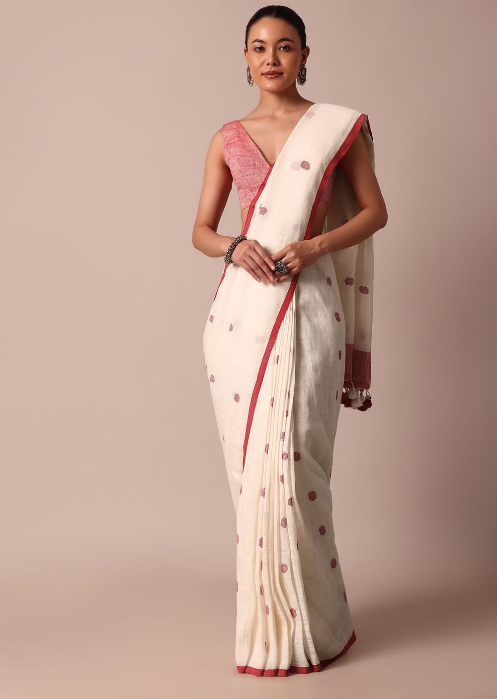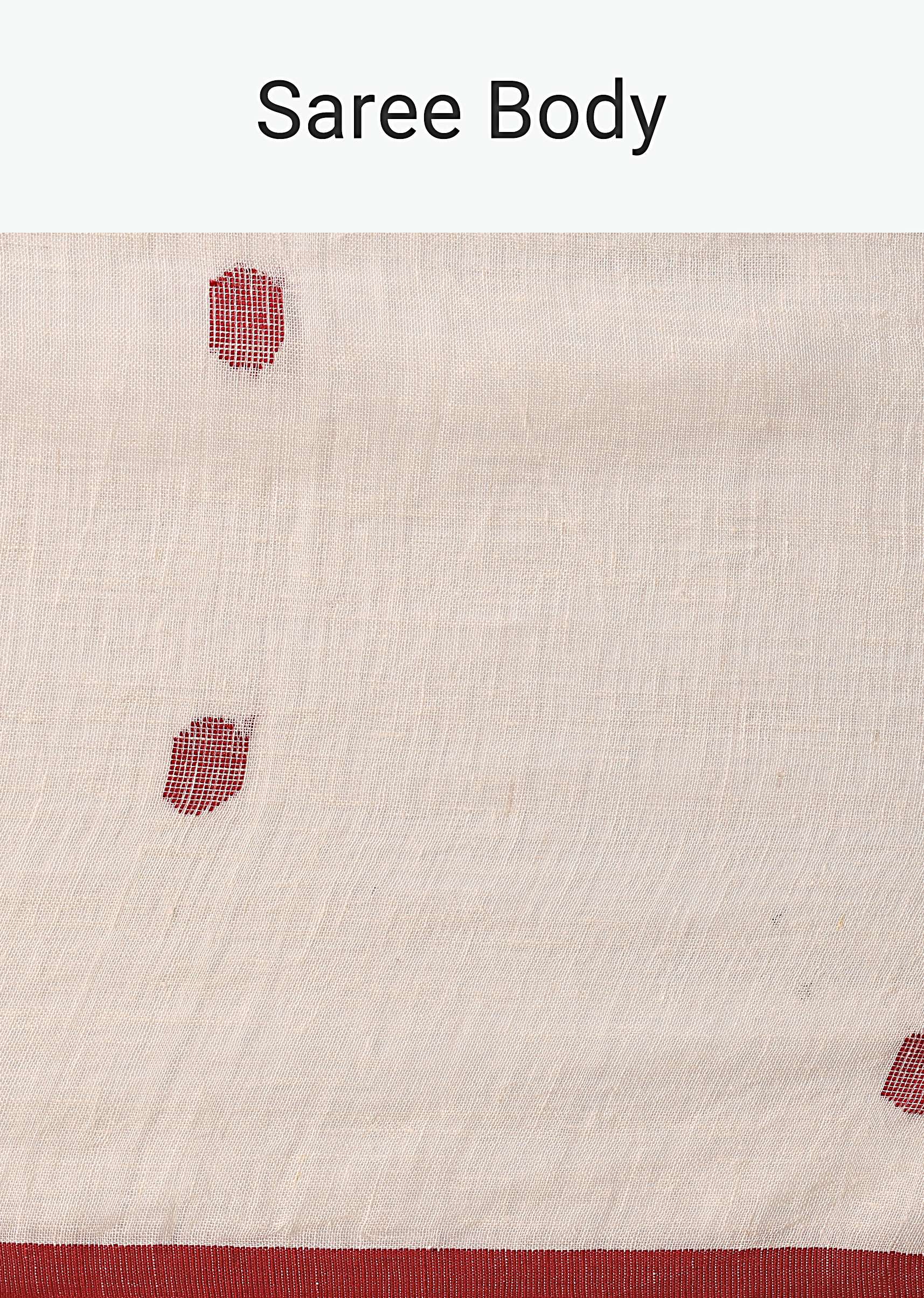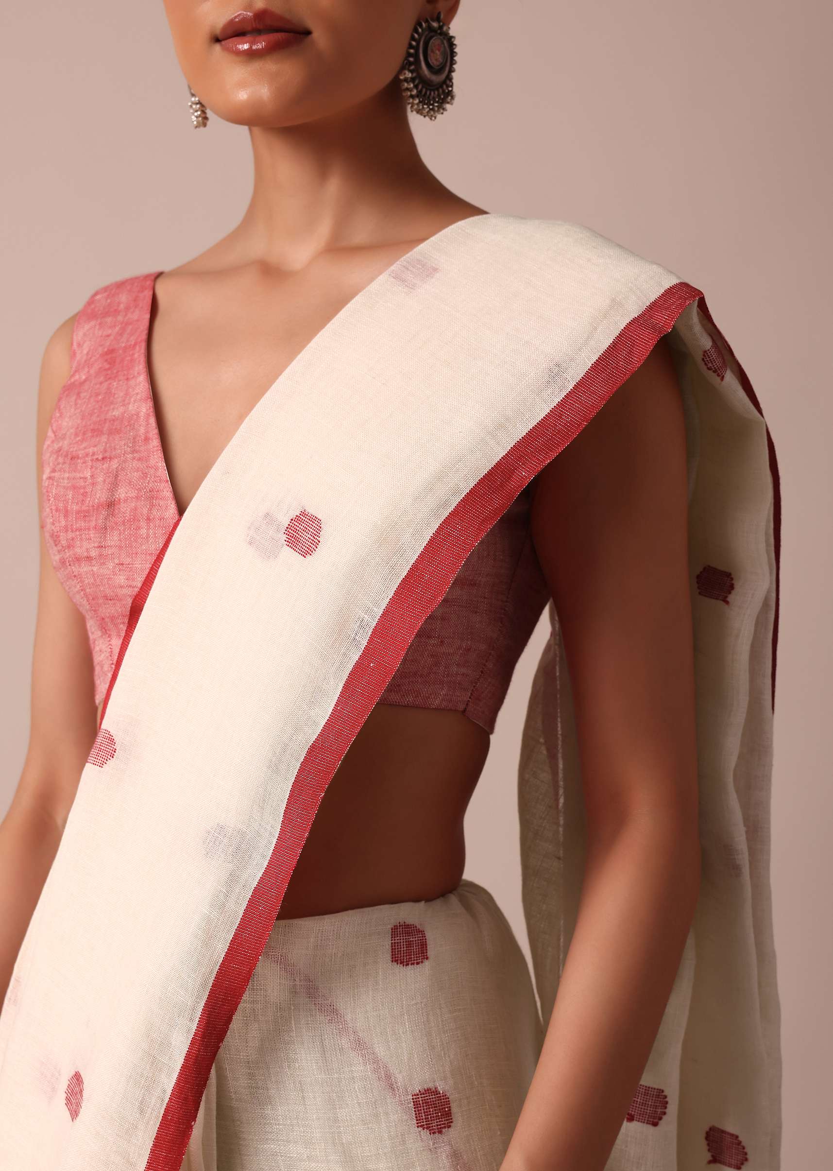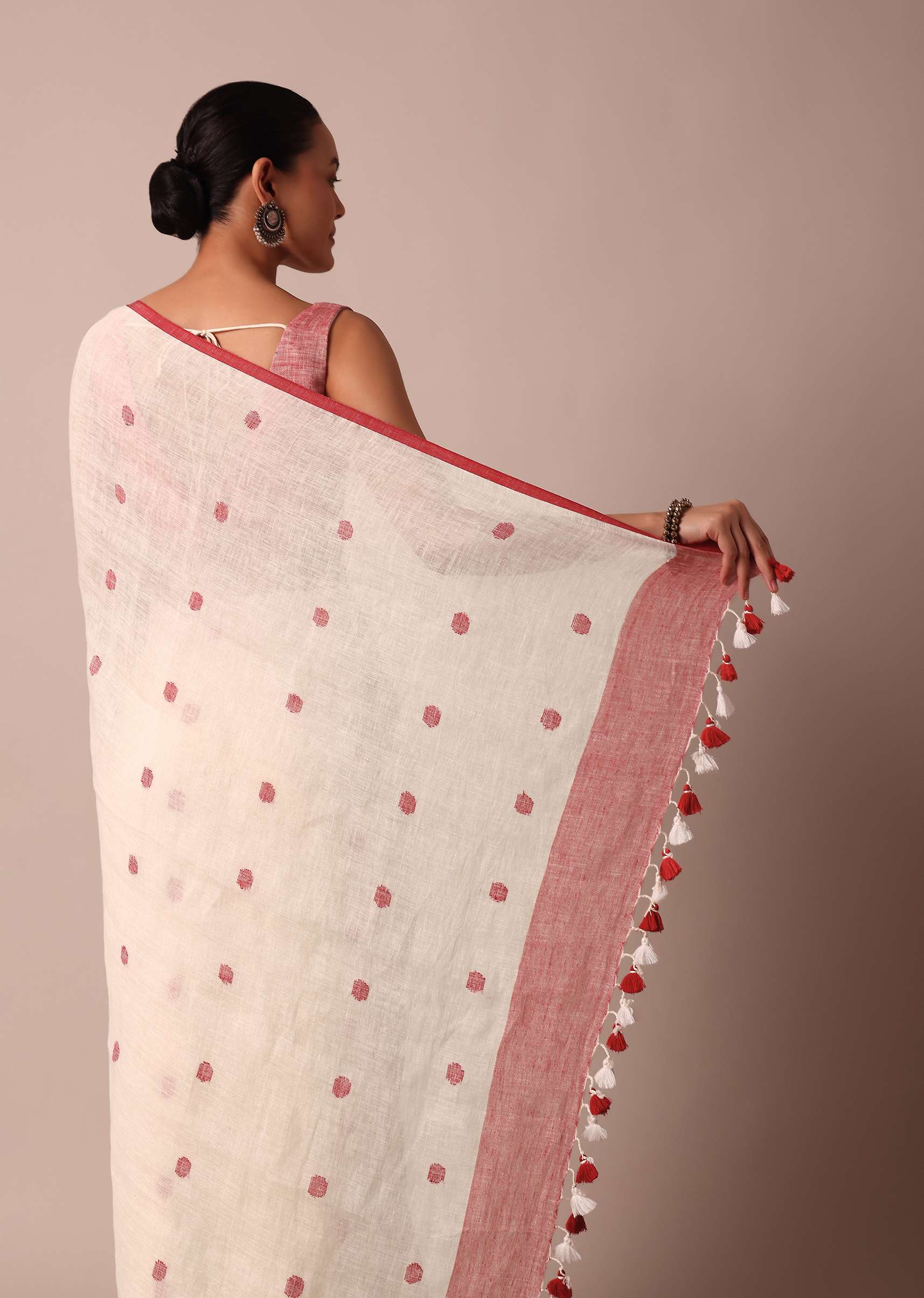 White Cotton Linen Saree With Red Polka Dots And Unstitched Blouse Piece