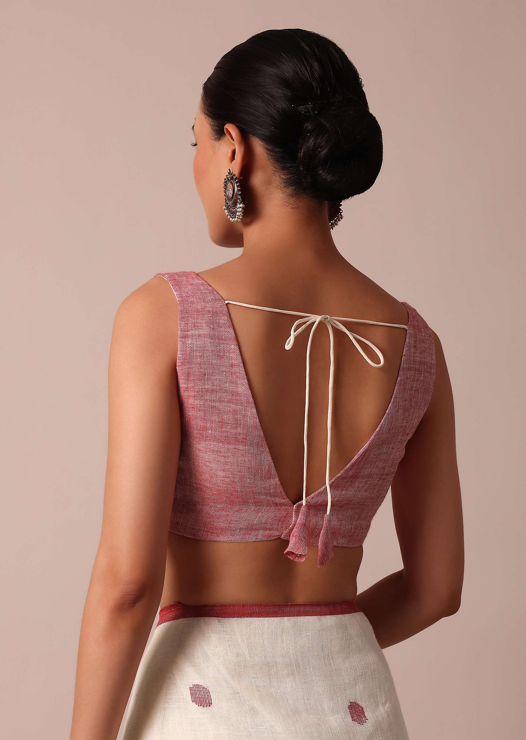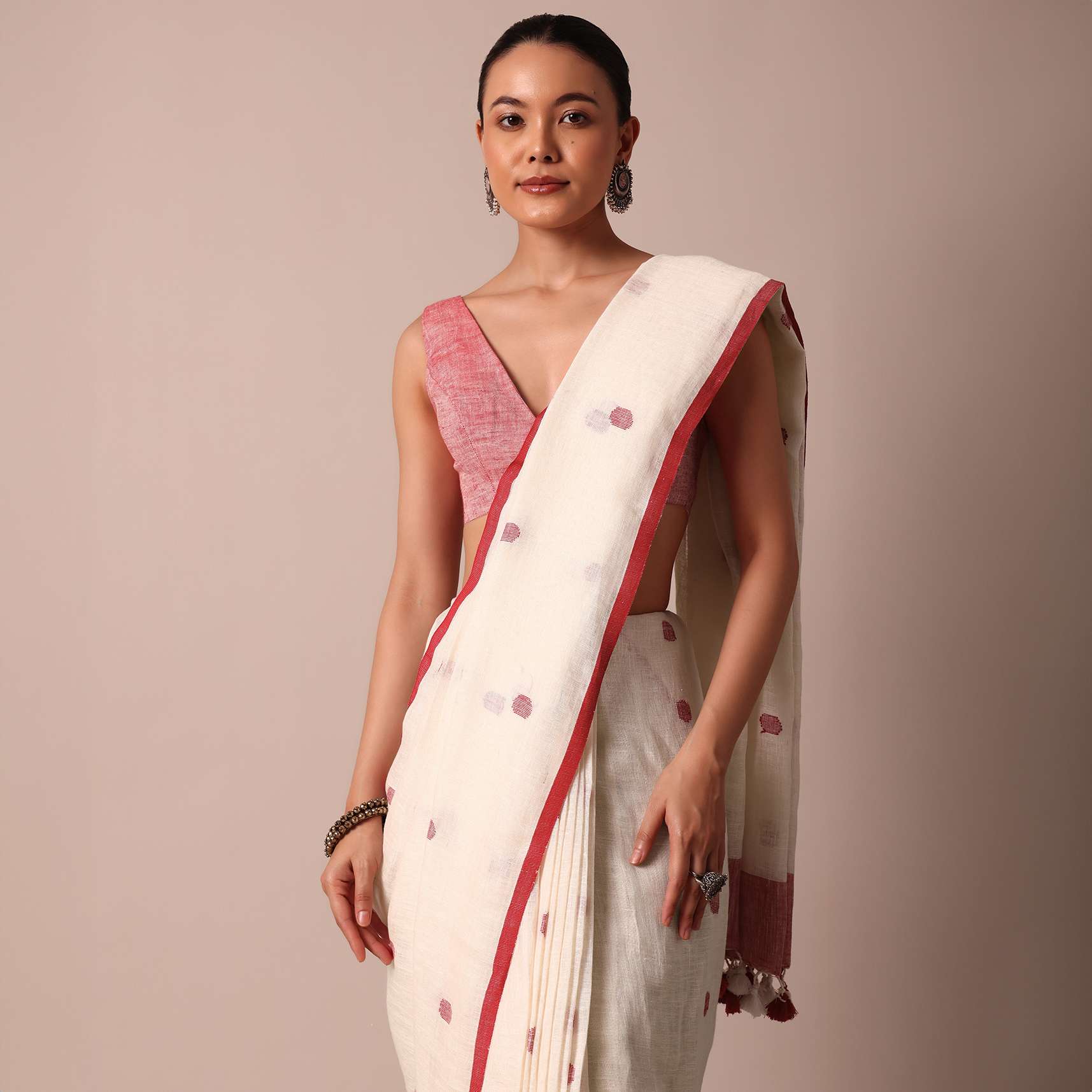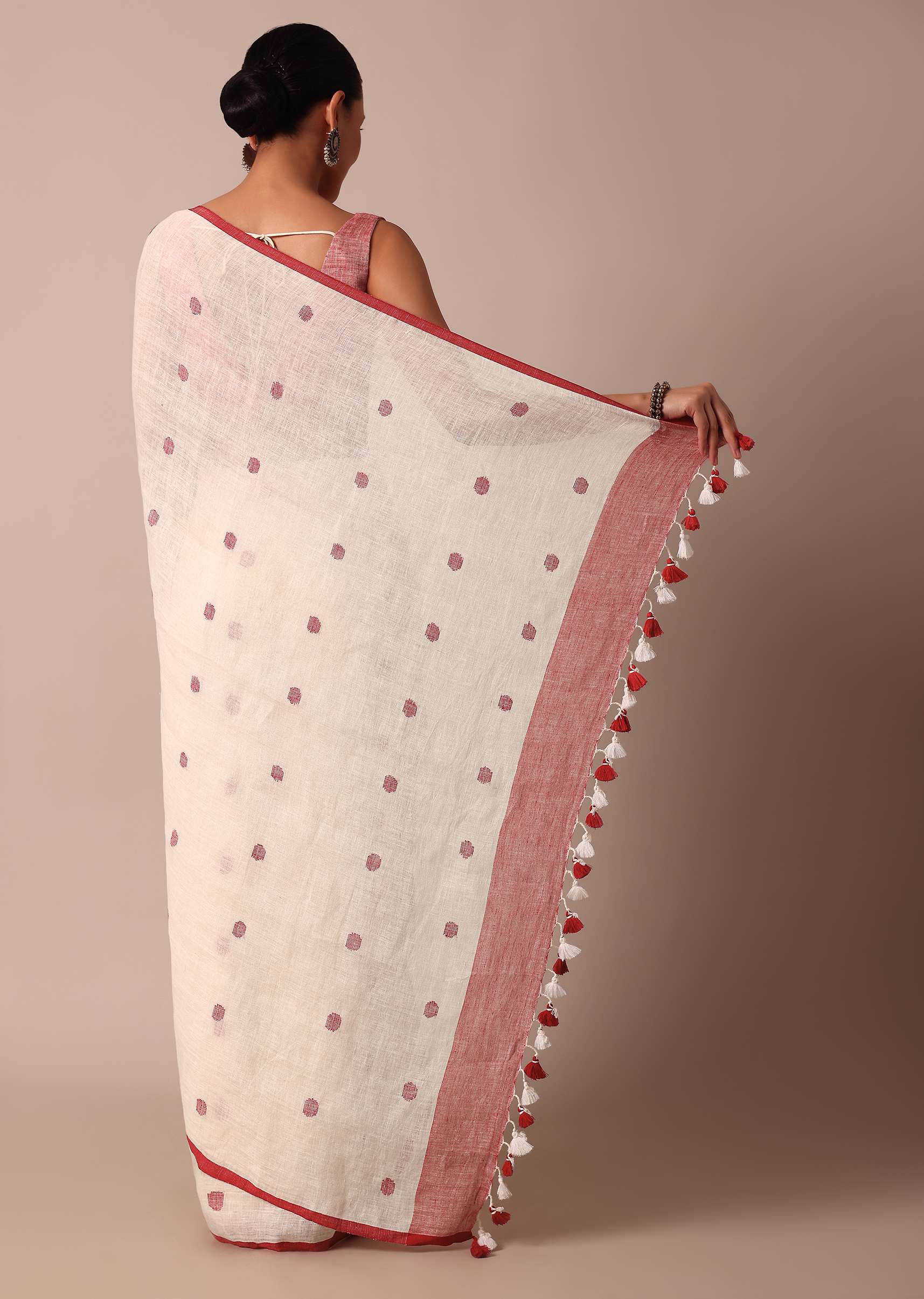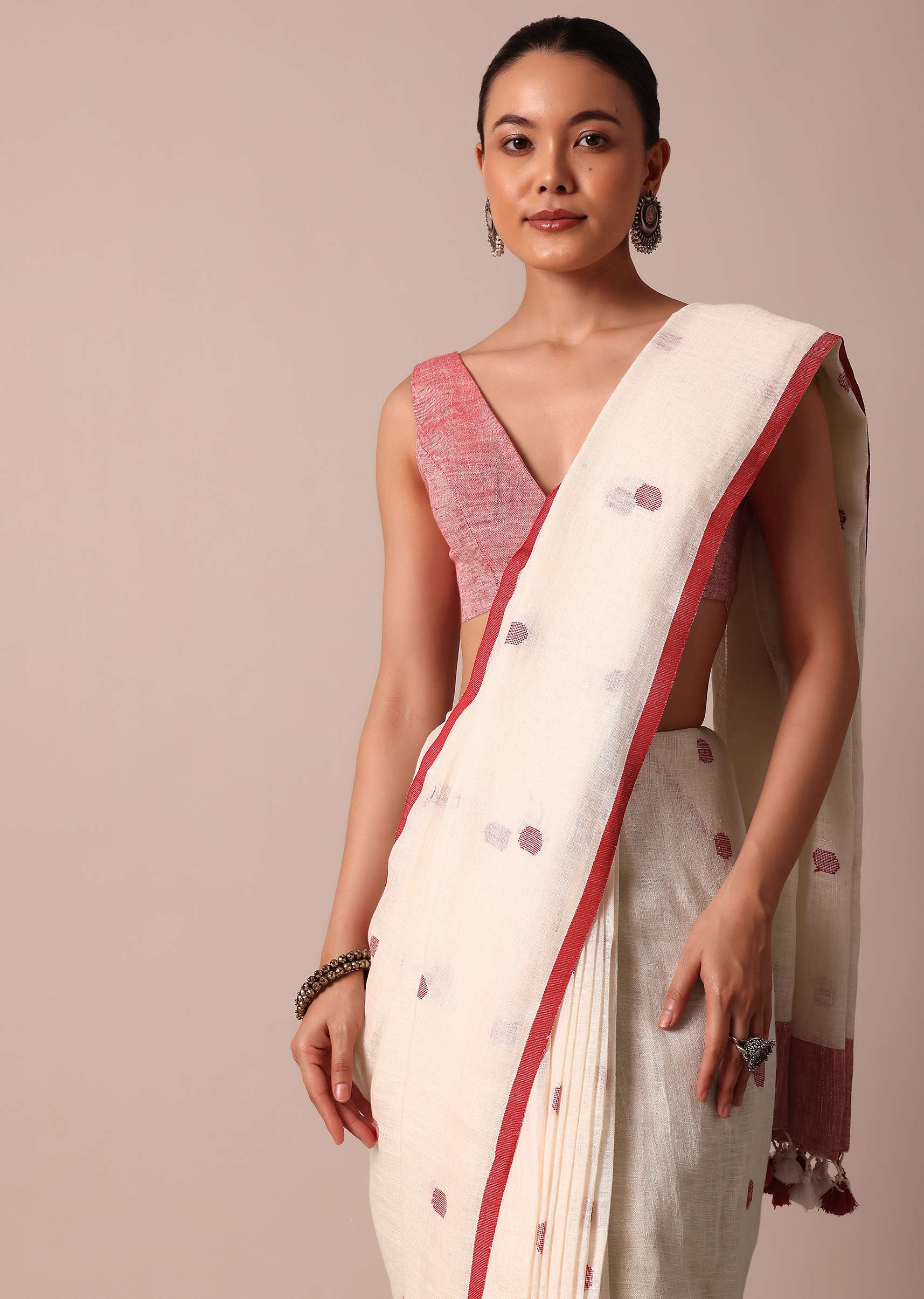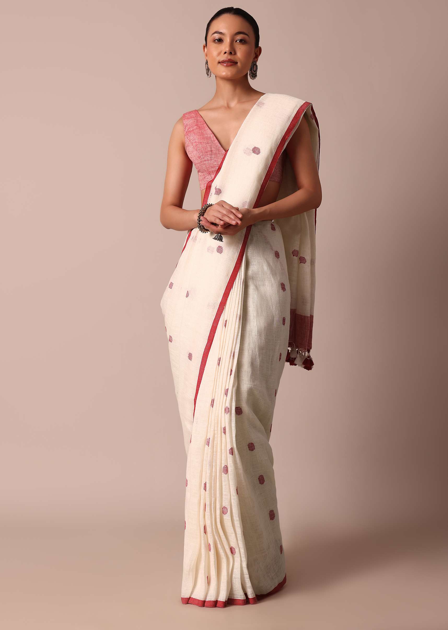 White Cotton Linen Saree With Red Polka Dots And Unstitched Blouse Piece