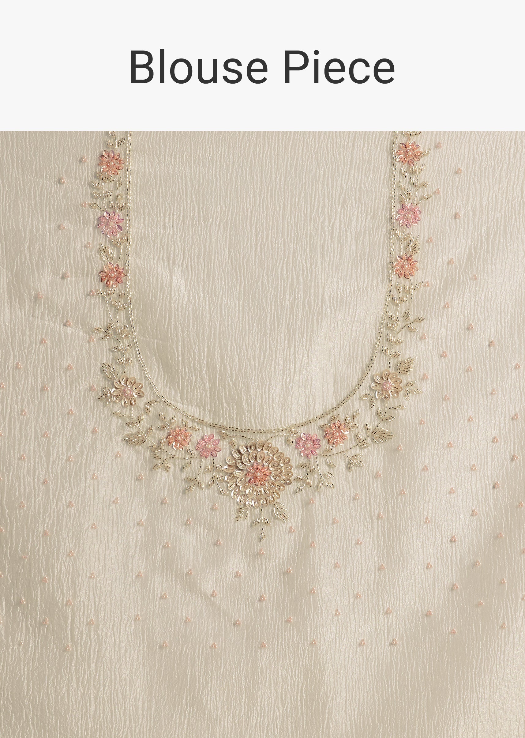 Drape yourself in sheer elegance with this white crushed tissue saree, a vision of delicate artistry and grace. Intricately adorned with floral embroidery, shimmering cutdana, and sequins, it exudes a soft radiance with every movement. The ethereal texture of the fabric enhances its fluid drape, making it a timeless piece for festive celebrations, intimate gatherings, and day-to-evening soirees Awarded as the Most Trusted Brand, we're delivering styles you love, just as promised.