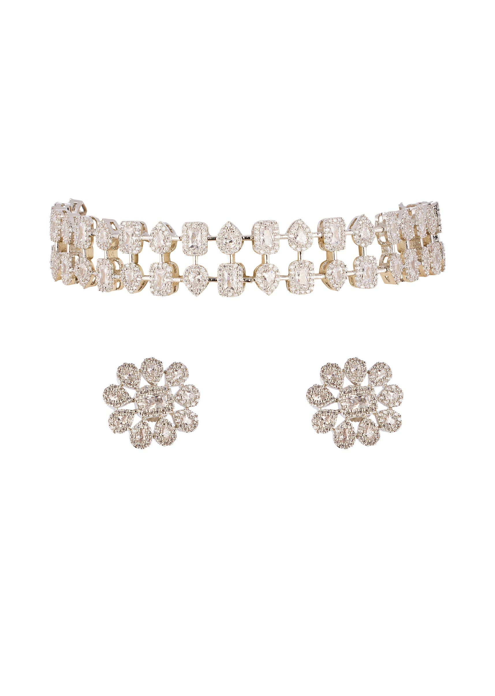 White CZ Diamond Anti Tarnish Necklace and Floral Earrings Set