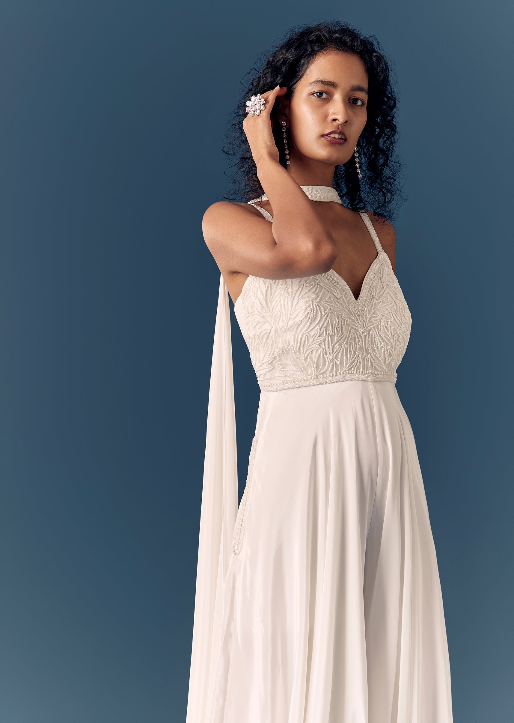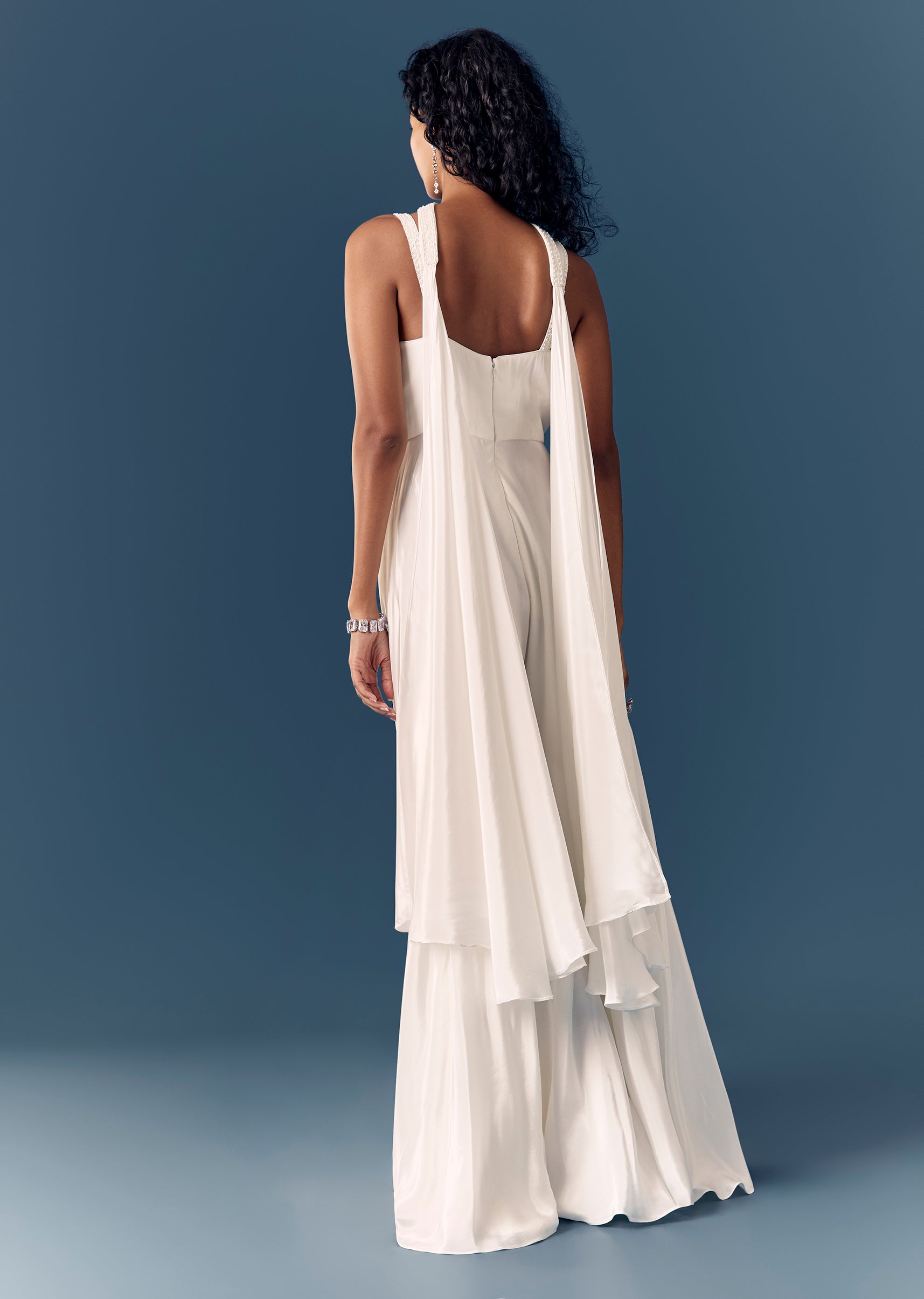 A modern festive white jumpsuit with moti and cut dana embellishment. Sleeveless with sweetheart neckline and a back zip closure, paired with a dupatta—perfect for reception and engagement events. Awarded... More Product Details