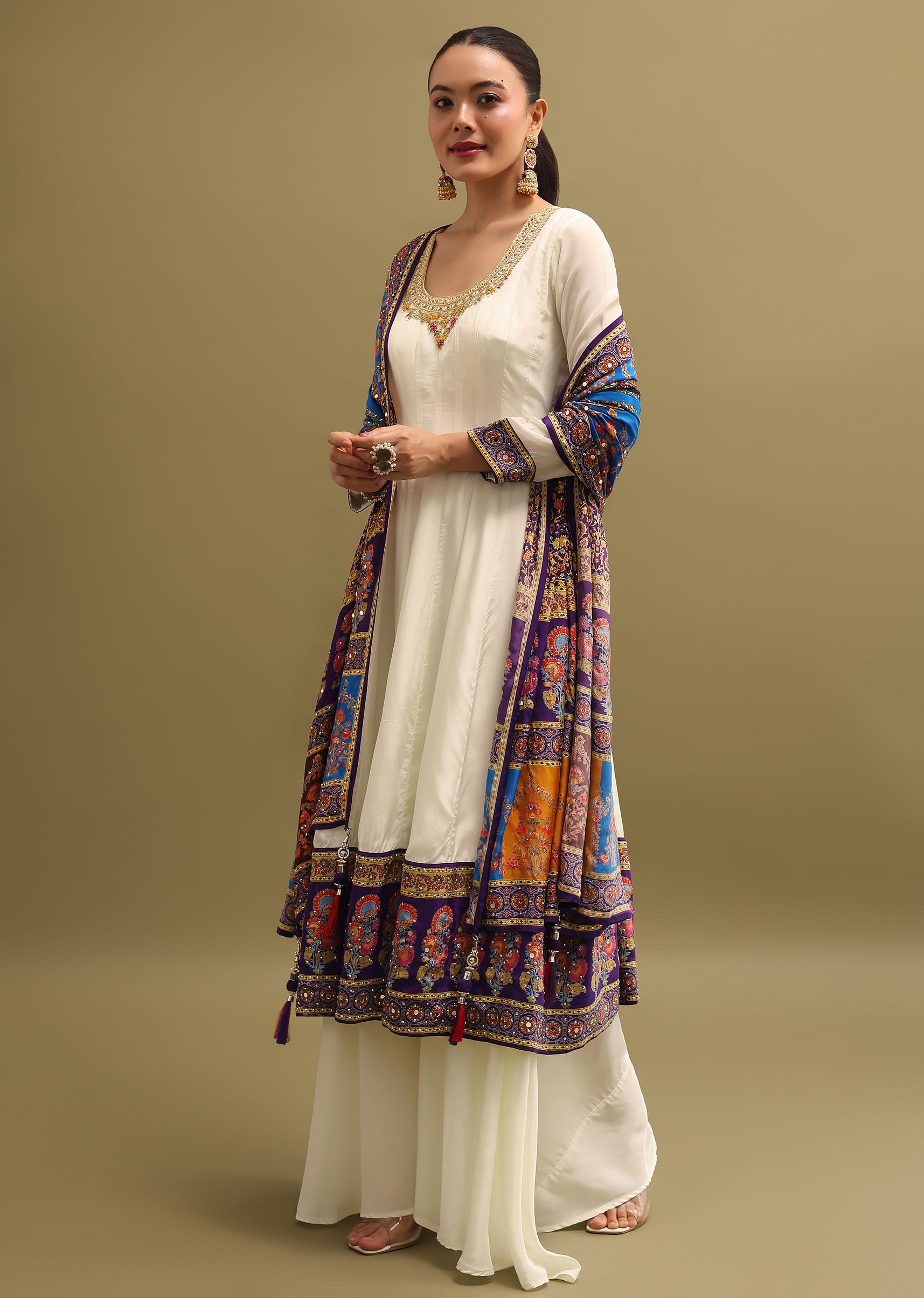 Indulge in elegance with our white Kurta and palazzo set, specially crafted for sangeet and mehendi celebrations. This ensemble is tailored from crepe and embellished with prints, cut dana, mirrors,... More Product Details
