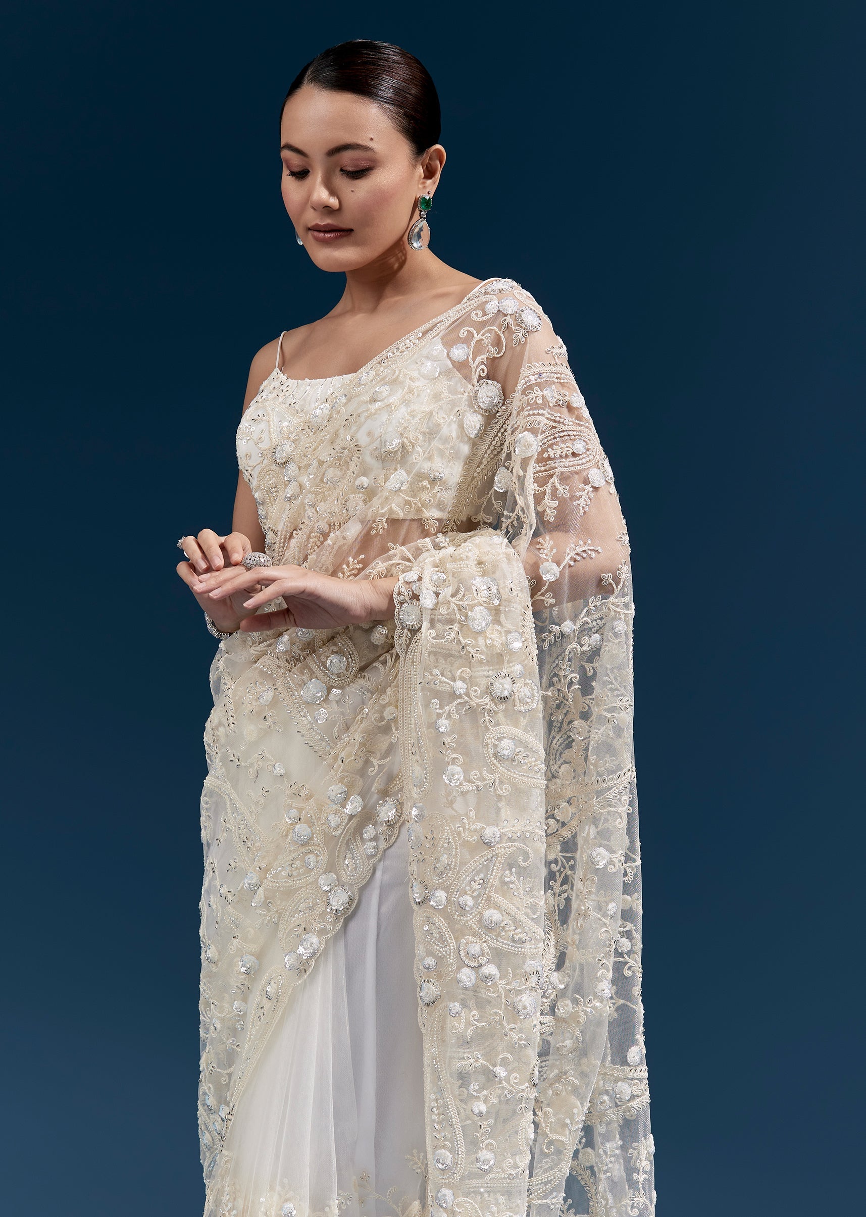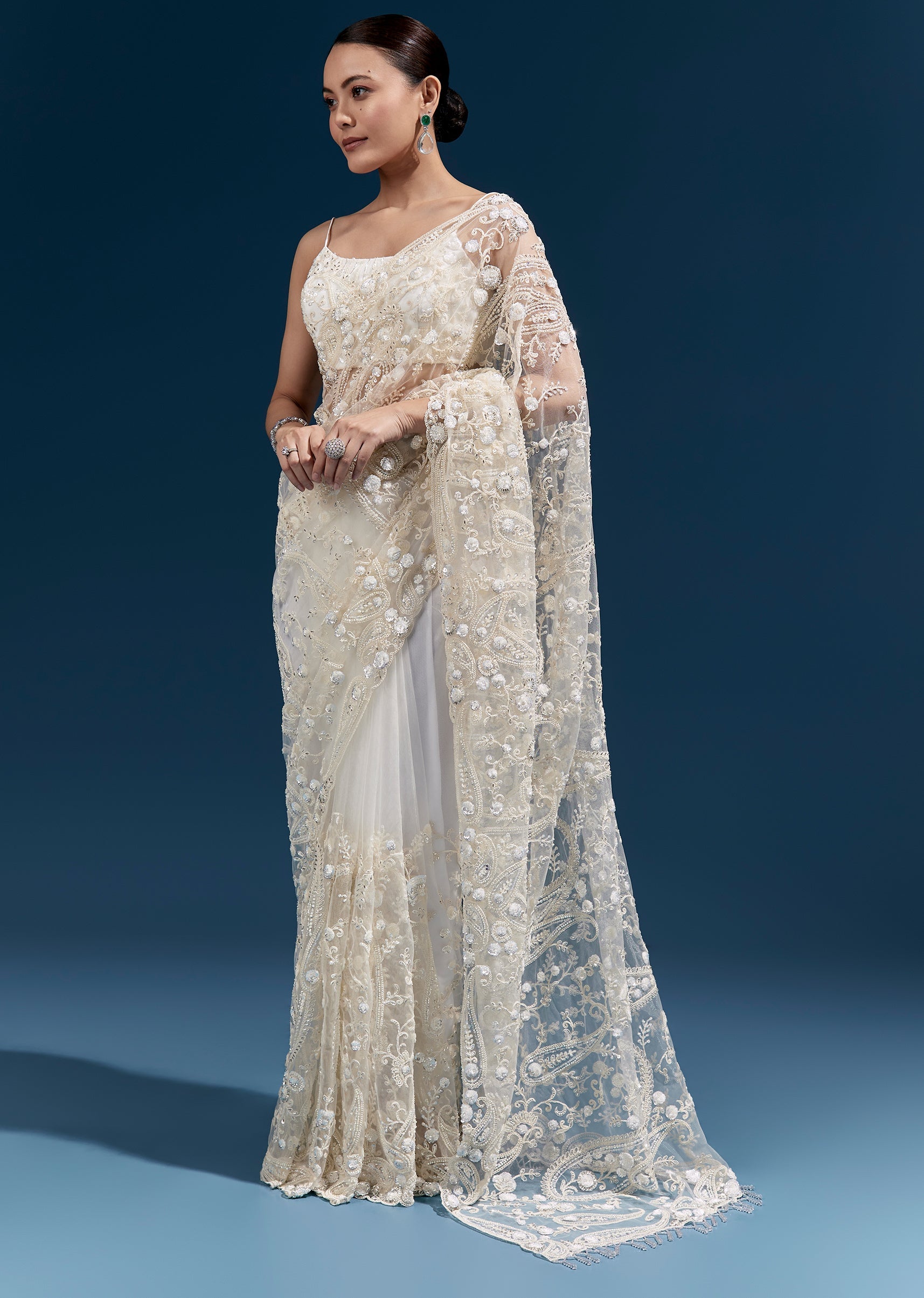 This white net saree features heavy floral embroidery with cutdana, sequins and beads all over, finished with tassels at the pallu end. A stunning pick for mehendi, engagement, sangeet and... More Product Details