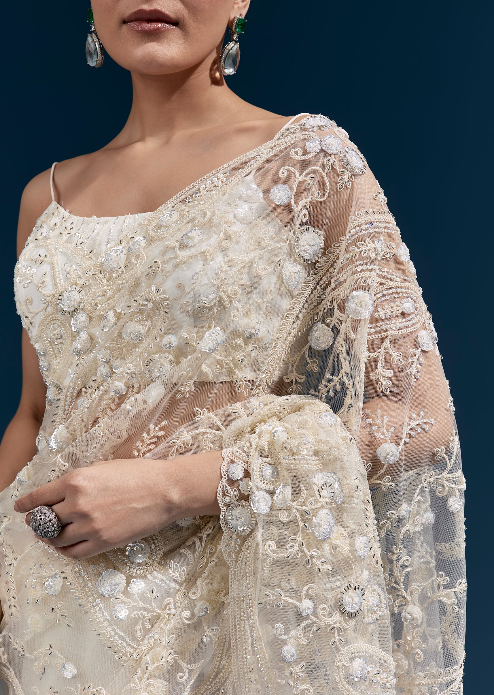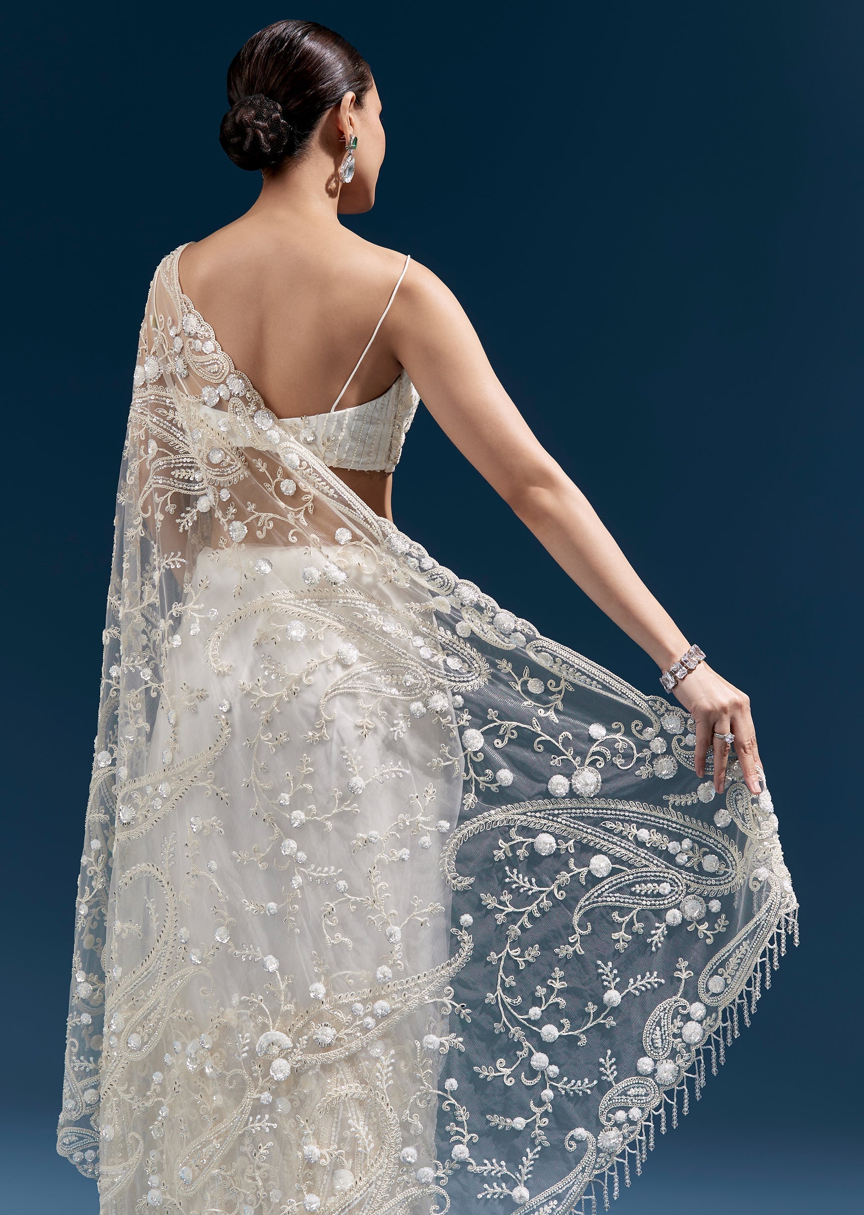 This white net saree features heavy floral embroidery with cutdana, sequins and beads all over, finished with tassels at the pallu end. A stunning pick for mehendi, engagement, sangeet and reception looks with an elevated glam feel. Awarded as the Most Trusted Brand, we're delivering styles you love, just as promised.
