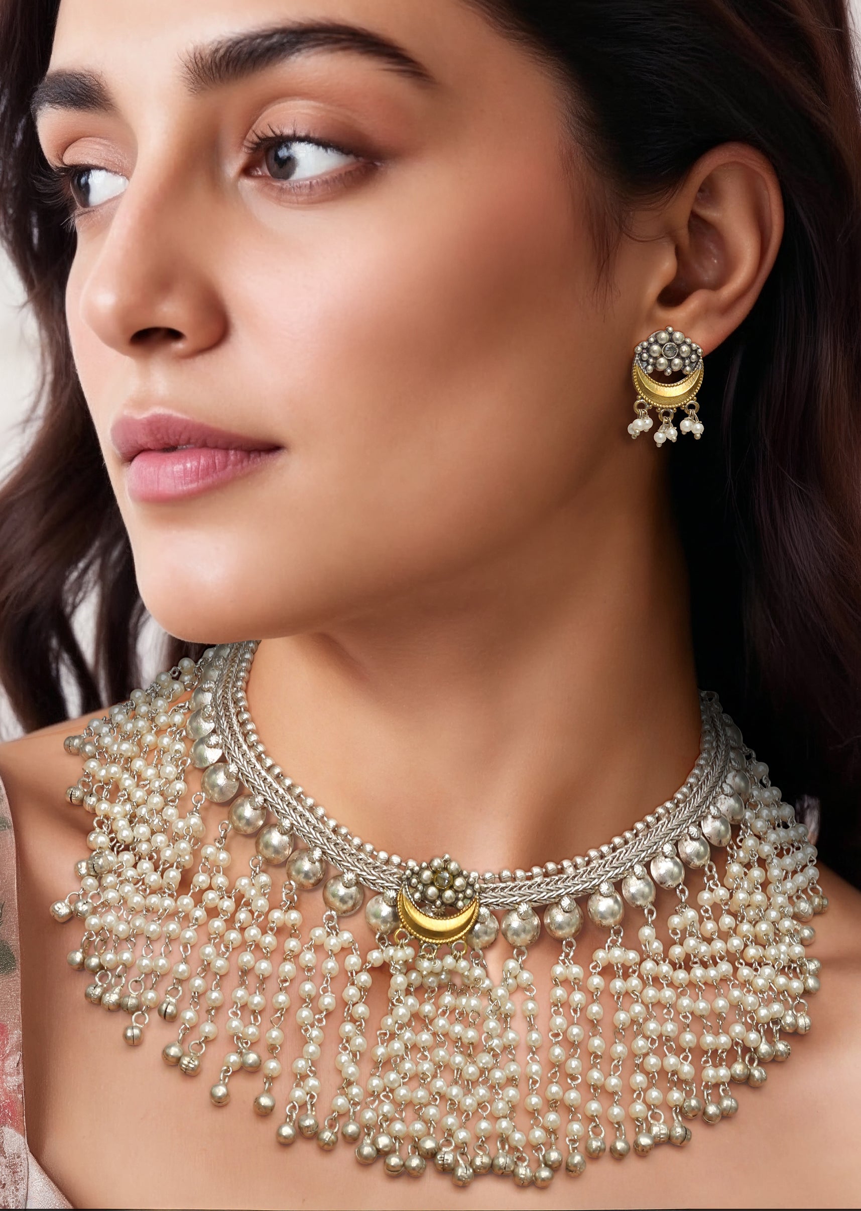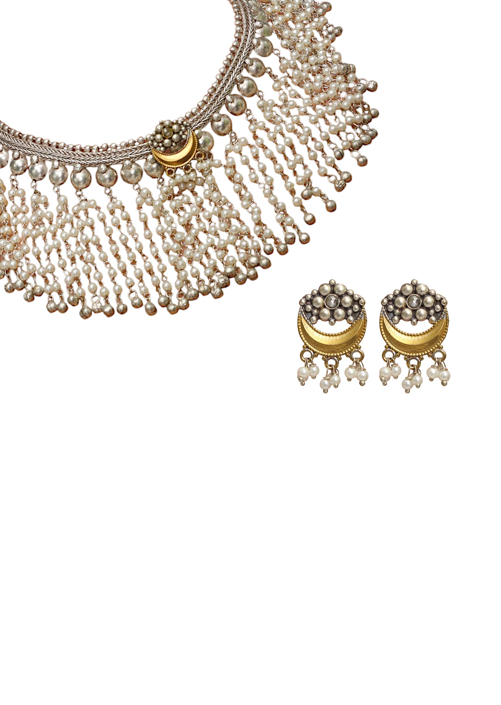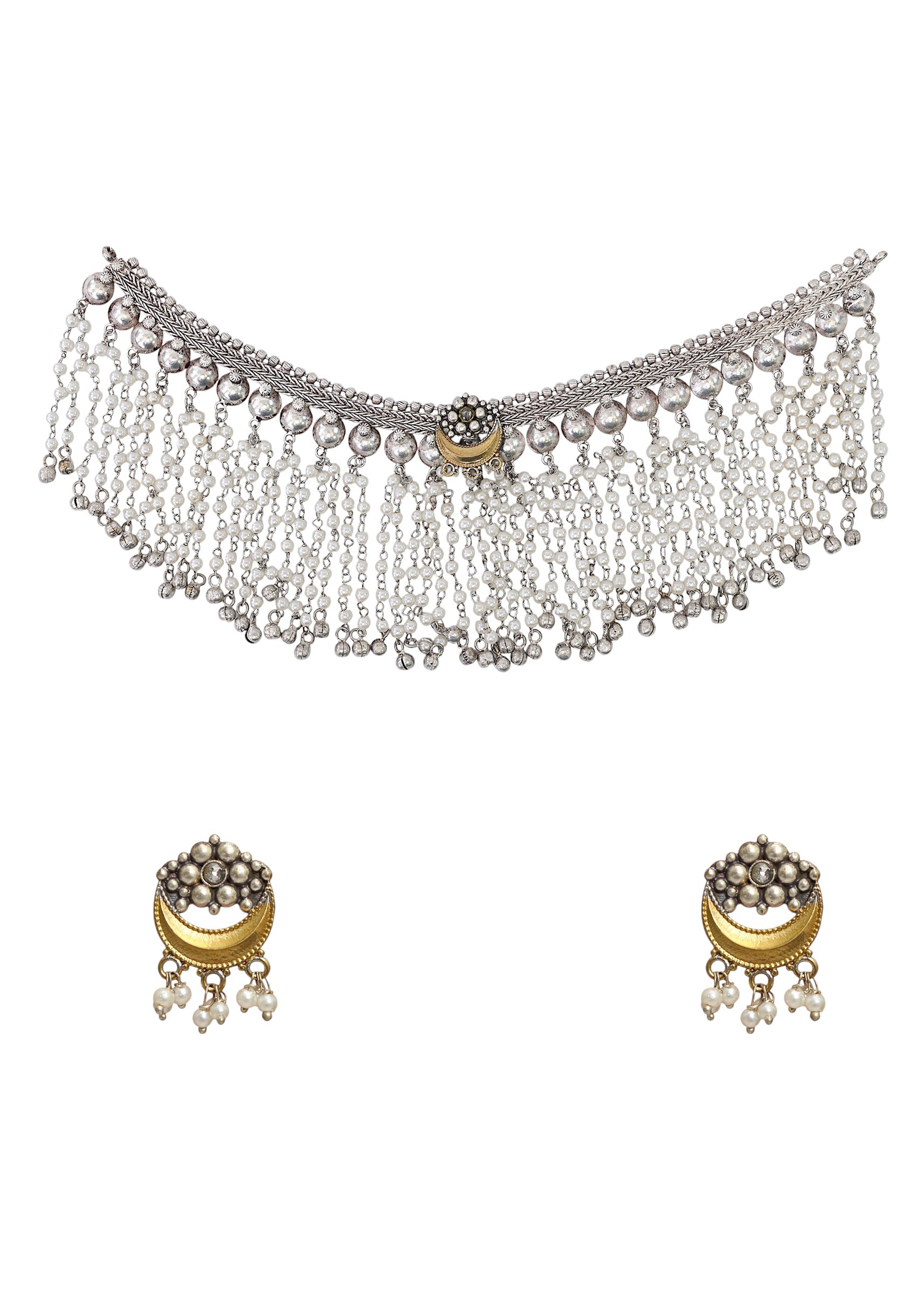 A white fusion tassel necklace and earring set featuring delicate tassels and intricate detailing, blending contemporary style with traditional charm. Perfect for adding a chic and playful touch to bridal,... More Product Details