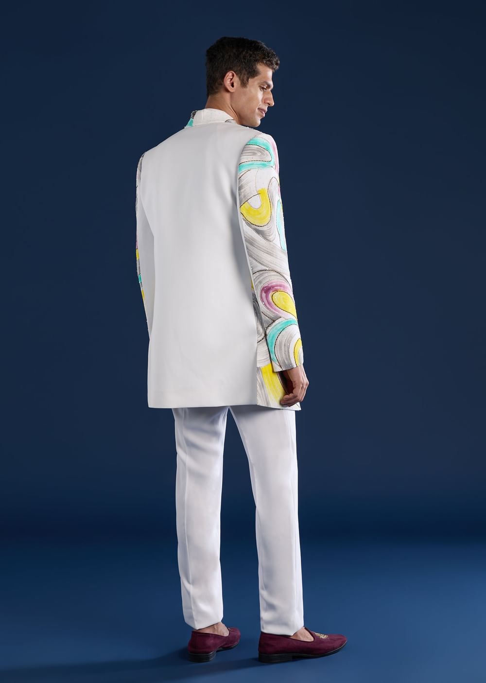 Artful and fresh, the look comes together when this white men’s indo western set in suiting fabric leads the event. Hand painted detailing meets intricate salli pearl and cutdana sequins... More Product Details