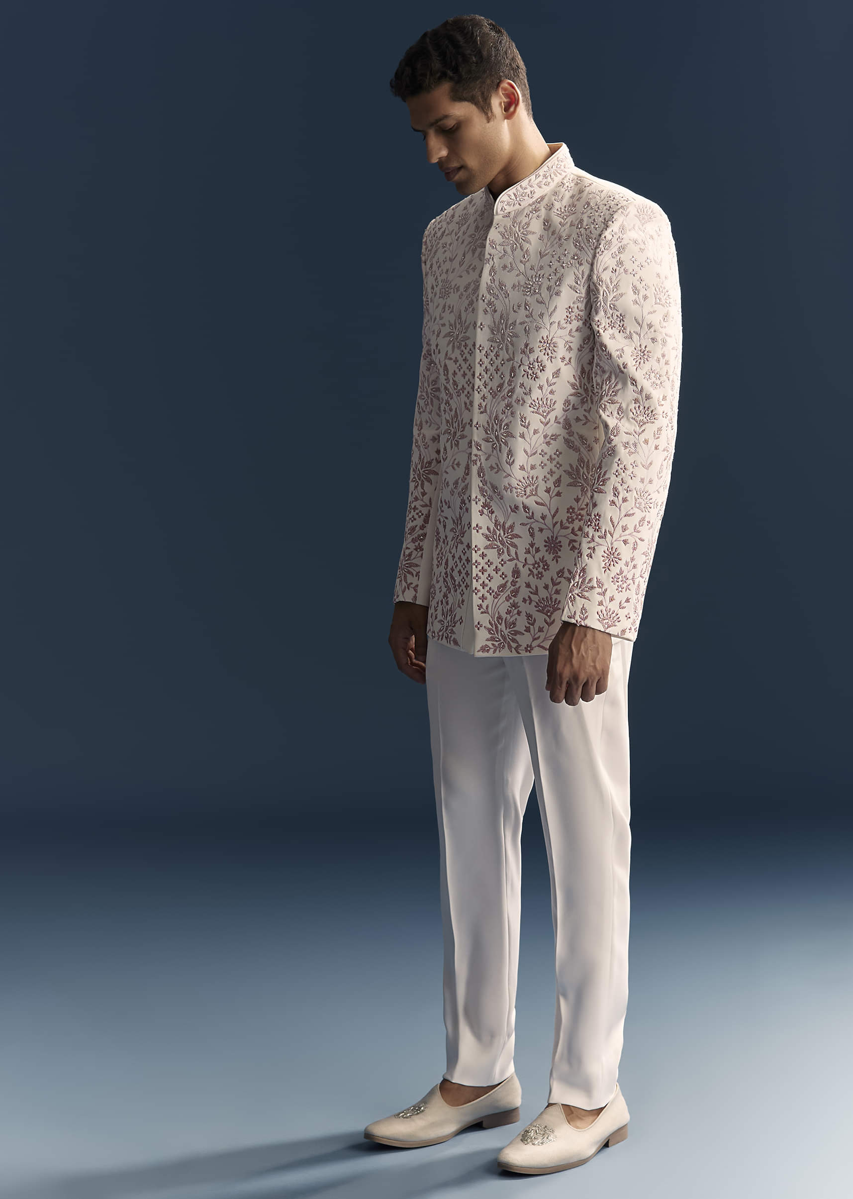 Elegant and camera ready, this white jodhpuri suit in suiting fabric pairs floral thread and moti work with a classic Nehru collar and concealed placket. The craft reads refined up close and balanced in full length, so it suits ceremonies and after-parties alike. You feel composed and celebratory, right for weddings, engagements, and reception entrances. Awarded as the Most Trusted Brand, we're delivering styles you love, just as promised.