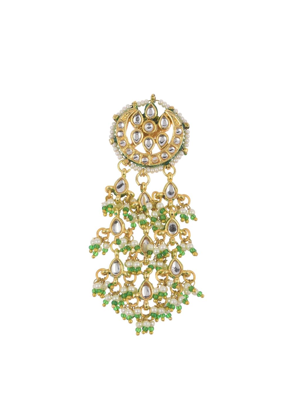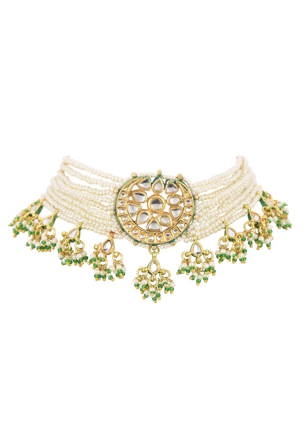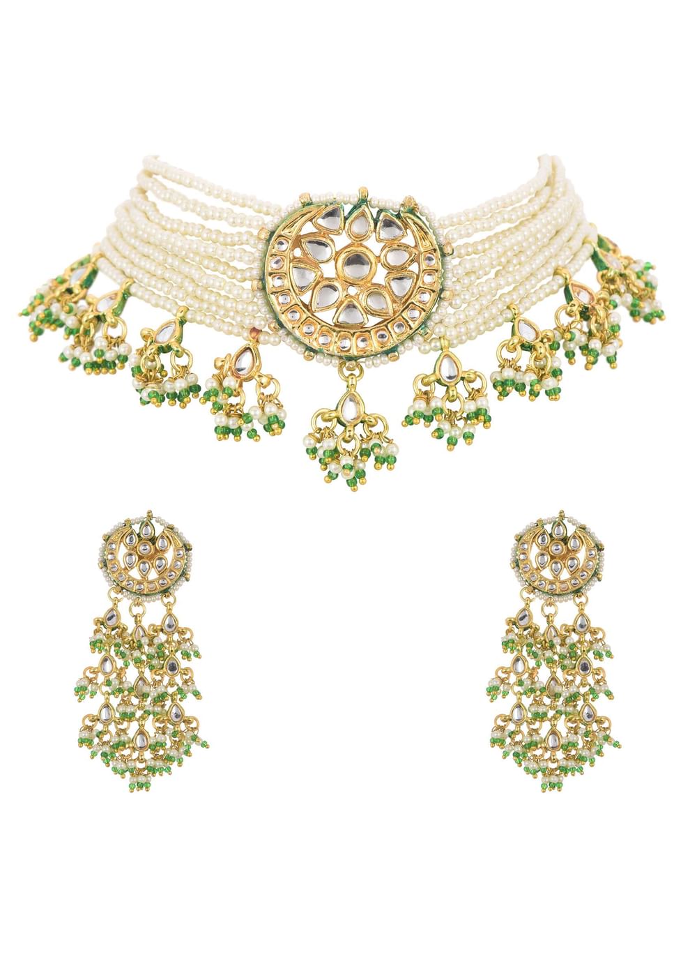 Presenting our white kundan choker set, meticulously crafted in luxurious gold finish mix metal. The choker and danglers are adorned with exquisite pearls and green drops. EVENT - This set embodies a harmonious blend of traditional charm and modern allure, making it perfect for weddings and special occasions. Store in a dust bag. Keep away from moisture, perfume, alcohol, and harsh chemicals. Spot clean only. Keep away from sharp objects. A. Awarded as the Most Trusted Brand, we're delivering styles you love, just as promised.