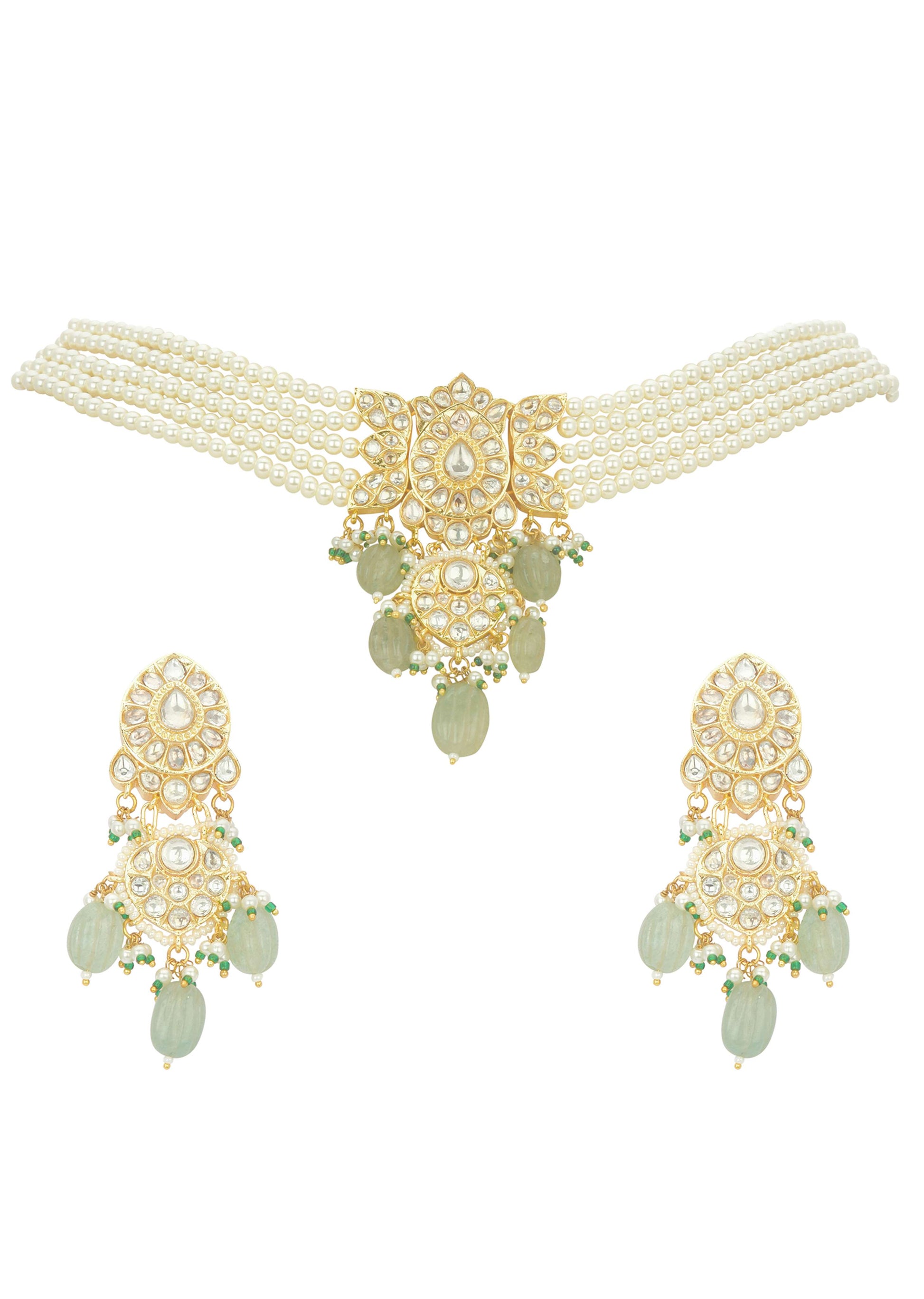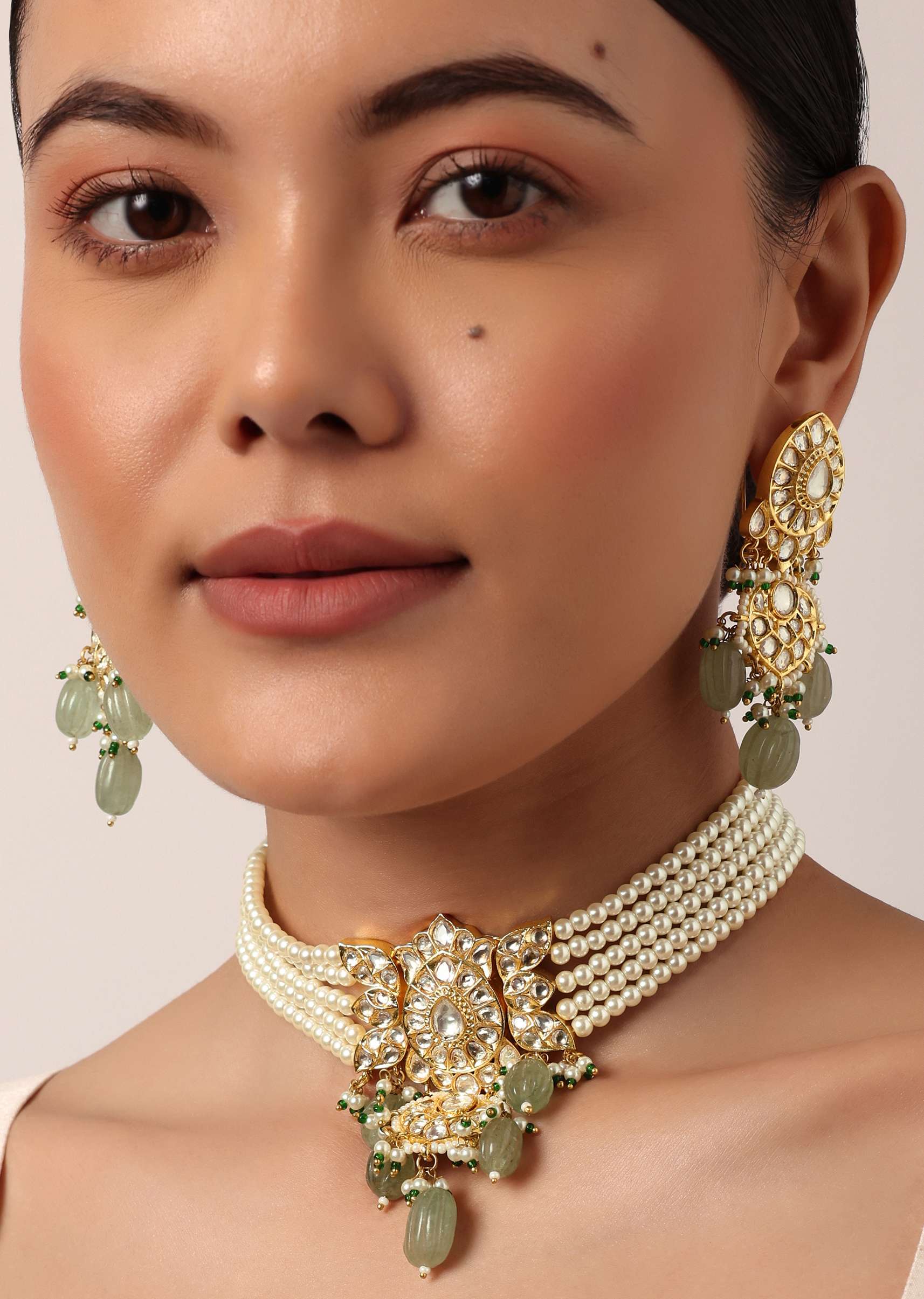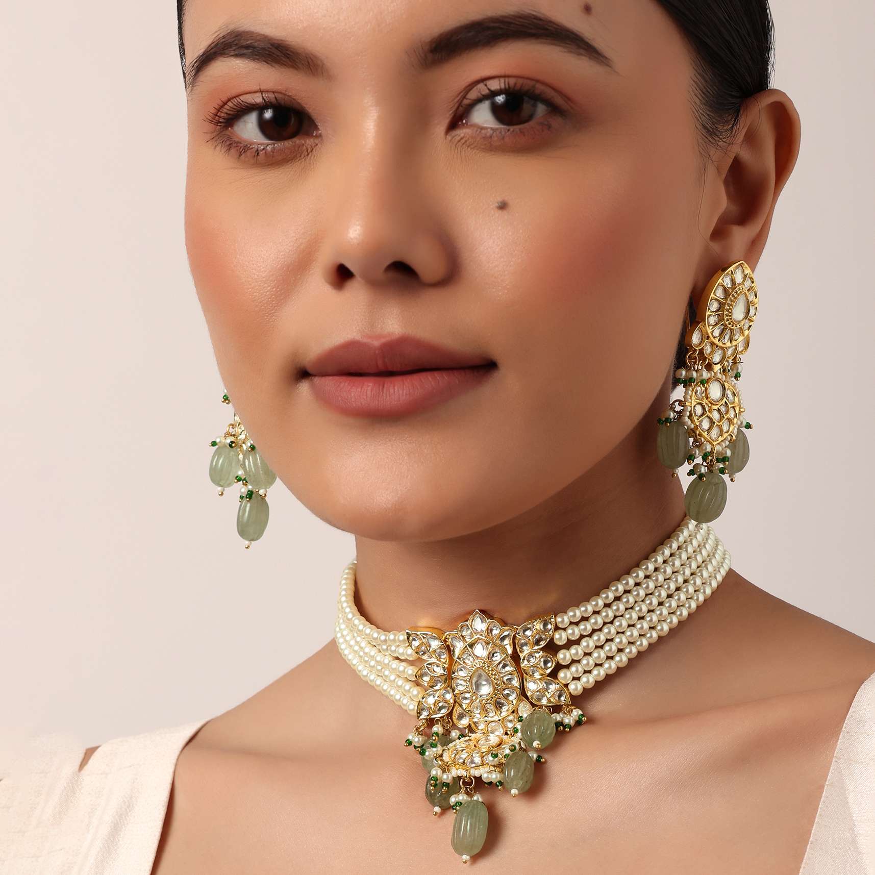 Displaying a beautiful design, this statement choker set will elevate all your ethnic outfits. Adorned with a string of glistening pearls, it flaunts an exquisite motif pendant. Embedded with white kundan stones, the cluster bead drops add to it stylish allure. Paired with matching danglers, don this set to steal the spotlight.Avoid contact with water, chemicals, harsh liquids, perfumes, etc.Do not wear this piece of jewelry while showering, gymming, swimming, etc.Please keep the product away from moisture and humidity when not in use. Awarded as the Most Trusted Brand, we're delivering styles you love, just as promised.