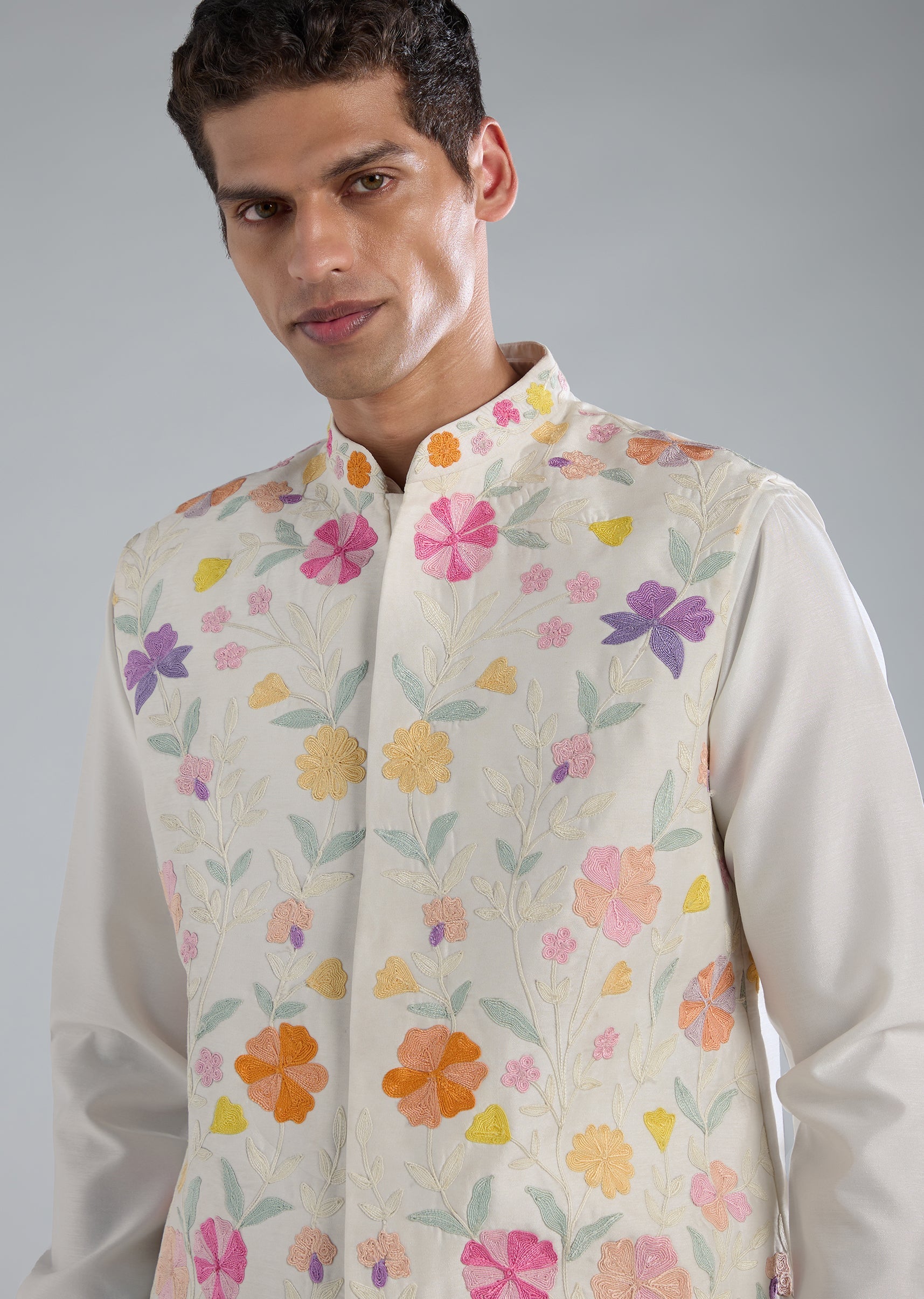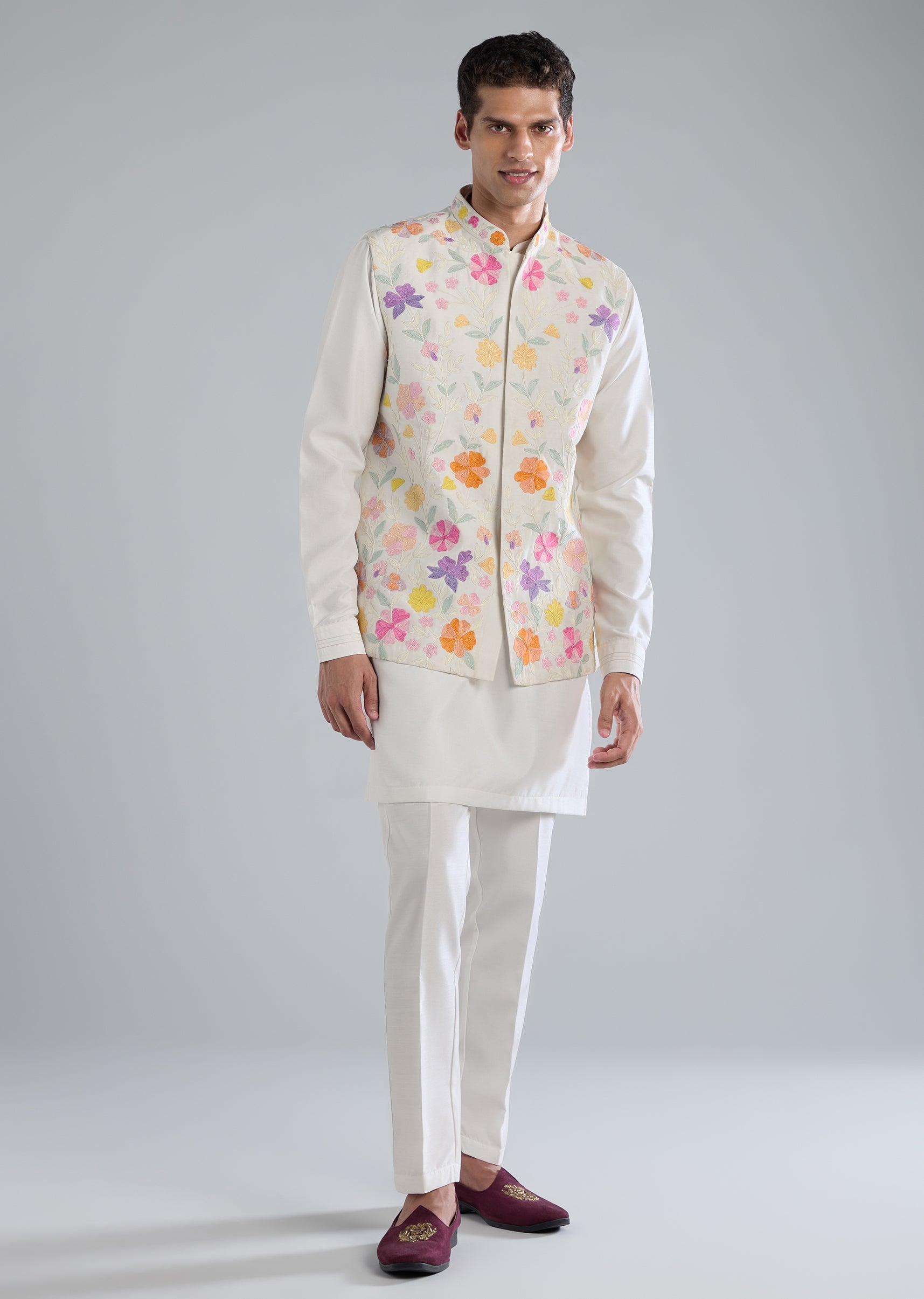Elegant and serene, this white kurta jacket set crafted in smooth silk fabric is perfect for festive haldi functions and wedding guest dressing. The jacket is adorned with delicate dori... More Product Details