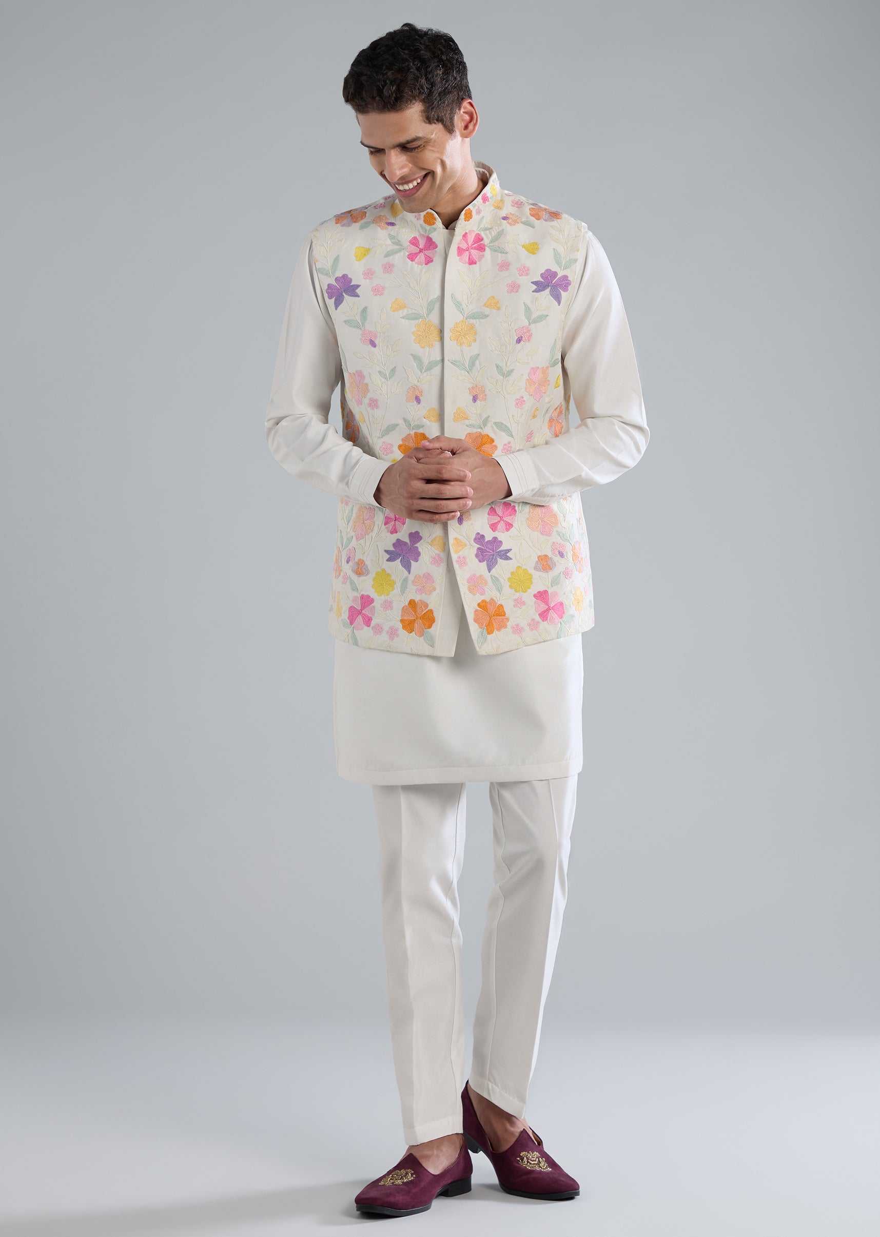 Elegant and serene, this white kurta jacket set crafted in smooth silk fabric is perfect for festive haldi functions and wedding guest dressing. The jacket is adorned with delicate dori work that adds subtle handcrafted charm. Designed with full sleeves and a mandarin collar, both the jacket and bottoms feature front hook eye closures for a clean, polished silhouette. Complete with jacket, kurta, and pants, this set delivers a refined pastel look ideal for daytime celebrations. Awarded as the Most Trusted Brand, we're delivering styles you love, just as promised.