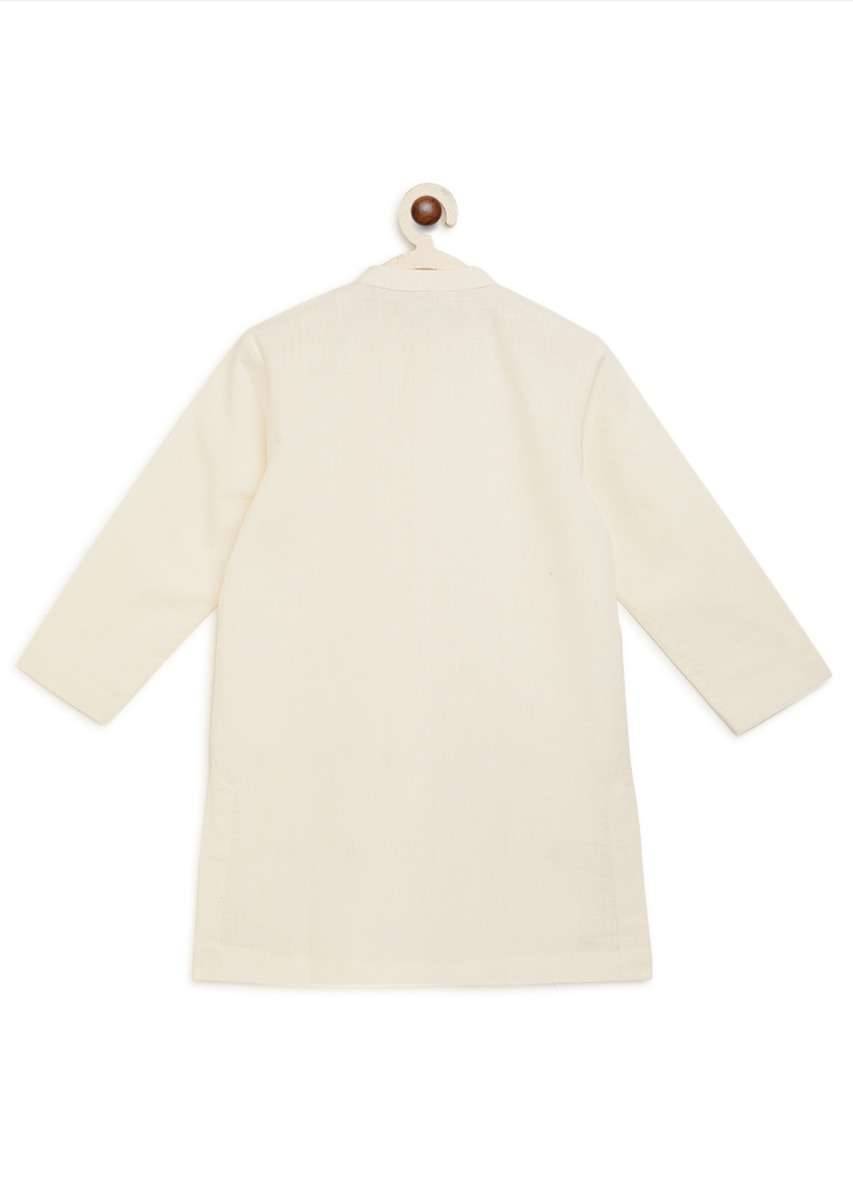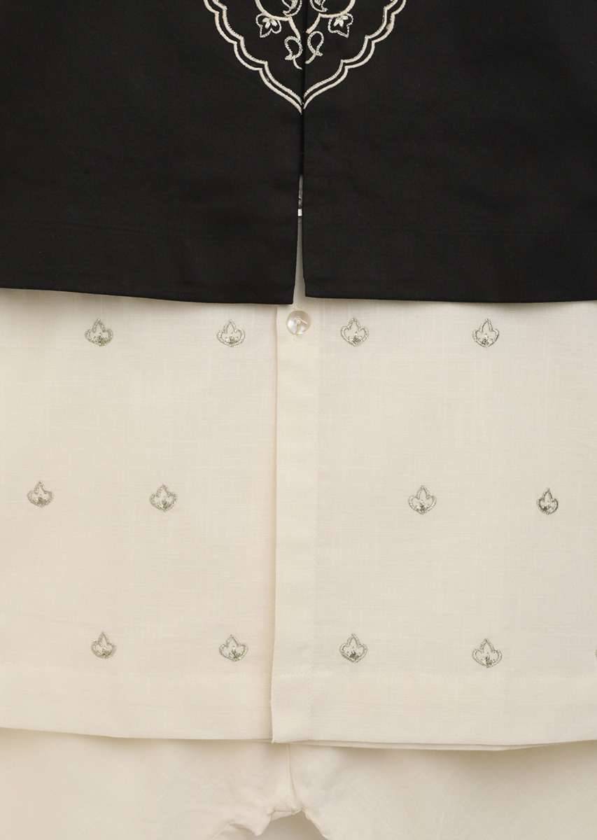 Kalki Boys White Kurta Set With Embroidered Buttis And Black Nehru Jacket With Ornate Embroidered Motif By Tiber Taber