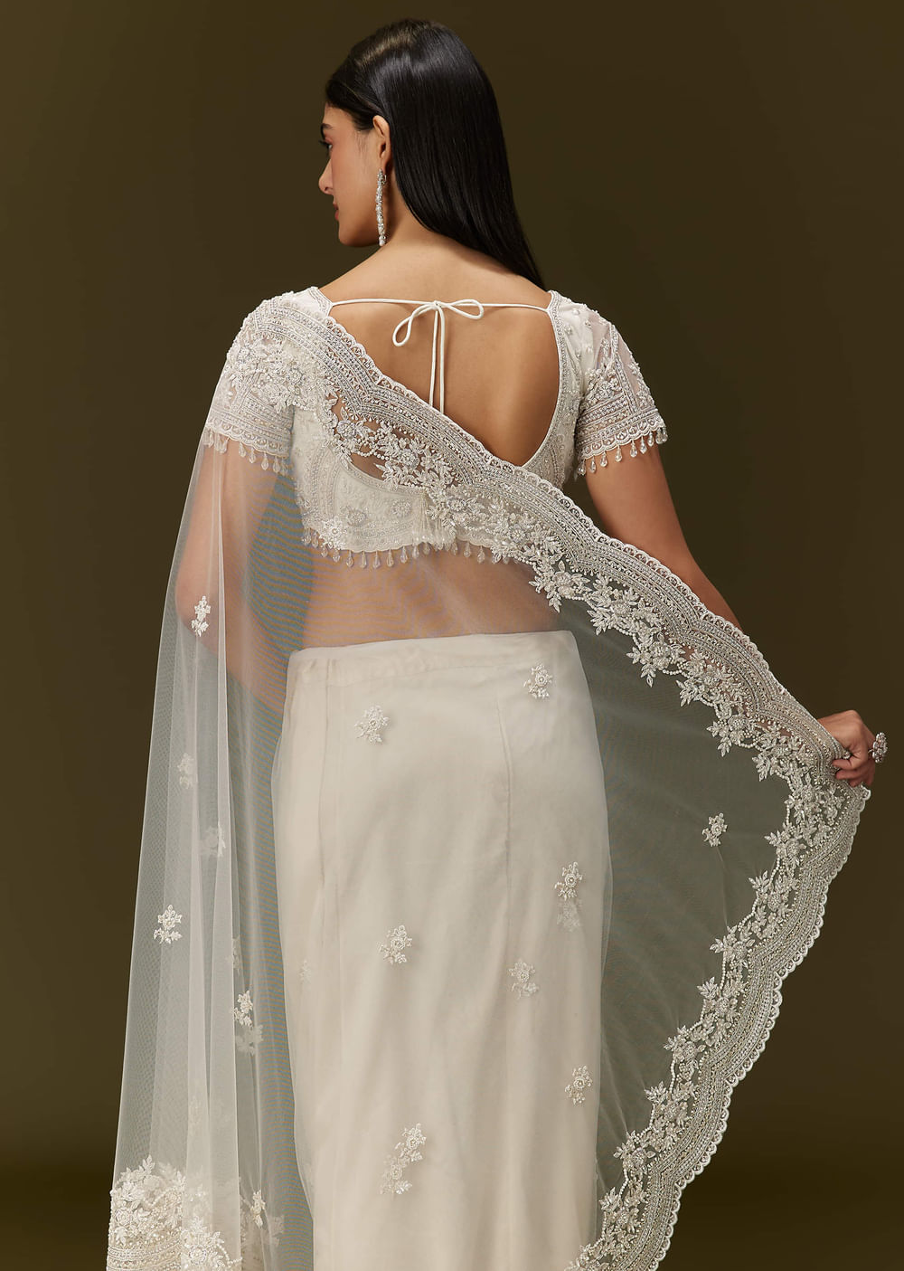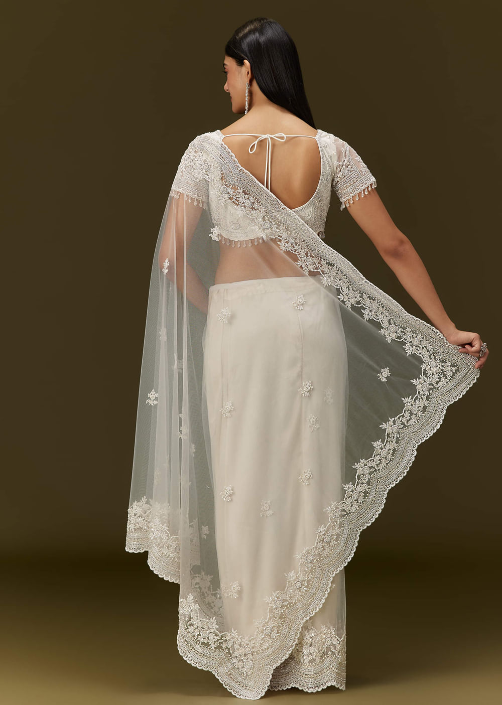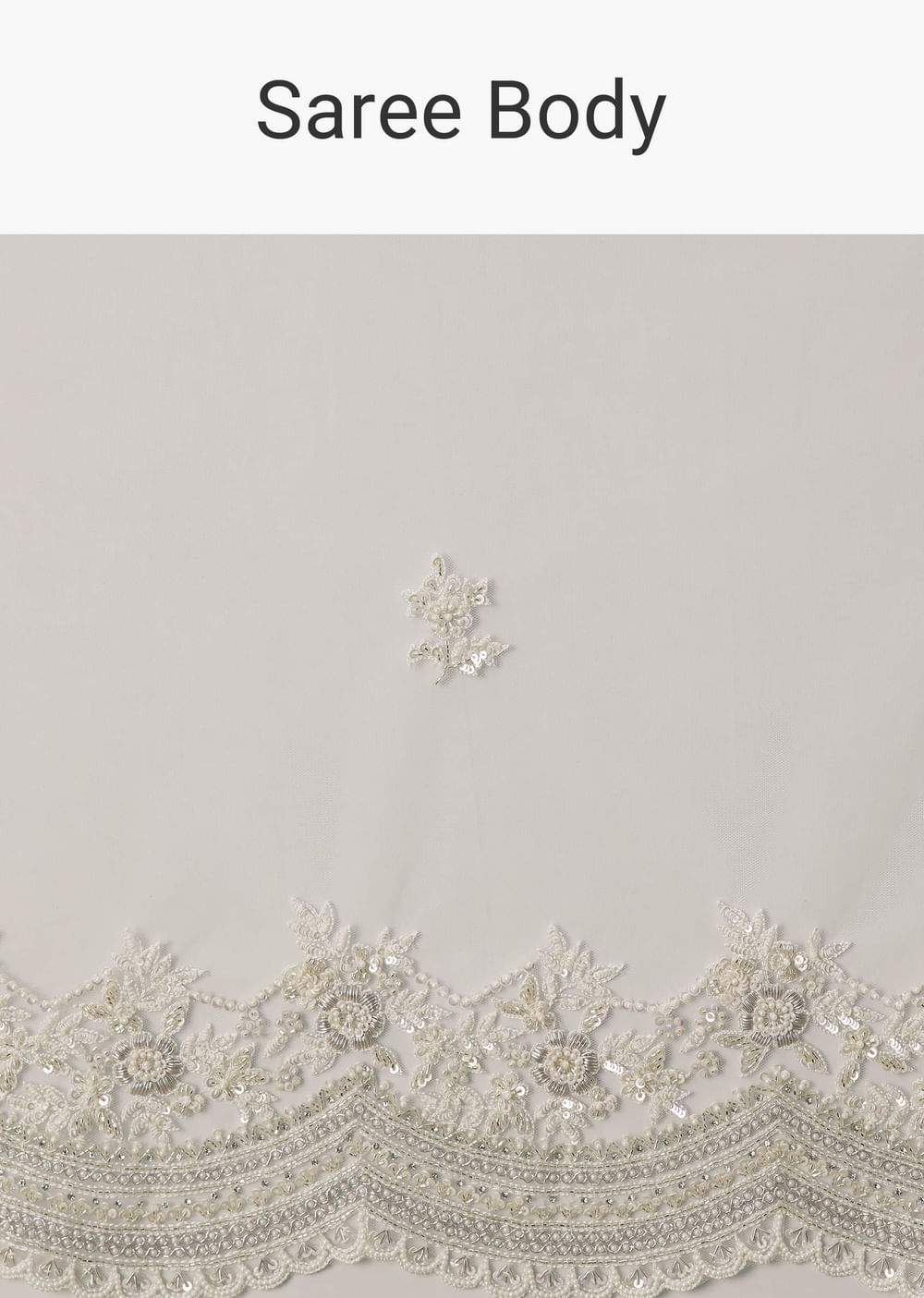 This white net saree is an ode to subtle opulence. Its detailed embroidery creates a lace-like texture that’s both graceful and statement-worthy. Awarded as the Most Trusted Brand, we're delivering styles you love, just as promised.