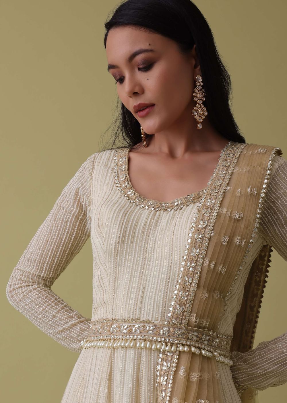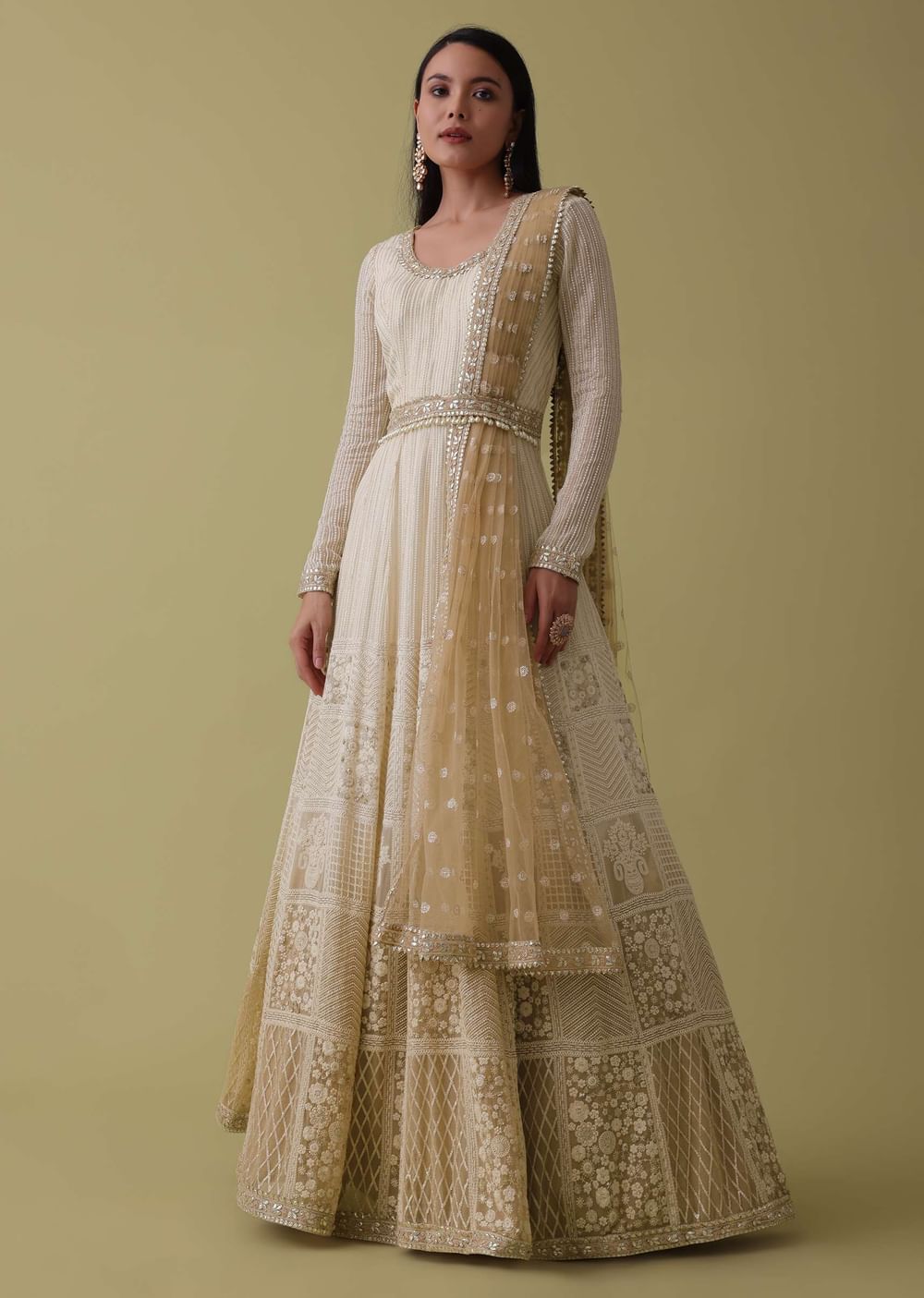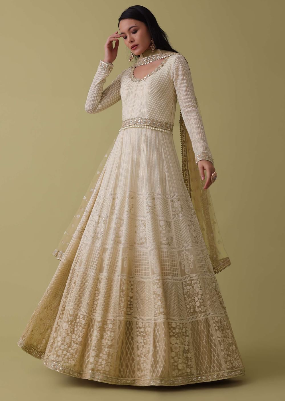 White Ombre Georgette Anarkali Suit Set With Lucknowi Embroidery