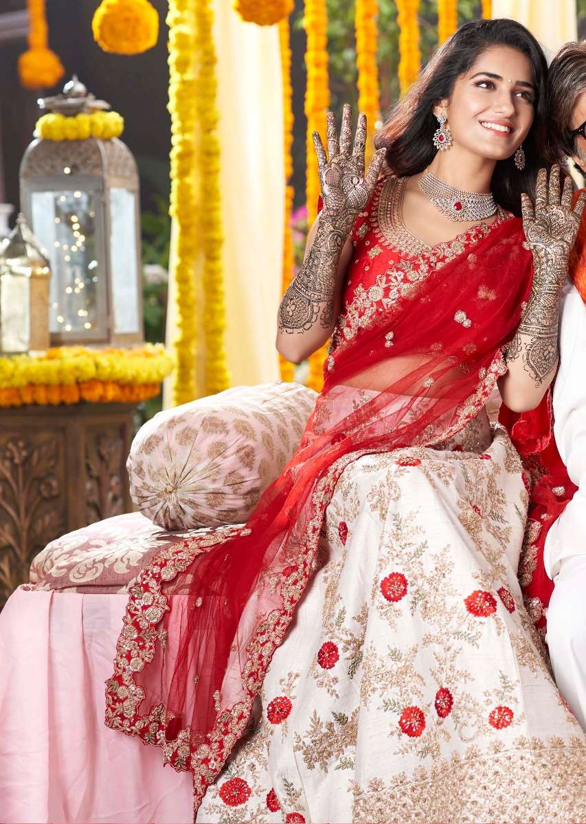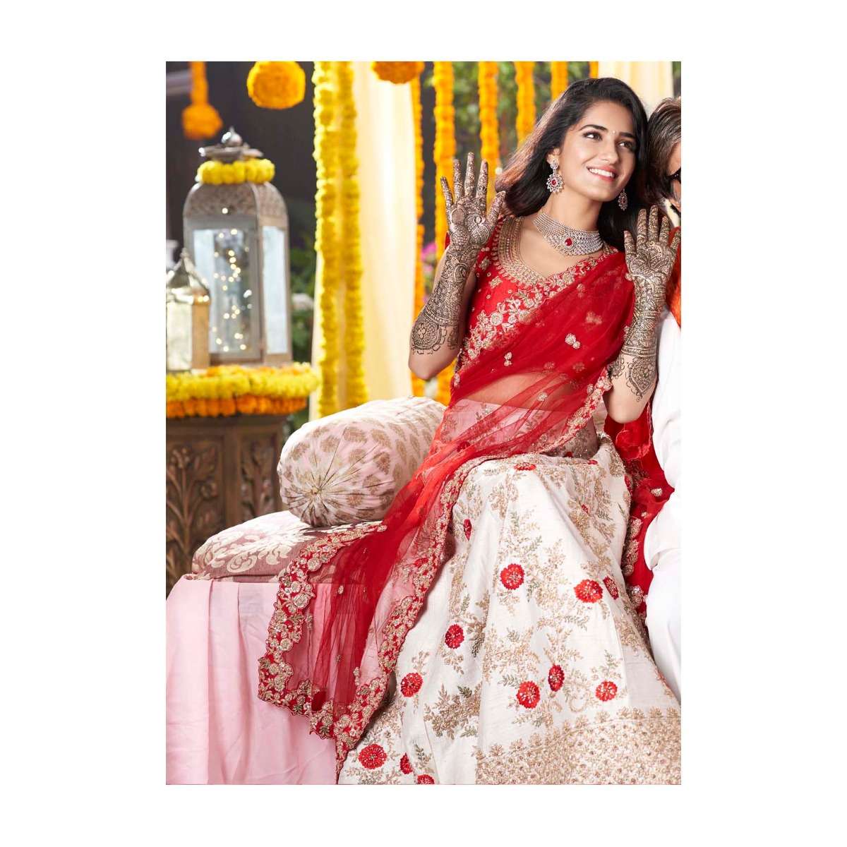 White raw silk lehenga featuring in floral jaal embroidery. Embellished in cut dan, resham, sequins and french knot embroidery. Paired with contrasting red raw silk blouse with mirror, lace and thread work in embroidery and butti.It comes with a red net dupatta in floral embroidery and butti. Awarded as the Most Trusted Brand, we're delivering styles you love, just as promised.