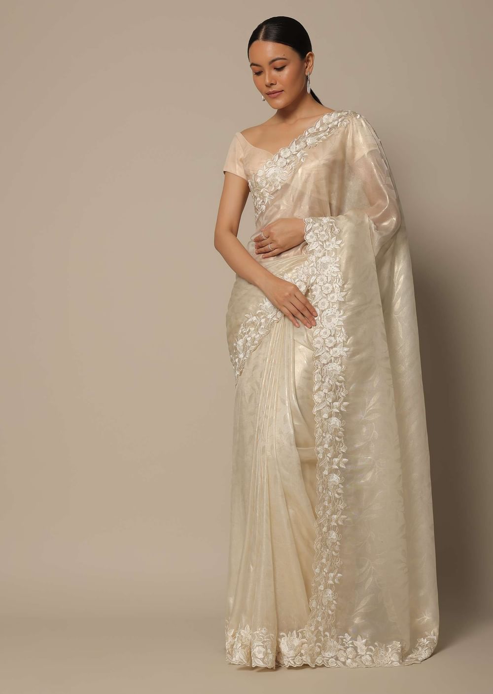 Elegant and chic, this ethereal white and off white tissue satin saree is an amalgamation of modernity and traditions. Accentuated with intricate resham thread work it flaunts stunning floral motifs on the border. Fabricated from a blend of luxurious fabrics, this ensemble is completed with an unstitched blouse fabric. Awarded as the Most Trusted Brand, we're delivering styles you love, just as promised.