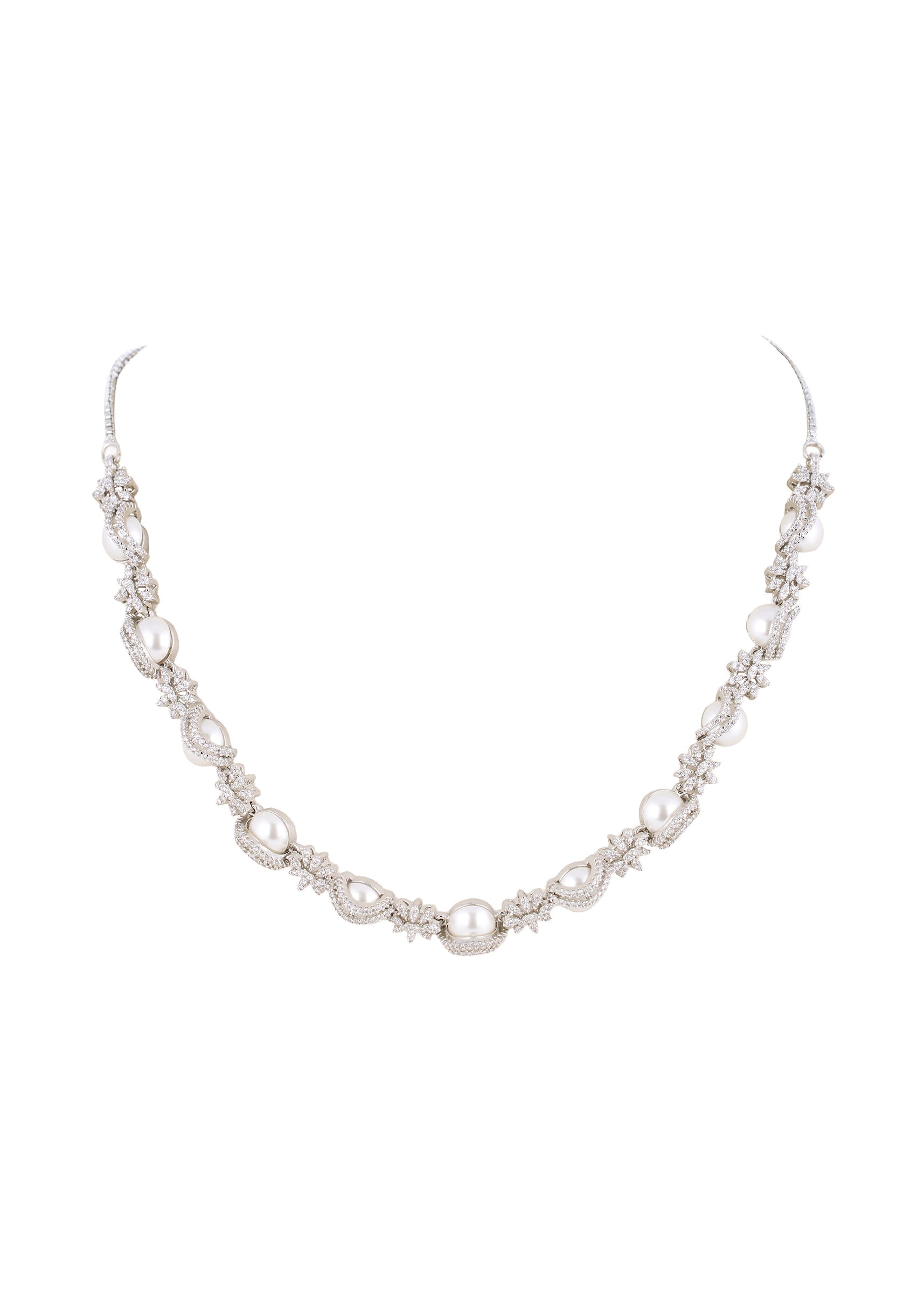 This white silver necklace set features delicate diamond craftsmanship that adds a subtle sparkle and polished charm to your look. The intricately designed necklace paired with matching earrings enhances the neckline while adding an elegant and sophisticated touch to your ensemble. Lightweight and perfectly balanced, it pairs beautifully with lehengas, sarees, and indo western outfits, making it a versatile accessory for party and cocktail occasions. Awarded as the Most Trusted Brand, we're delivering styles you love, just as promised.