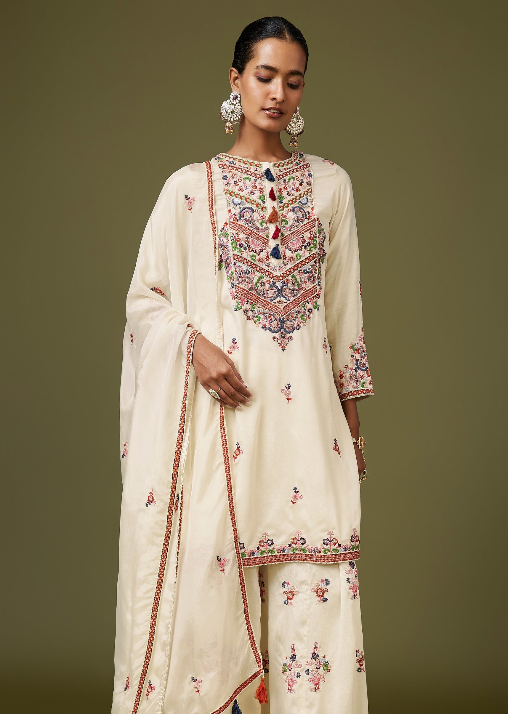 Fresh and festive, this white silk palazzo set features thread and moti work for a rich, Pakistani-style finish. The straight kurta with full sleeves and a round neckline is paired... More Product Details