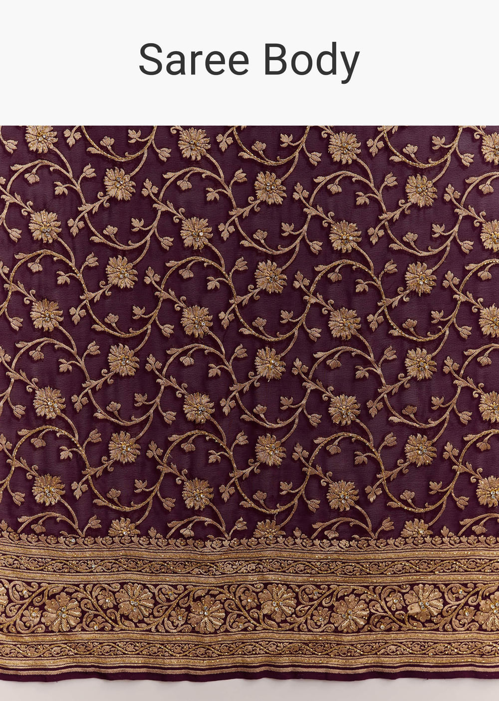 Wine Banarasi Silk Saree With Heavy Zari And Jaal Work