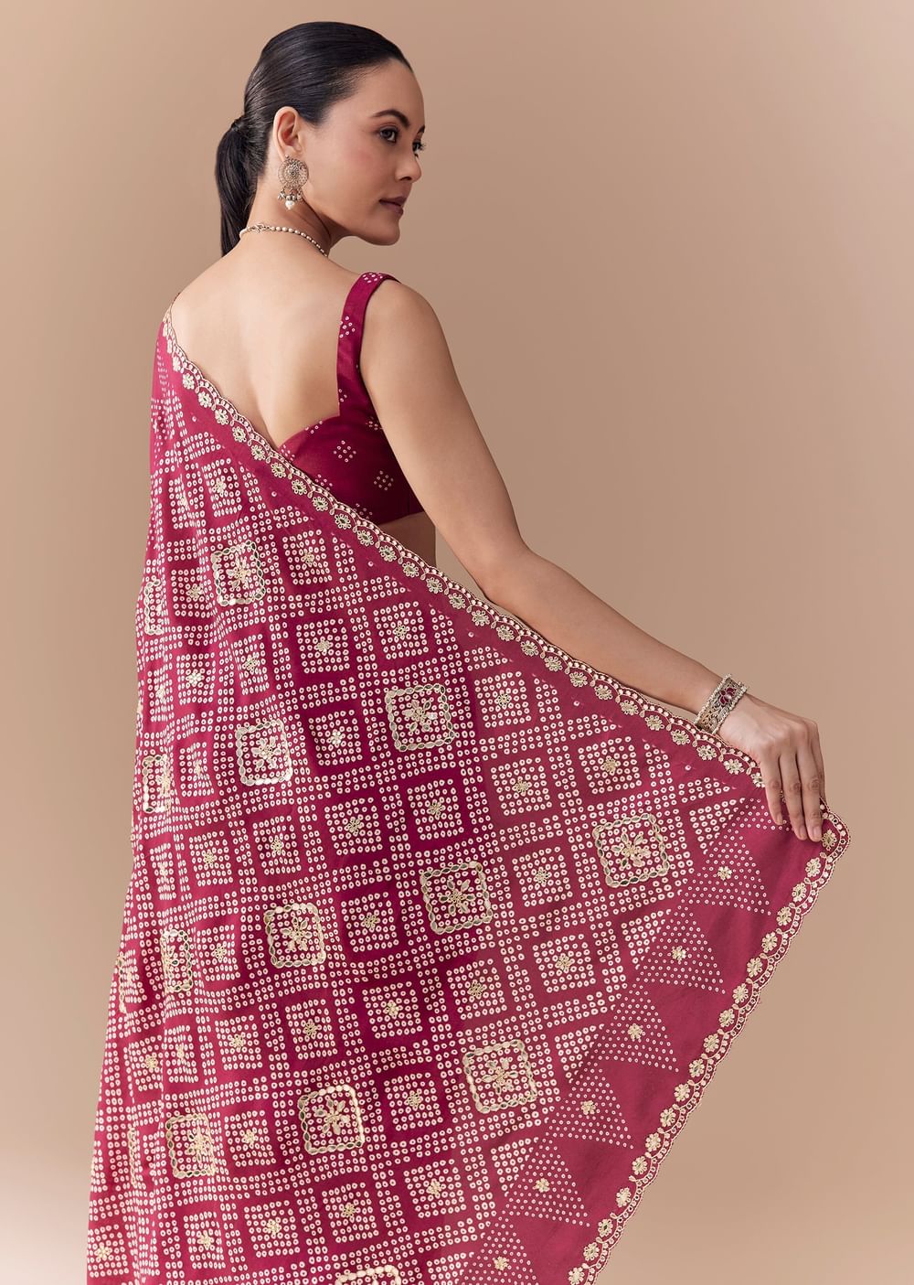 Wine Crepe Bandhani Print Saree with Blouse Fabric