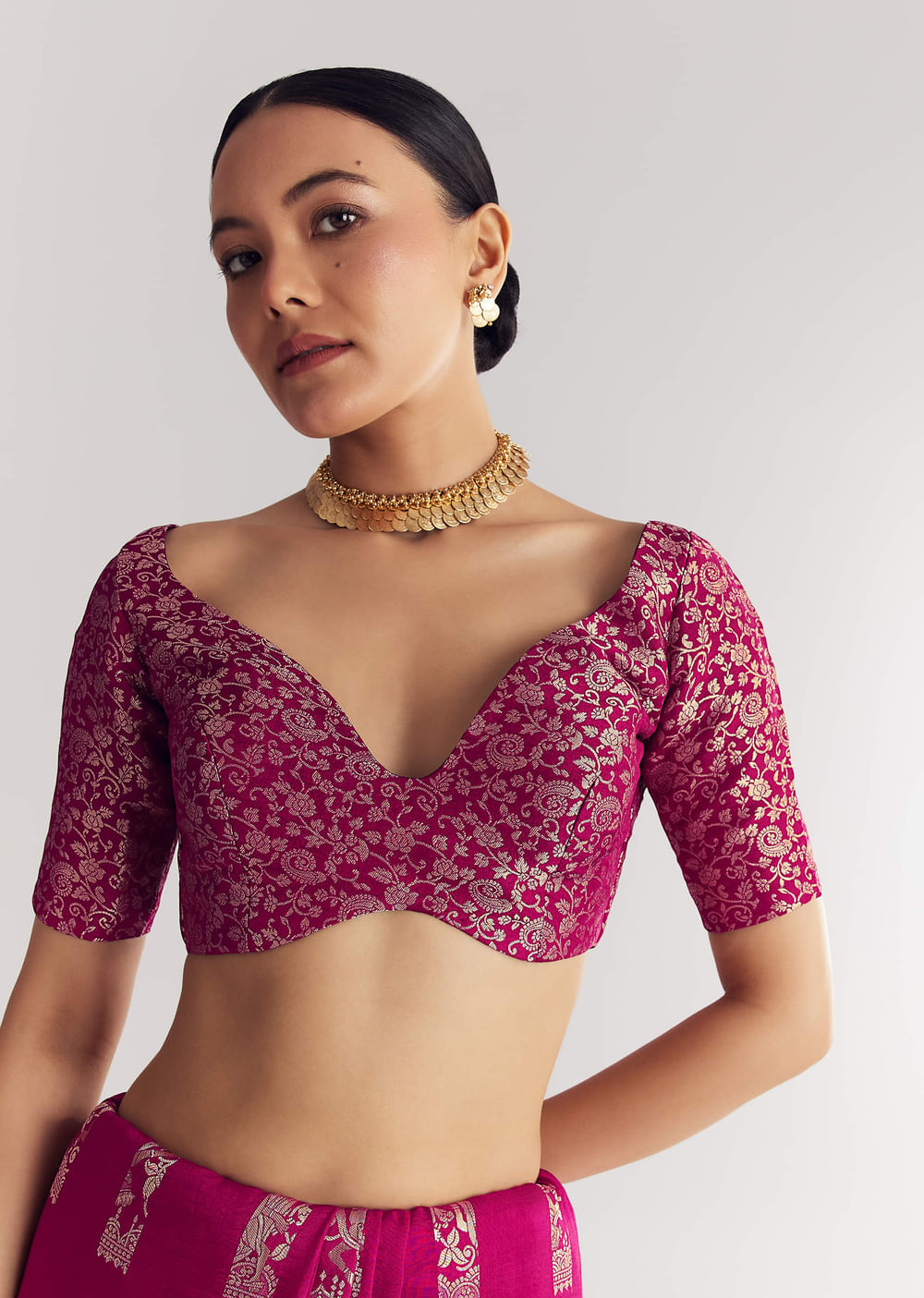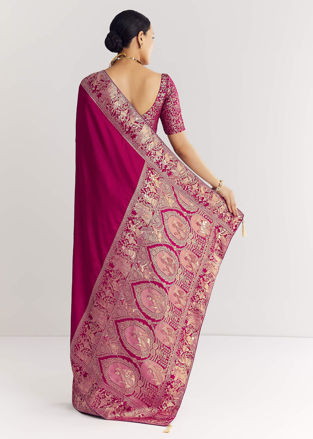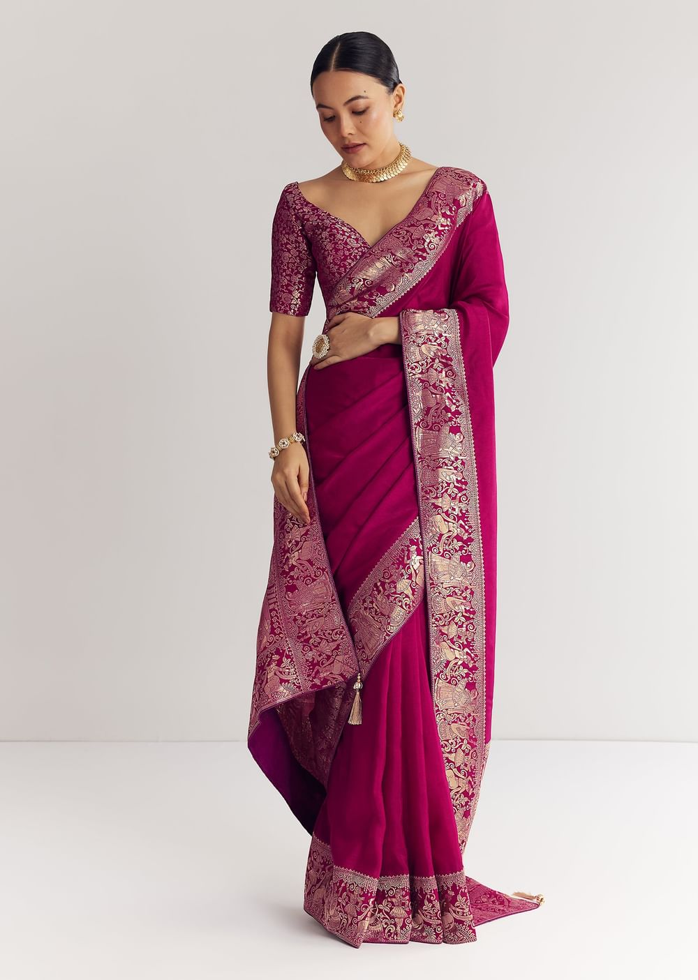 Enchant your senses with this wine saree. Each thread sings a lullaby of tradition and elegance. A go-to for festive gatherings and cultural celebrations. A drape destined to dazzle at every festive hour. Awarded as the Most Trusted Brand, we're delivering styles you love, just as promised.