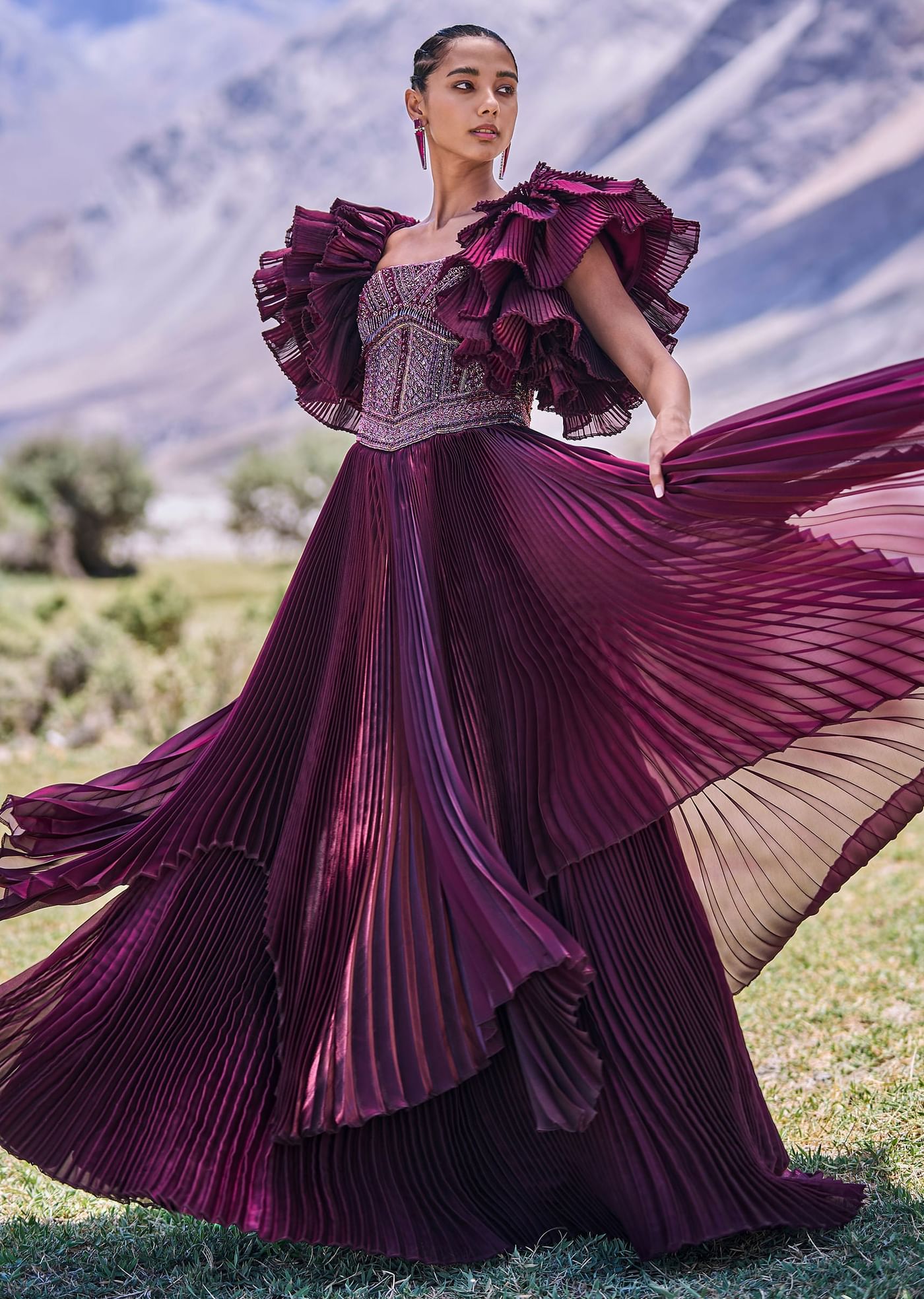 Wine Embroidered Flared Pleated Gown With Ruffle Sleeves