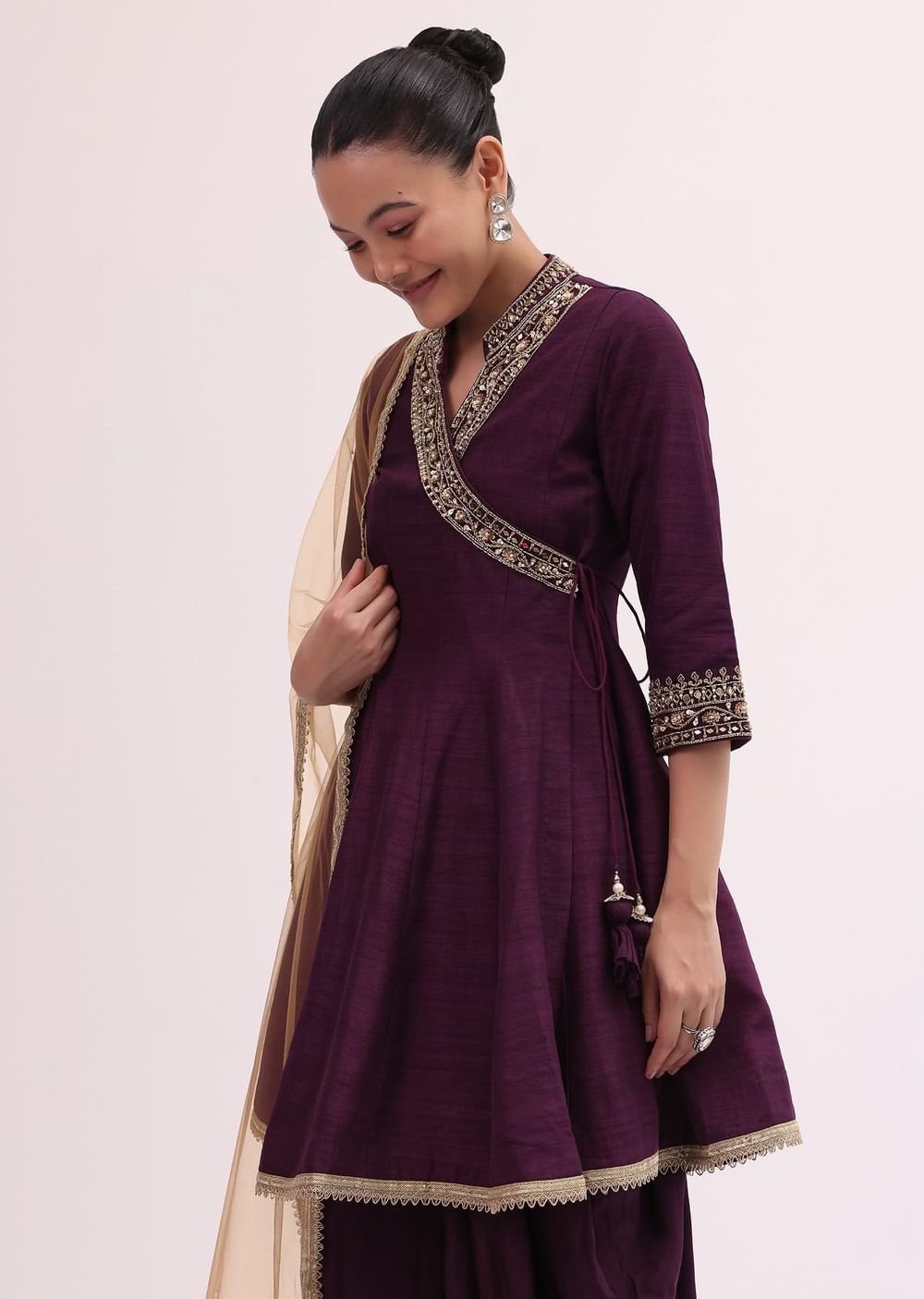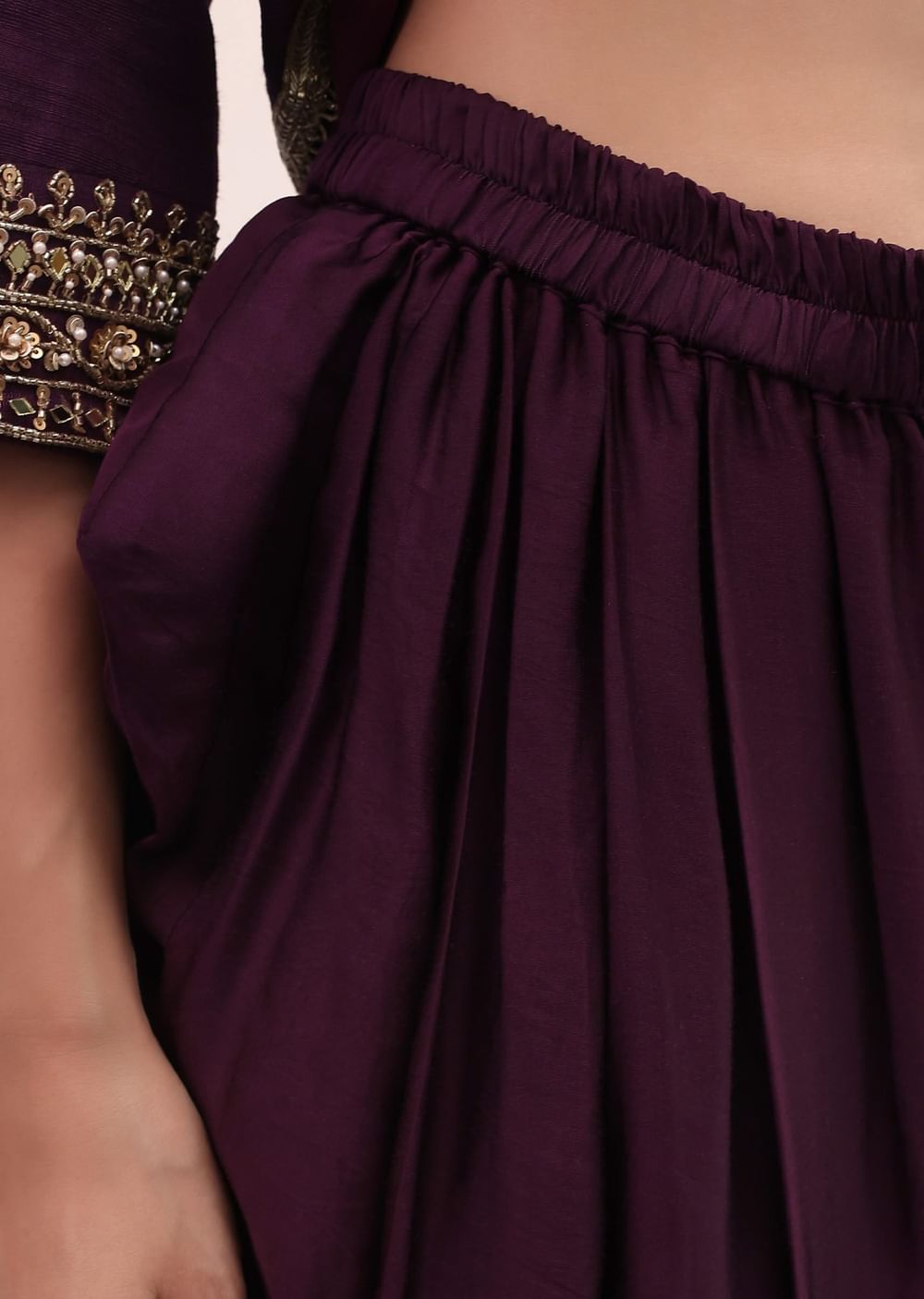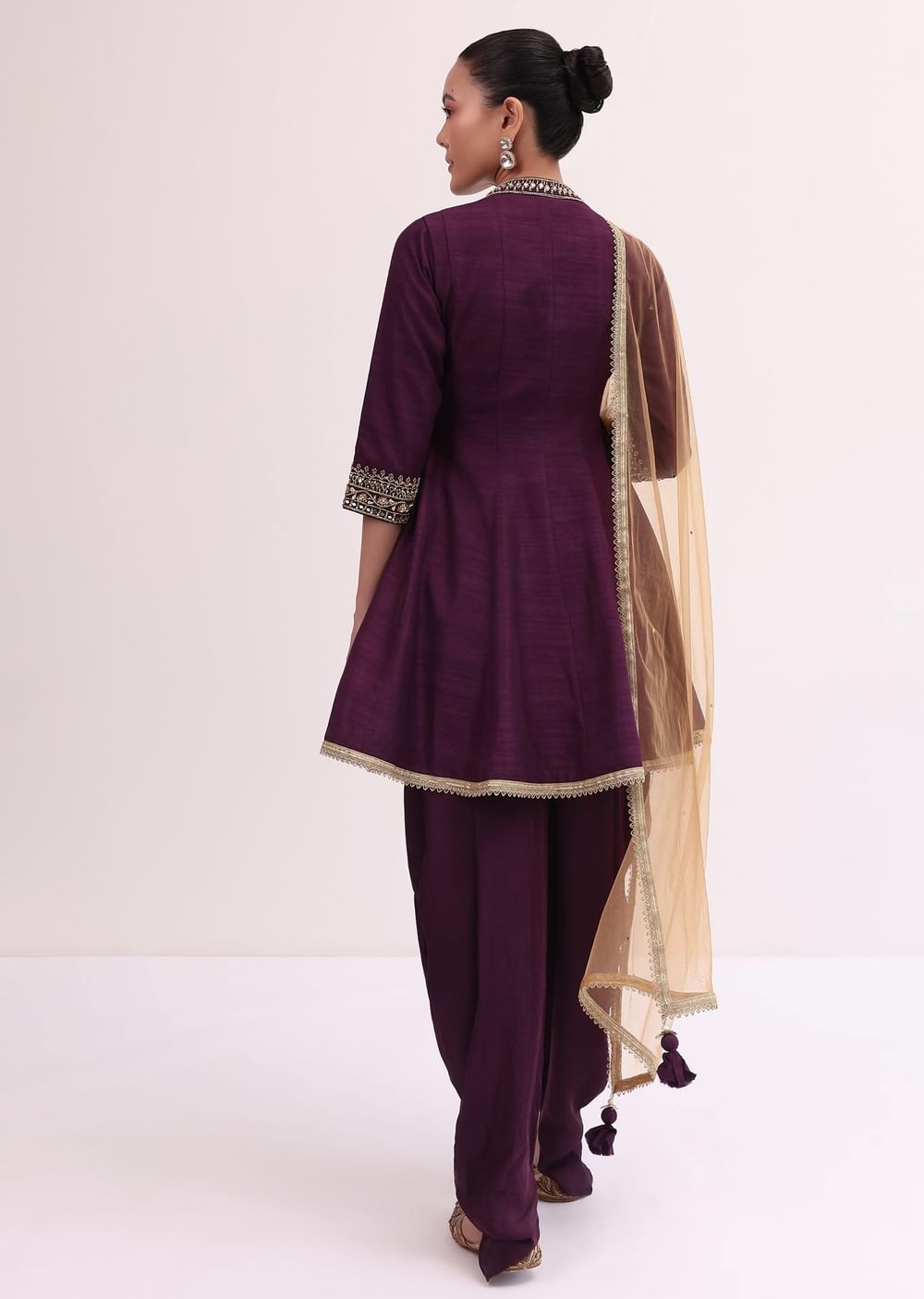 Celebrate in style with our wine kurta dhoti set, jeweled in sequins, moti, cut dana, and mirror embroidery. This set is fabricated on a satin tussar base. The kurta is... More Product Details