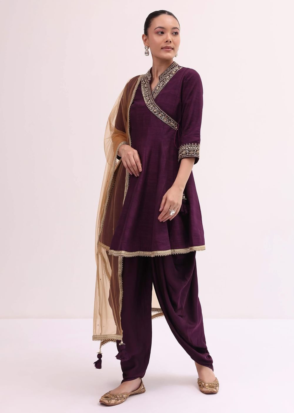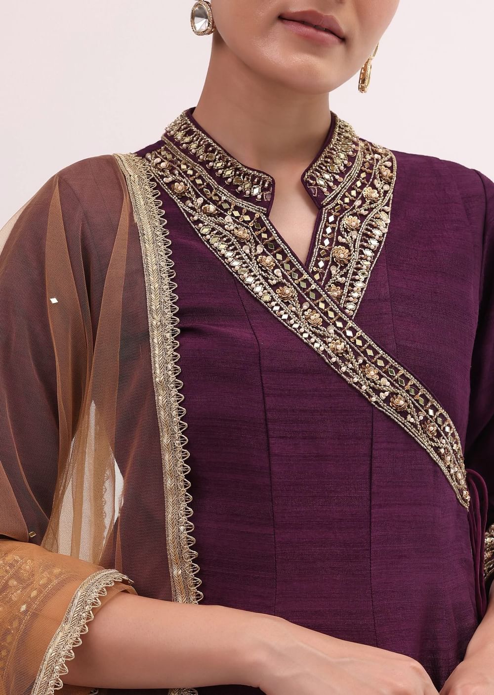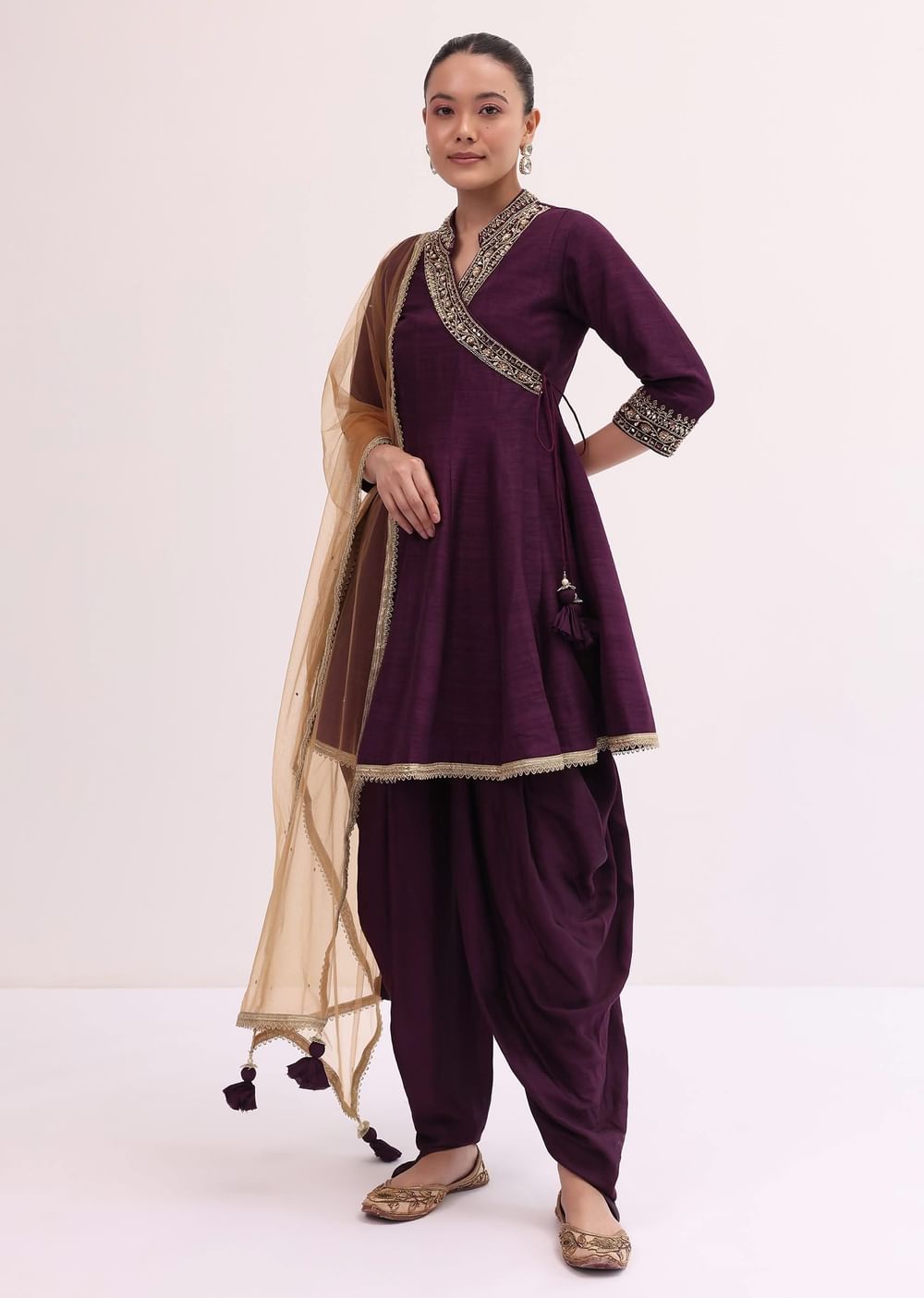 Celebrate in style with our wine kurta dhoti set, jeweled in sequins, moti, cut dana, and mirror embroidery. This set is fabricated on a satin tussar base. The kurta is... More Product Details