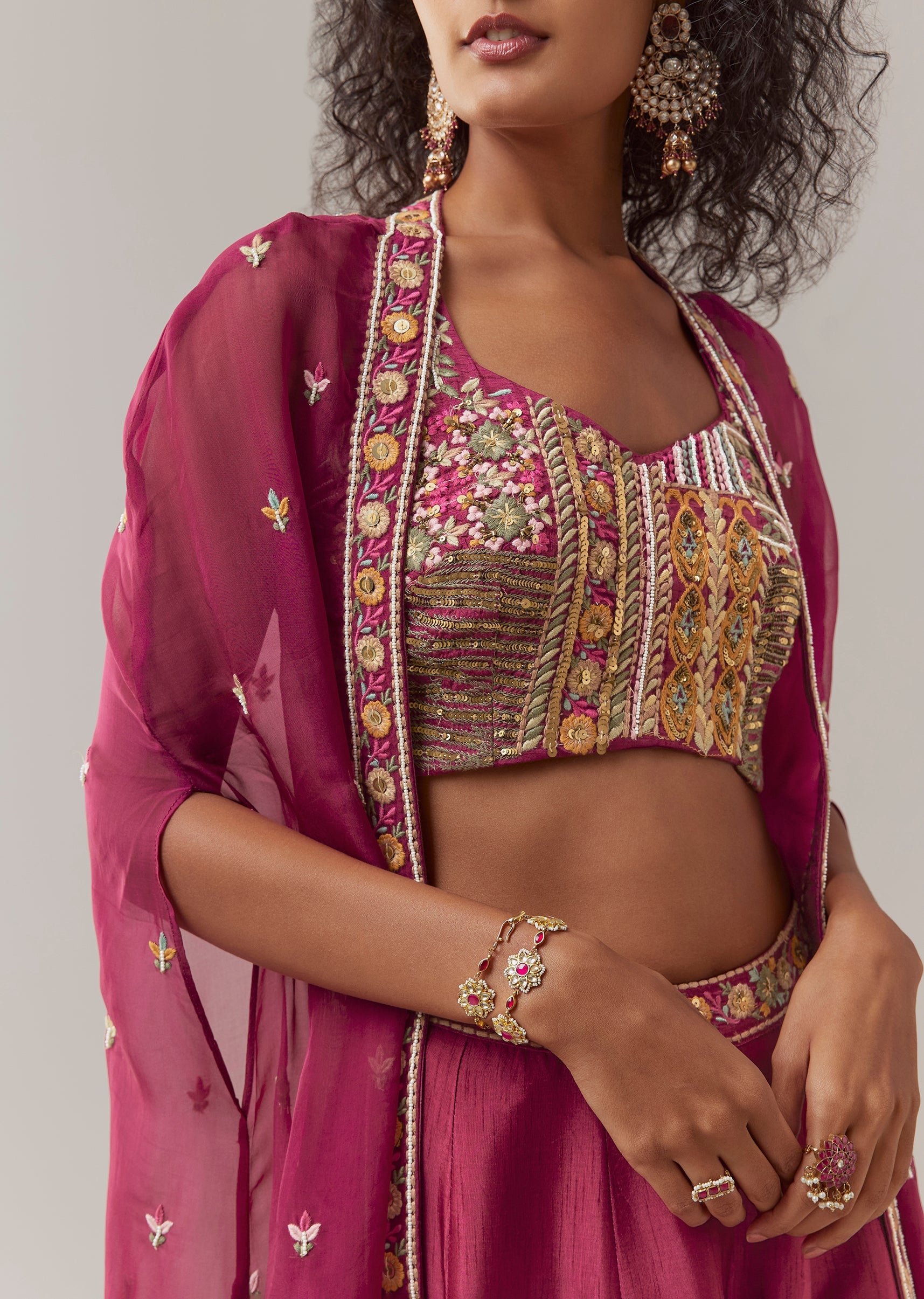 Rich and refined, this wine thread and sequins work crop top set brings a touch of luxury to festive dressing. The sleeveless silk crop top with a sweetheart neckline adds... More Product Details