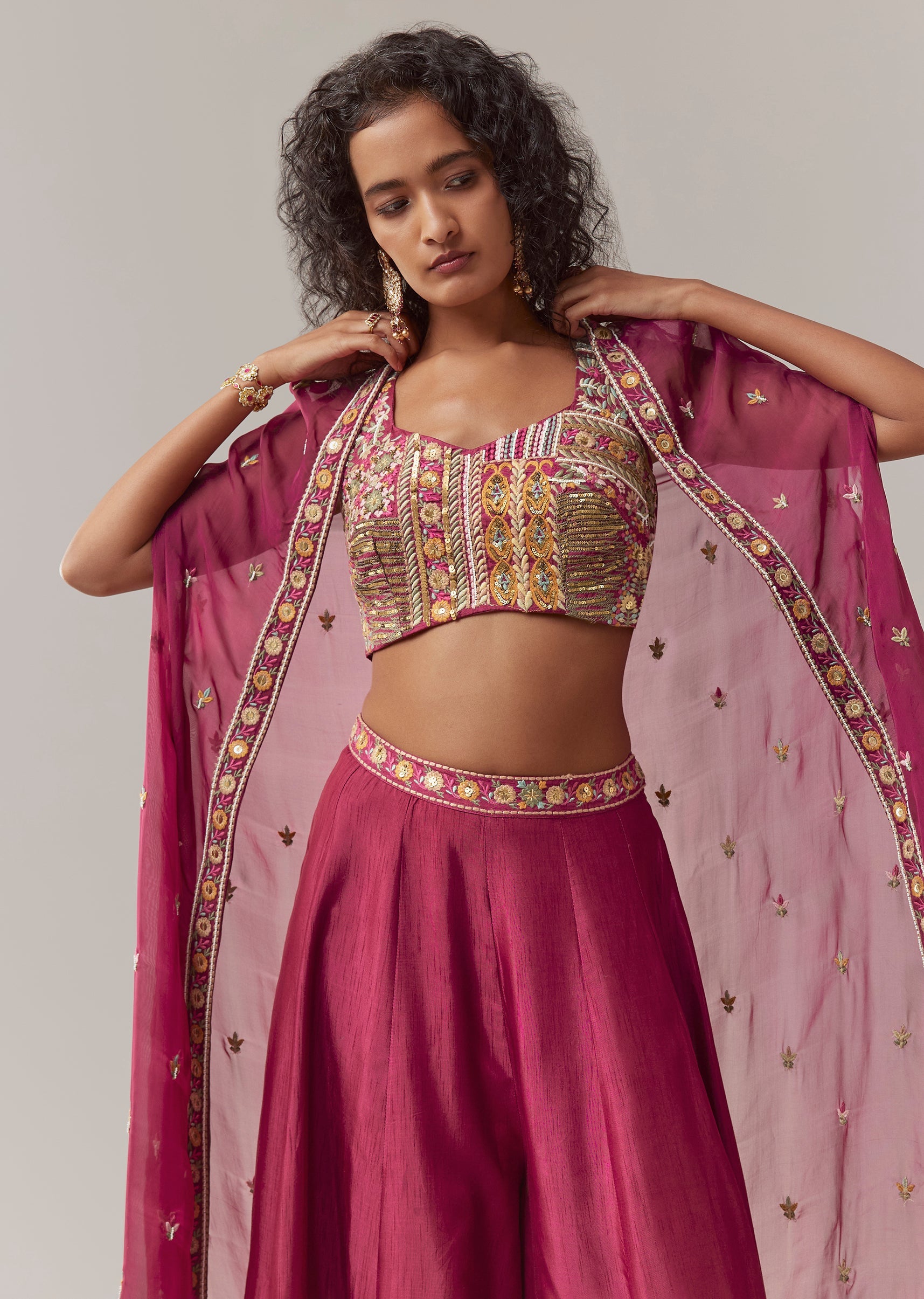 Rich and refined, this wine thread and sequins work crop top set brings a touch of luxury to festive dressing. The sleeveless silk crop top with a sweetheart neckline adds a bold yet elegant appeal, paired with fluid palazzo pants for graceful movement. The embroidered organza cape enhances the silhouette with a dramatic and sophisticated finish. Perfect for evening festivities, cocktail parties, weddings, and glamorous celebrations.