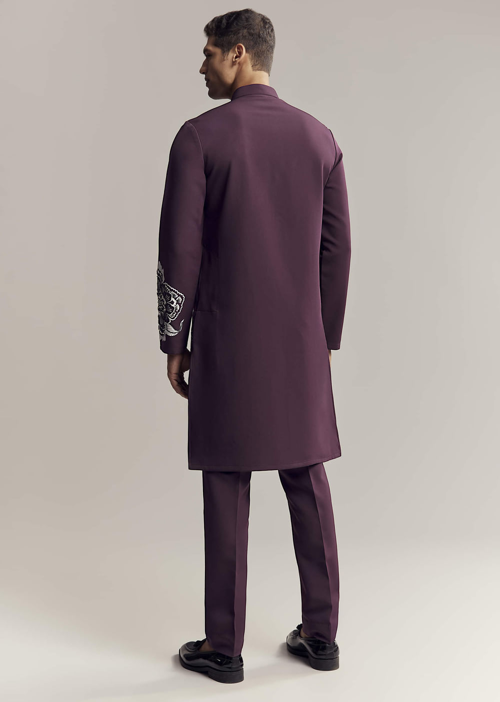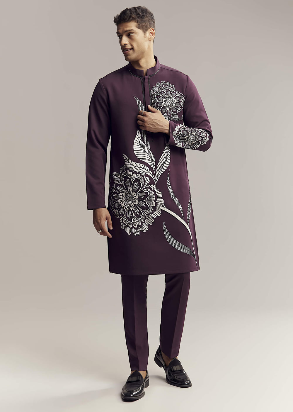 Wine Kurta Set For Men With Floral Print And Beads Work On Suiting Fabric