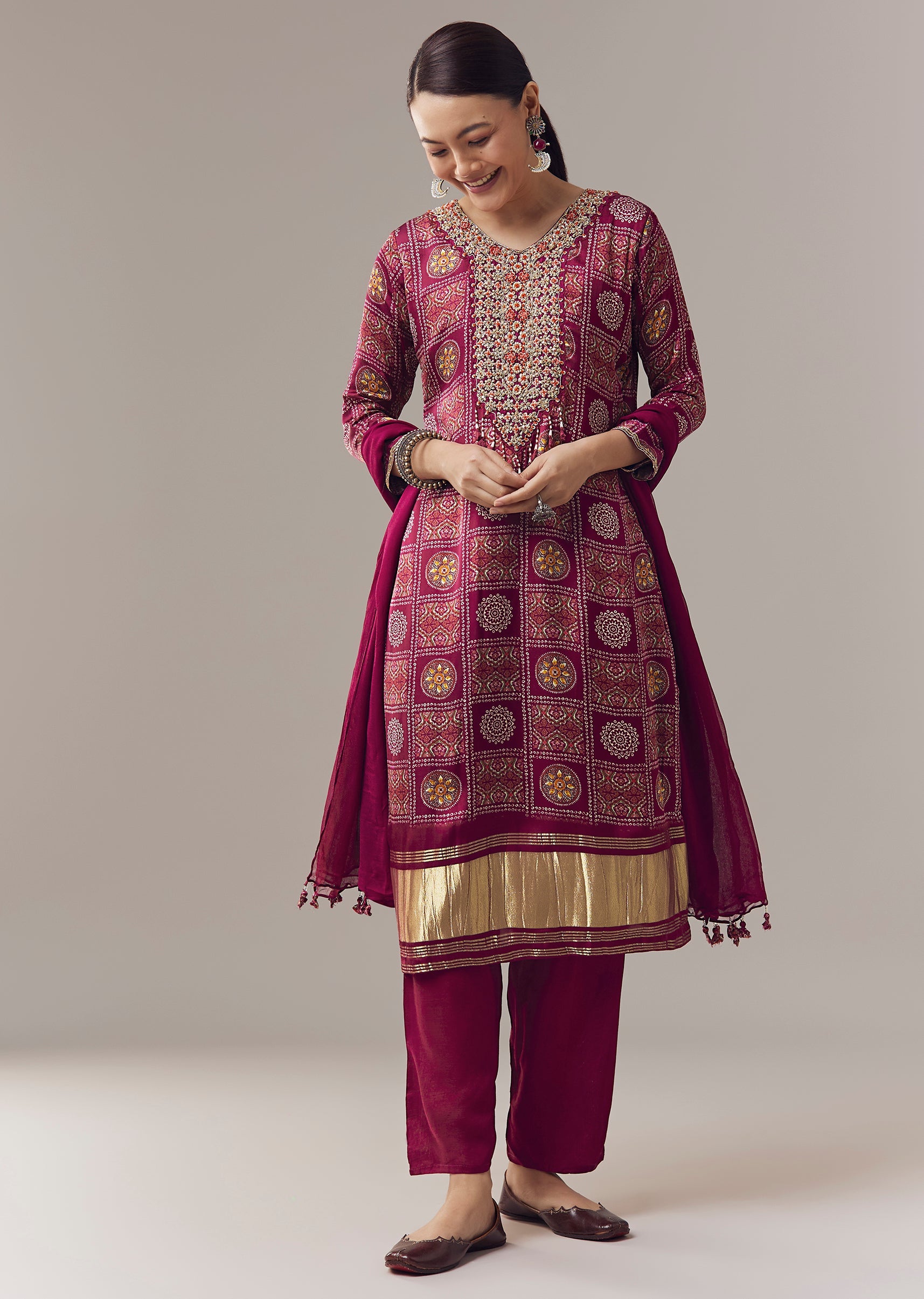 Wine Kurta Set In Bandhani Print With Embroidered Neck And Dupatta