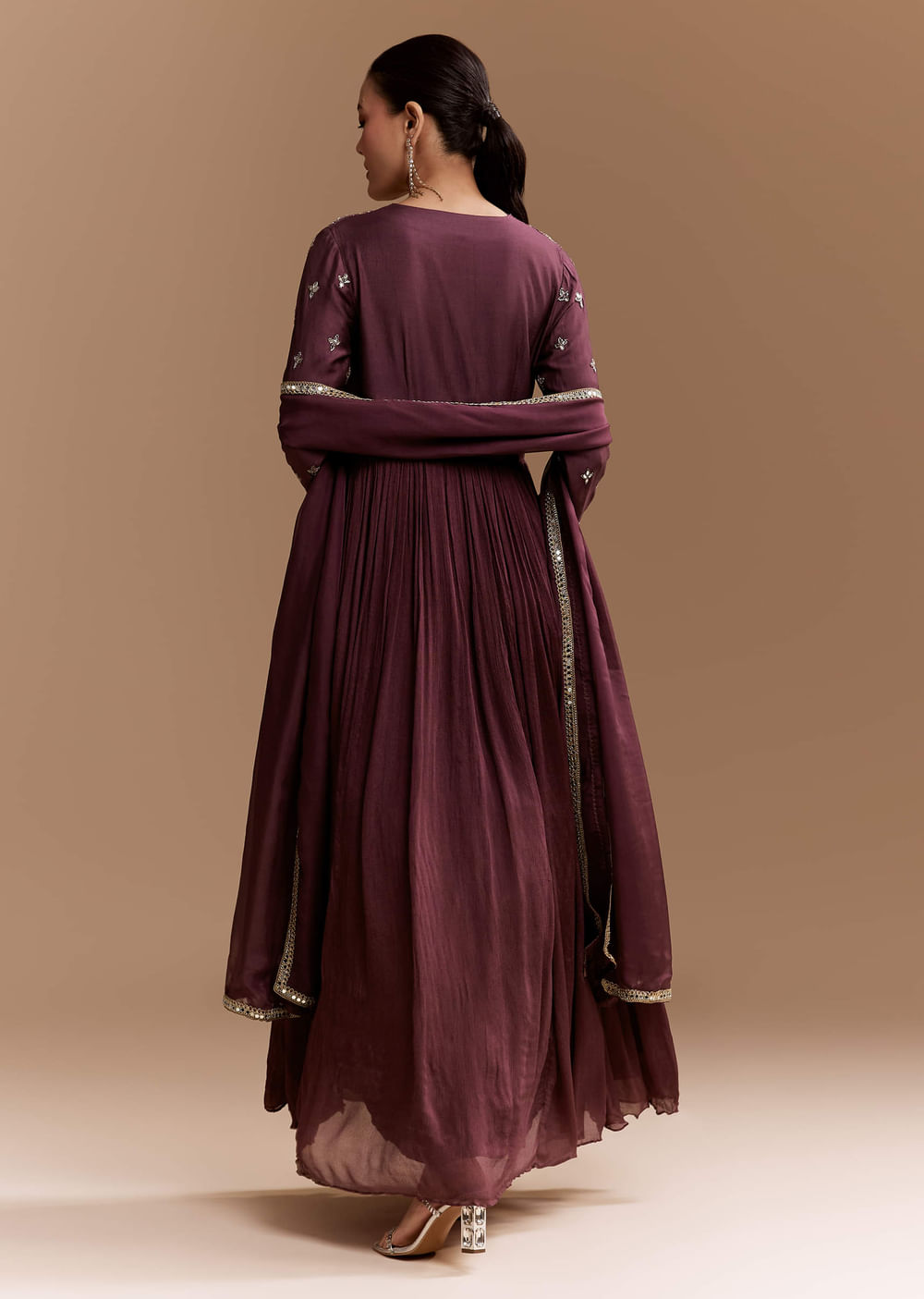 Wine Mirror Embroidered Chinnon Anarkali with Dupatta