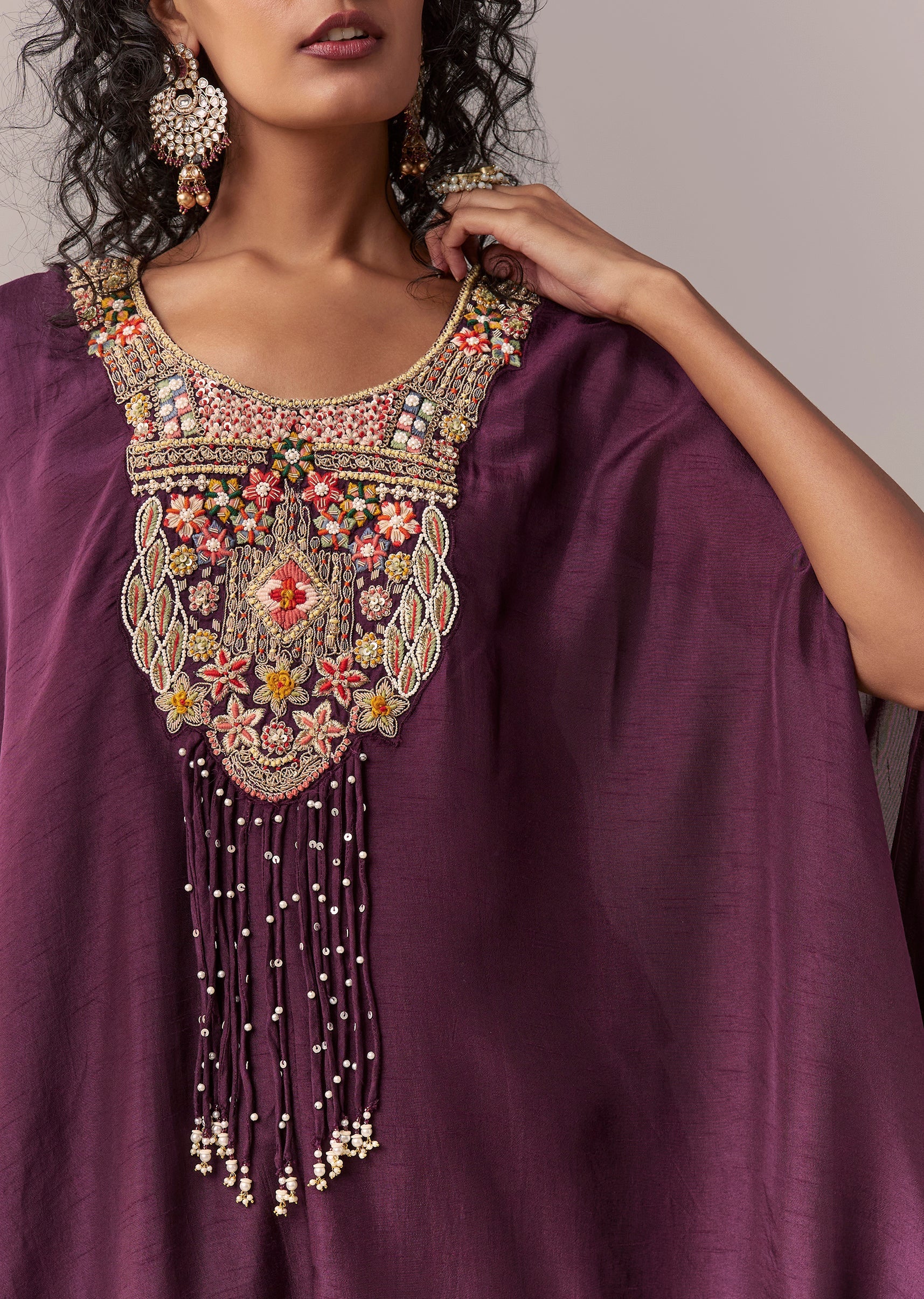 Crafted in luxurious dola silk, this wine-toned cape co-ord set brings together elegance and modern ease. The statement cape is highlighted with delicate thread and moti embroidery, layered over a... More Product Details