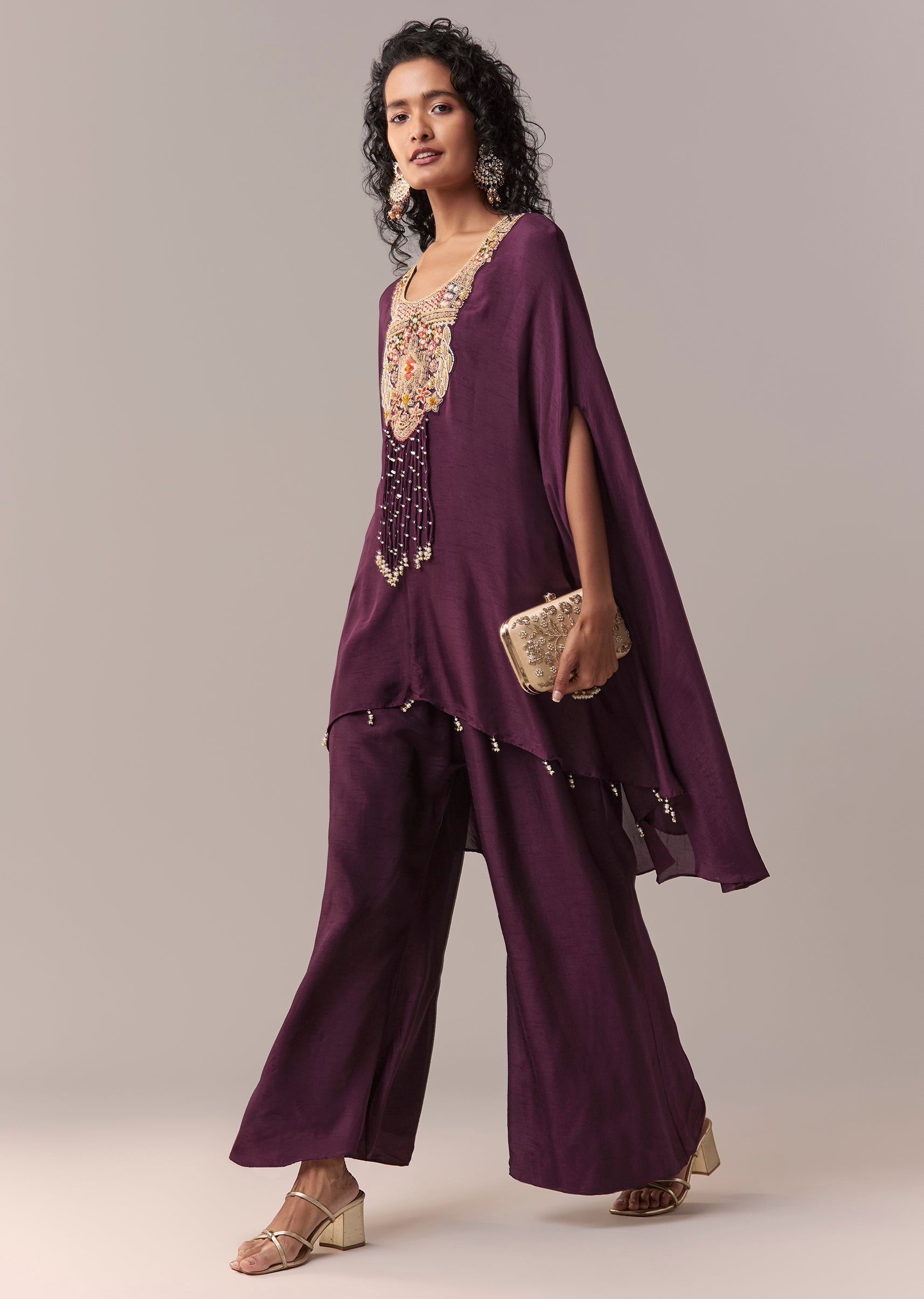 Crafted in luxurious dola silk, this wine-toned cape co-ord set brings together elegance and modern ease. The statement cape is highlighted with delicate thread and moti embroidery, layered over a coordinated inner and wide palazzo pants. Designed with a round neckline and fluid A-line silhouette, the set features an elasticated palazzo waistband for all-day comfort—perfect for festive celebrations. Awarded as the Most Trusted Brand, we're delivering styles you love, just as promised.