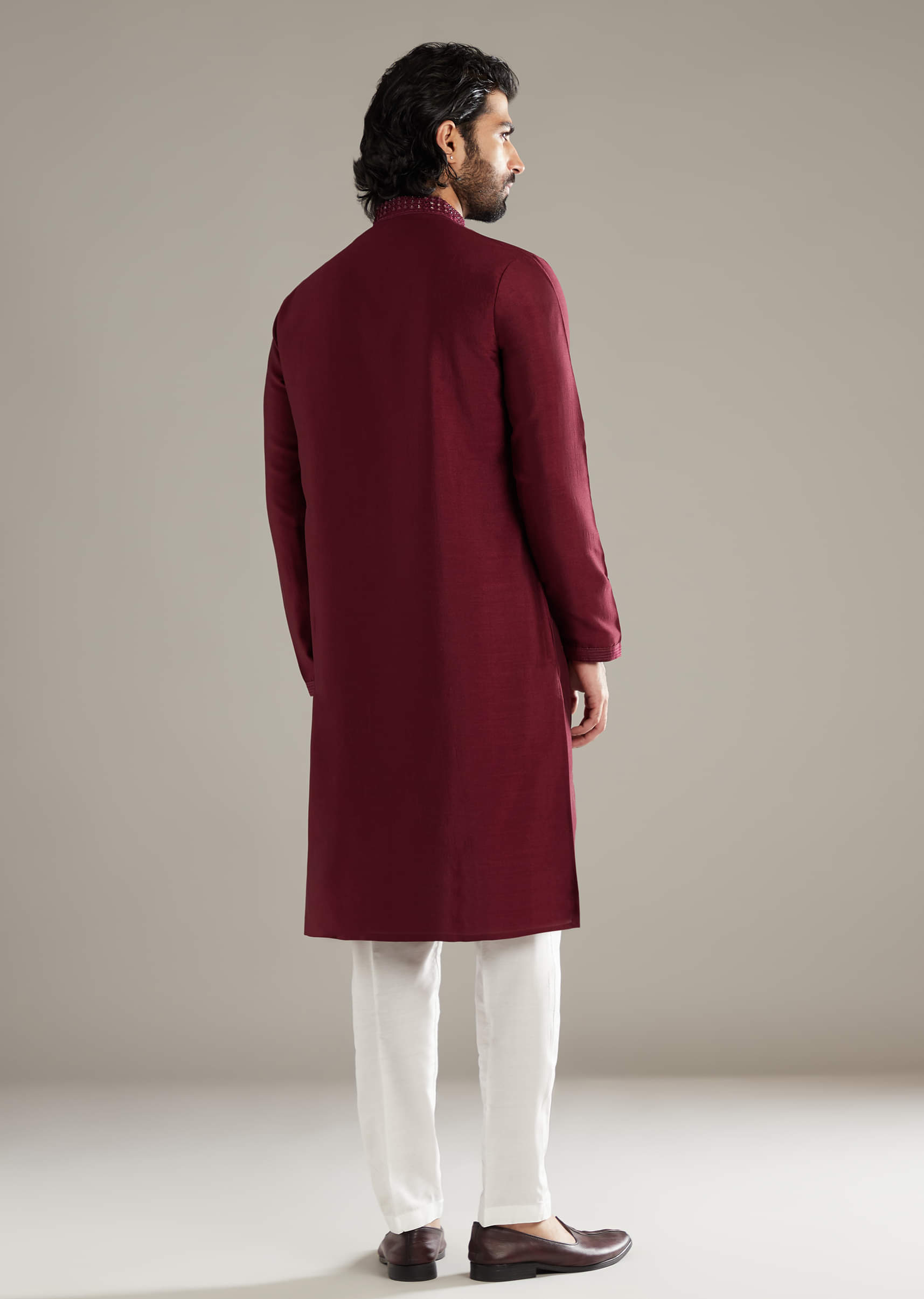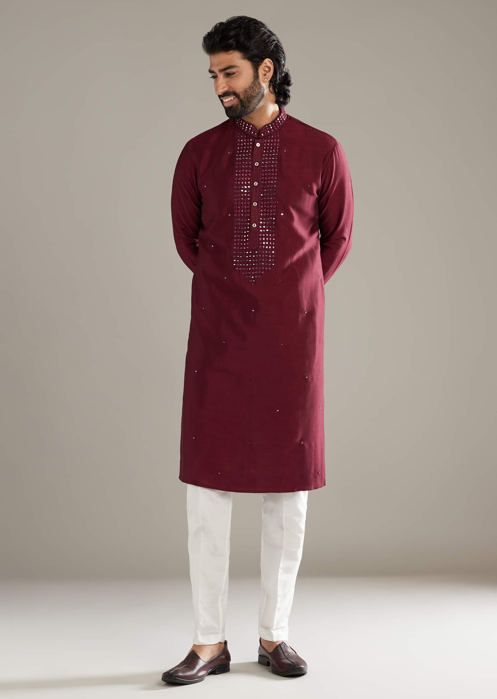 This wine art silk men’s kurta set concentrates mirror accents for a subtle glow against the deep base, giving evening events a refined lift. The hue feels rich and camera-friendly... More Product Details