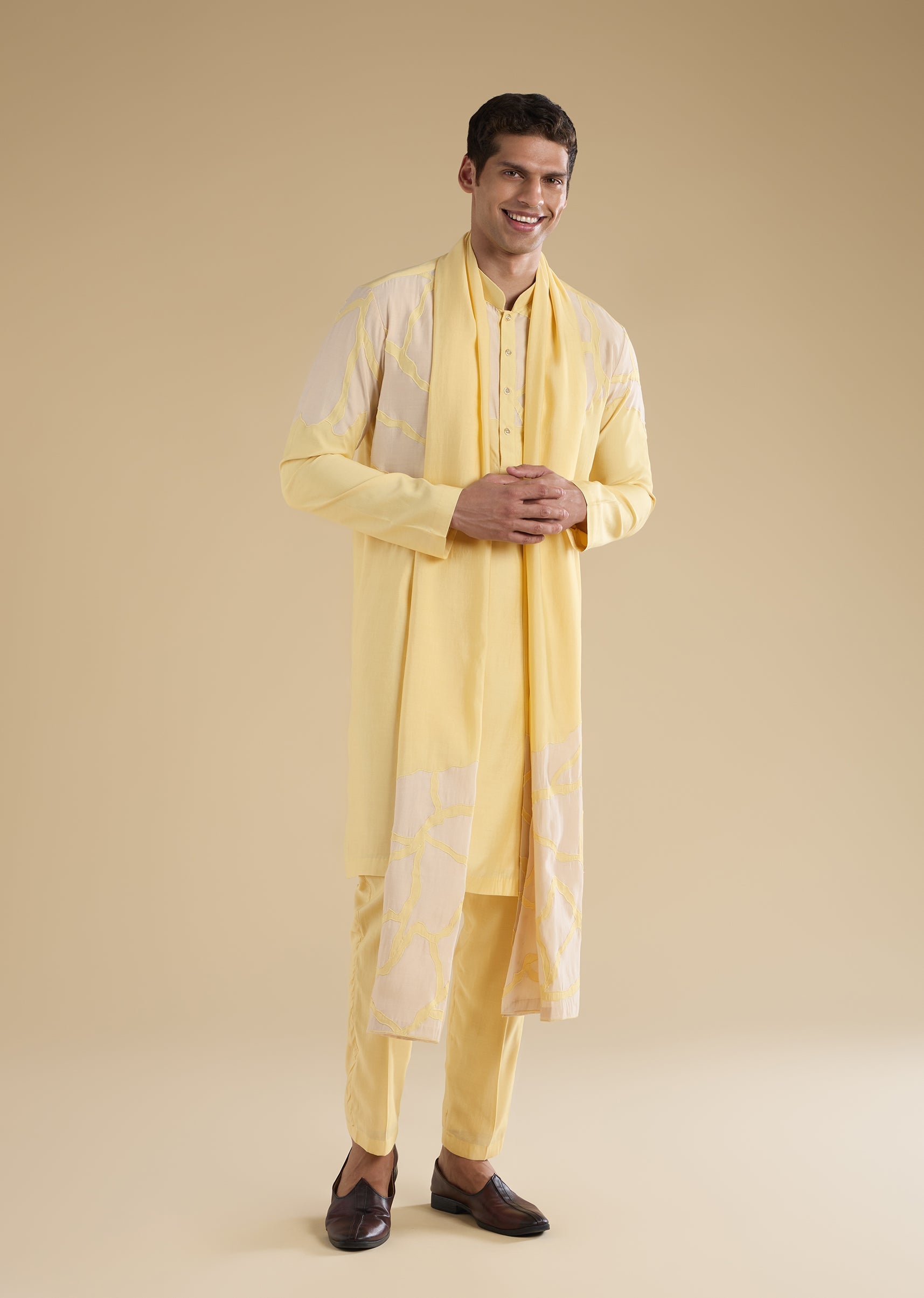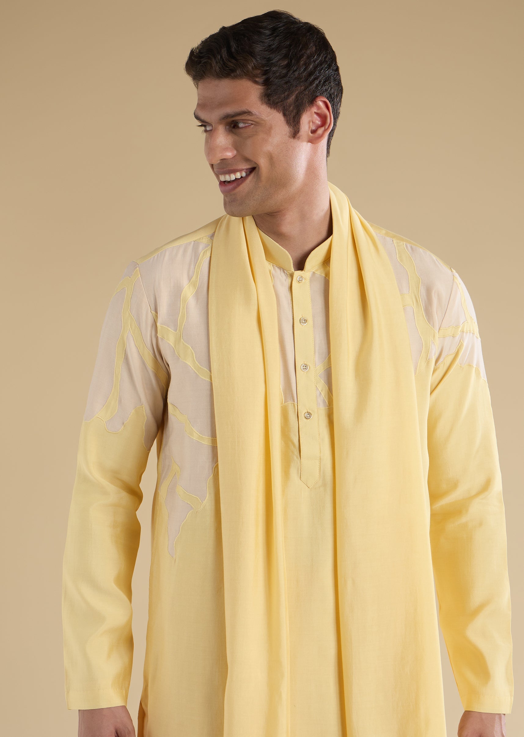A bright yellow festive kurta set featuring applique detailing for a clean, elevated haldi look. Styled with mandarin collar, full sleeves, and front buttons, it’s paired with straight mid-waist pants... More Product Details
