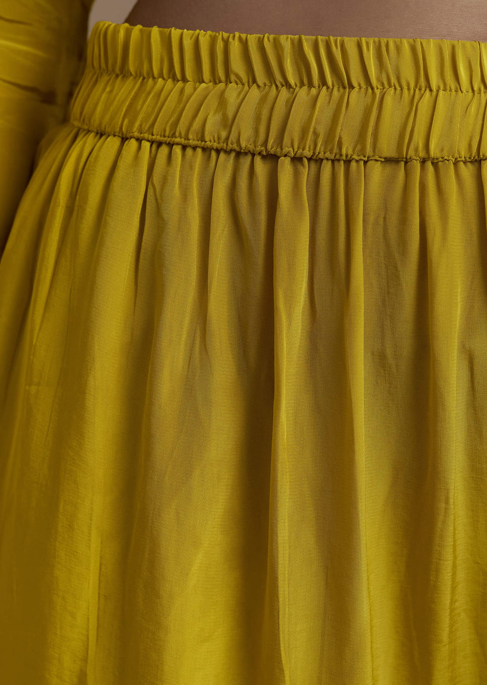 Radiate festive joy in this bright yellow kurta and palazzo set that blends graceful movement with artisanal shimmer. Featuring mirror and moti embellishments, the asymmetric hem adds a playful twist,... More Product Details