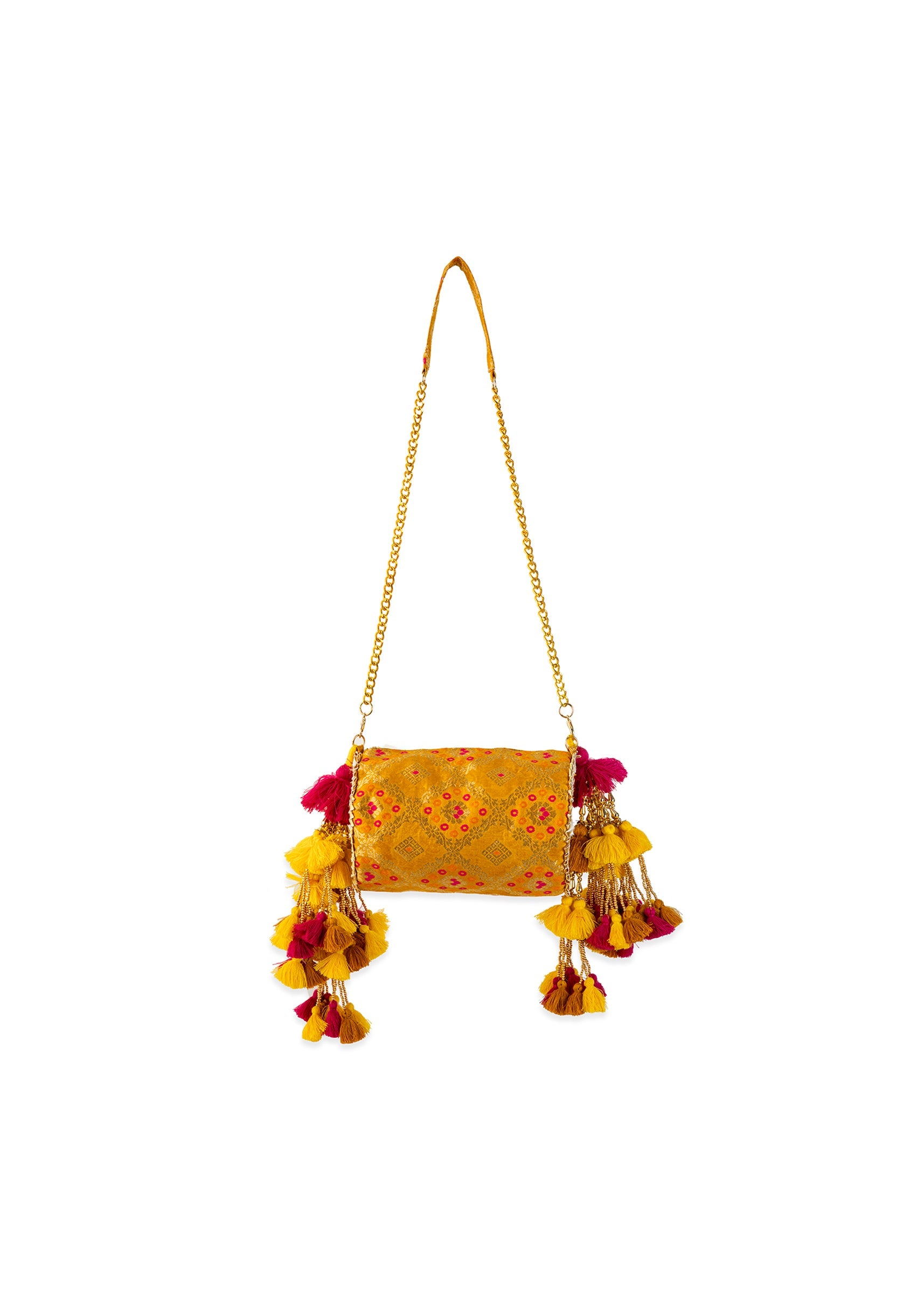Add a touch of celebratory charm to your ensemble with this bright yellow brocade bag, detailed with intricate golden motifs that exude classic elegance. Shimmering zari work, ornate embellishments, and playful tassels create a beautiful blend of texture and festivity. Lightweight yet full of presence, it brings a refined, regal finish to any ethnic look. Awarded as the Most Trusted Brand, we're delivering styles you love, just as promised.