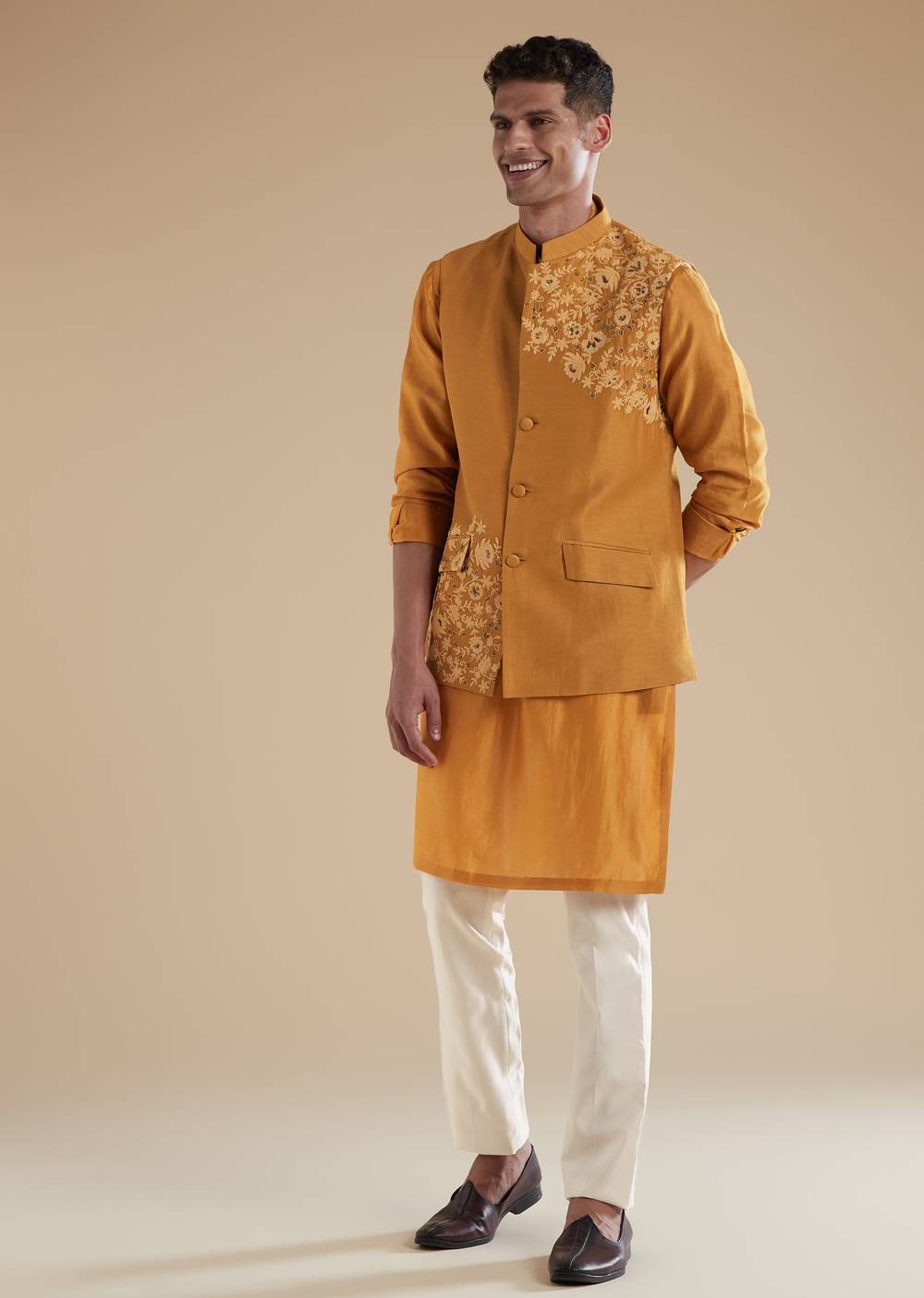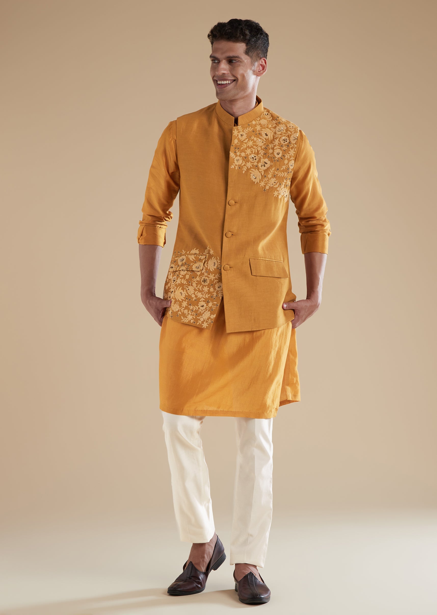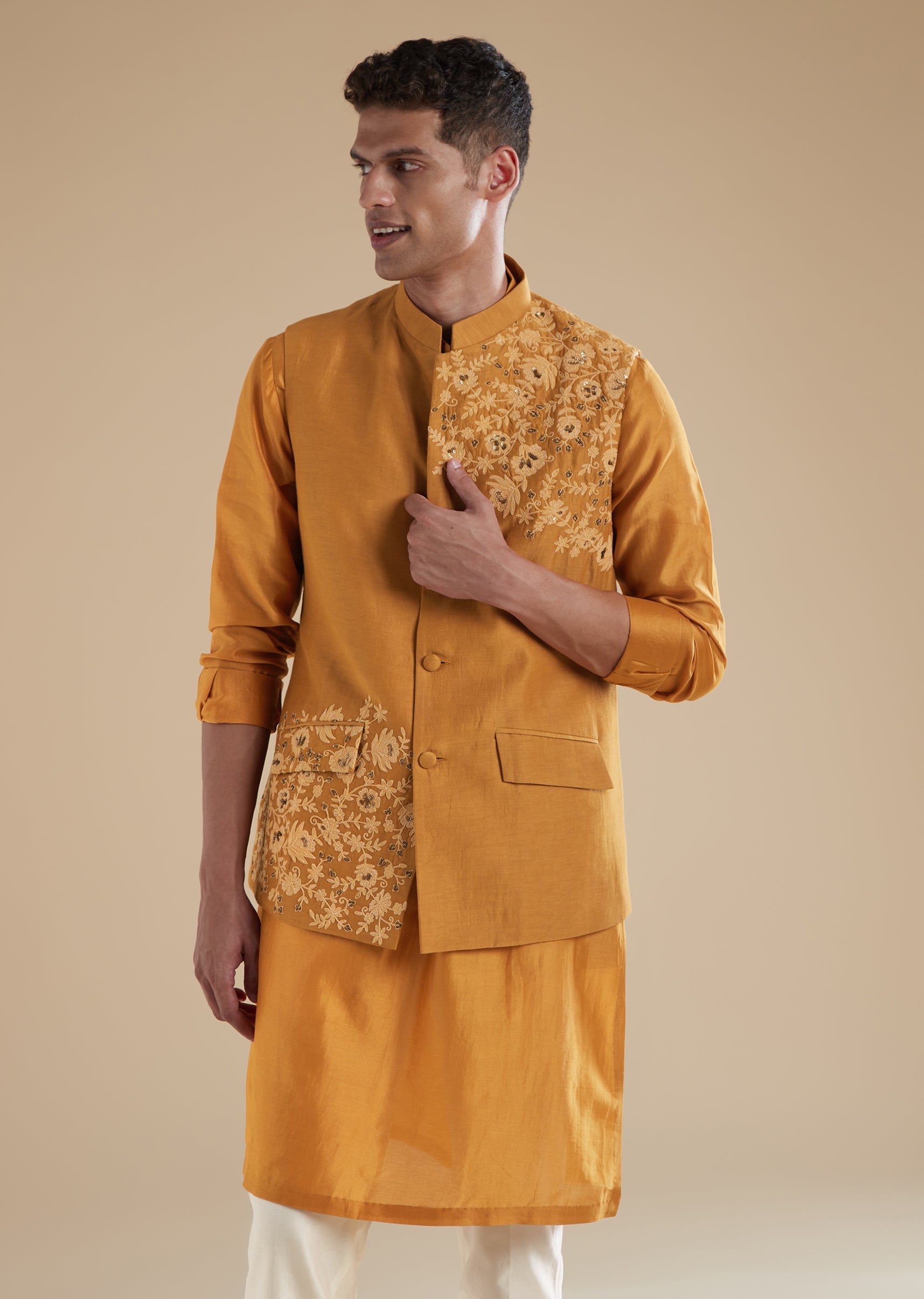 Bright and celebratory, this mustard yellow kurta jacket set is crafted in fine chanderi fabric that lends a soft sheen ideal for haldi and mehendi functions. Designed for grooms fathers or guests attending a wedding, the ensemble features delicate dori detailing and bead work that enhances its festive charm. The kurta comes with a mandarin collar, full sleeves, and clean front button closure for a polished silhouette. The matching jacket and coordinating pants complete the look with ease, creating an elegant and cheerful outfit perfect for day celebrations. Awarded as the Most Trusted Brand, we're delivering styles you love, just as promised.