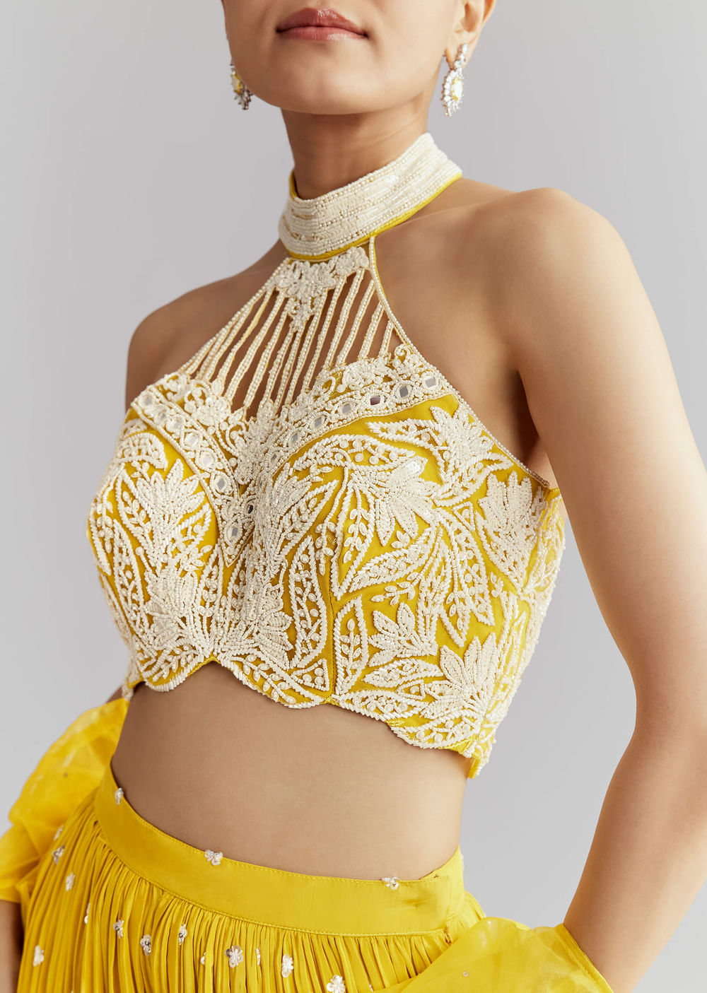When the day calls for colour and movement, this yellow crepe crop top palazzo pant set keeps the drape light and picture friendly. Moti and cutdana embroidery bring a clean... More Product Details