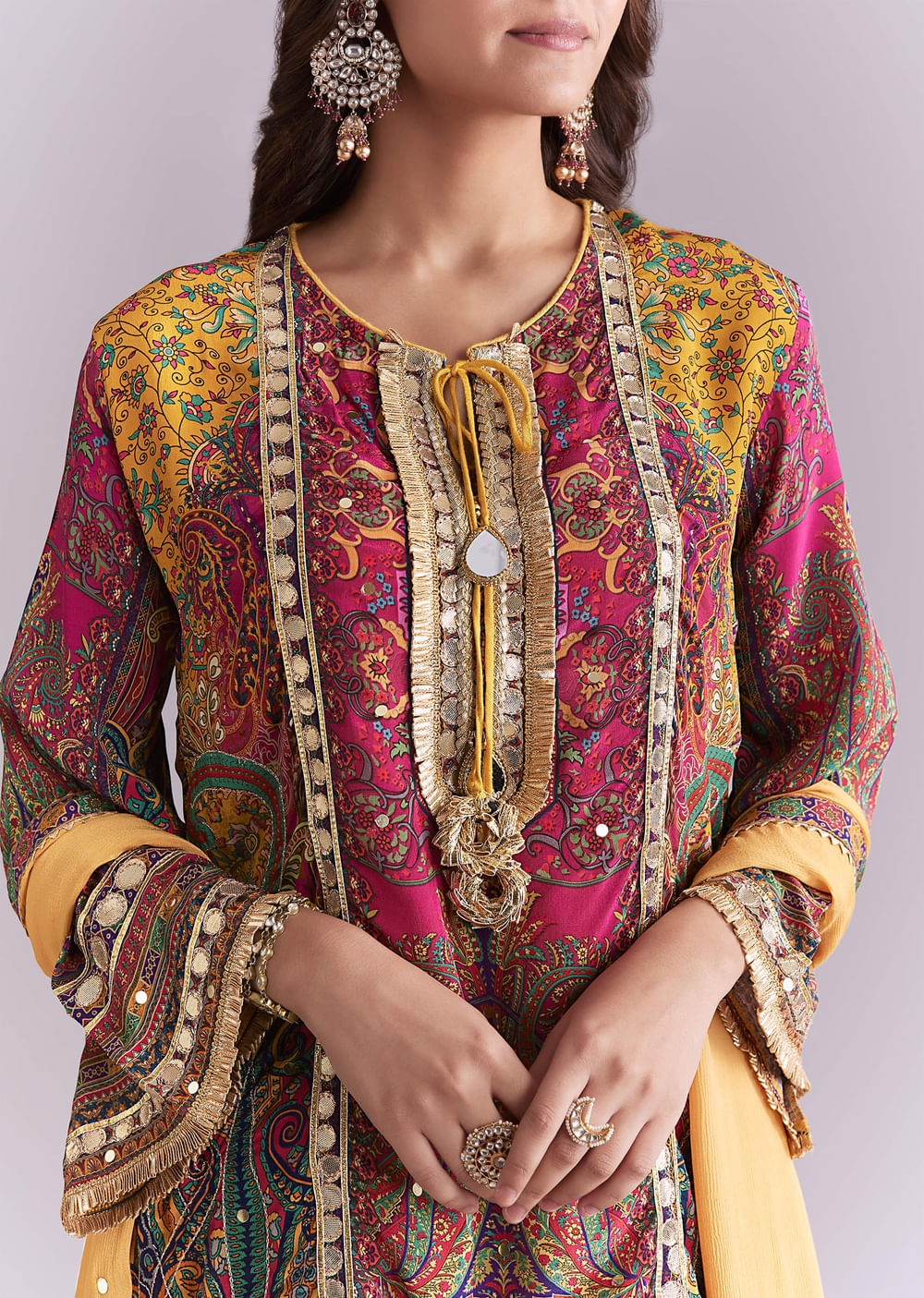 Yellow Crepe Printed Sharara Suit With Gota Detail And Potli