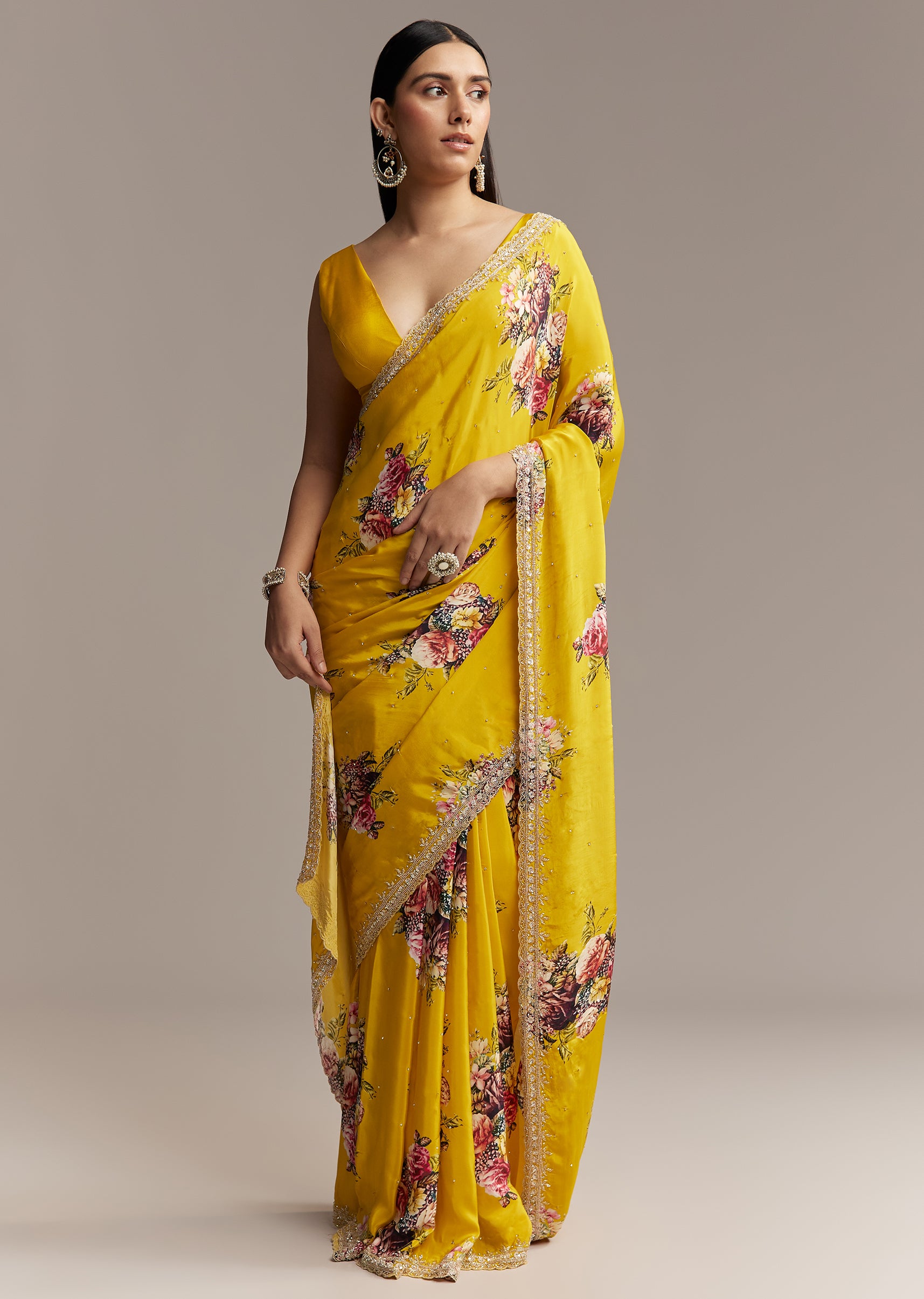 Yellow Crepe Saree With Multicolor Floral Print And Embellished Border