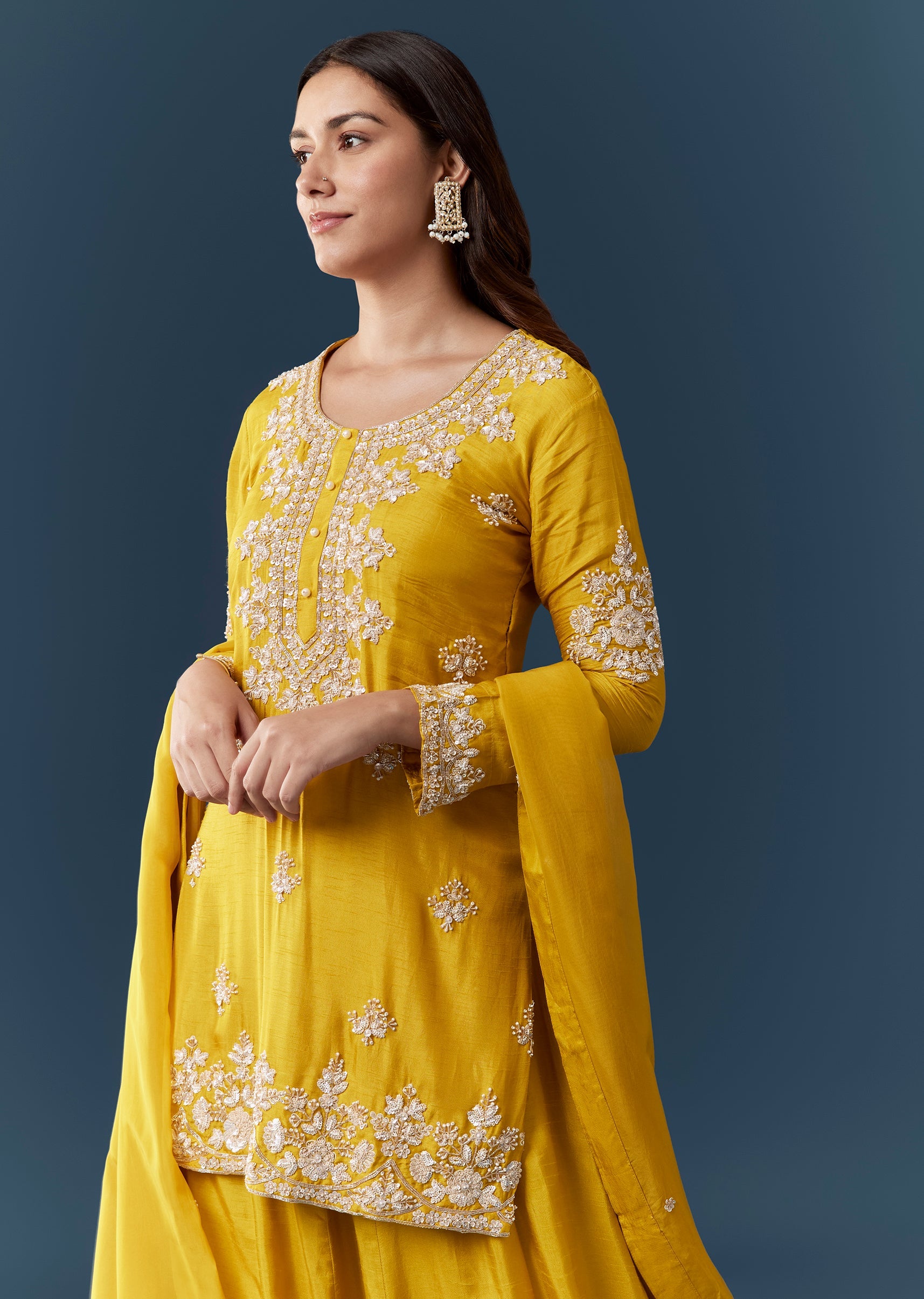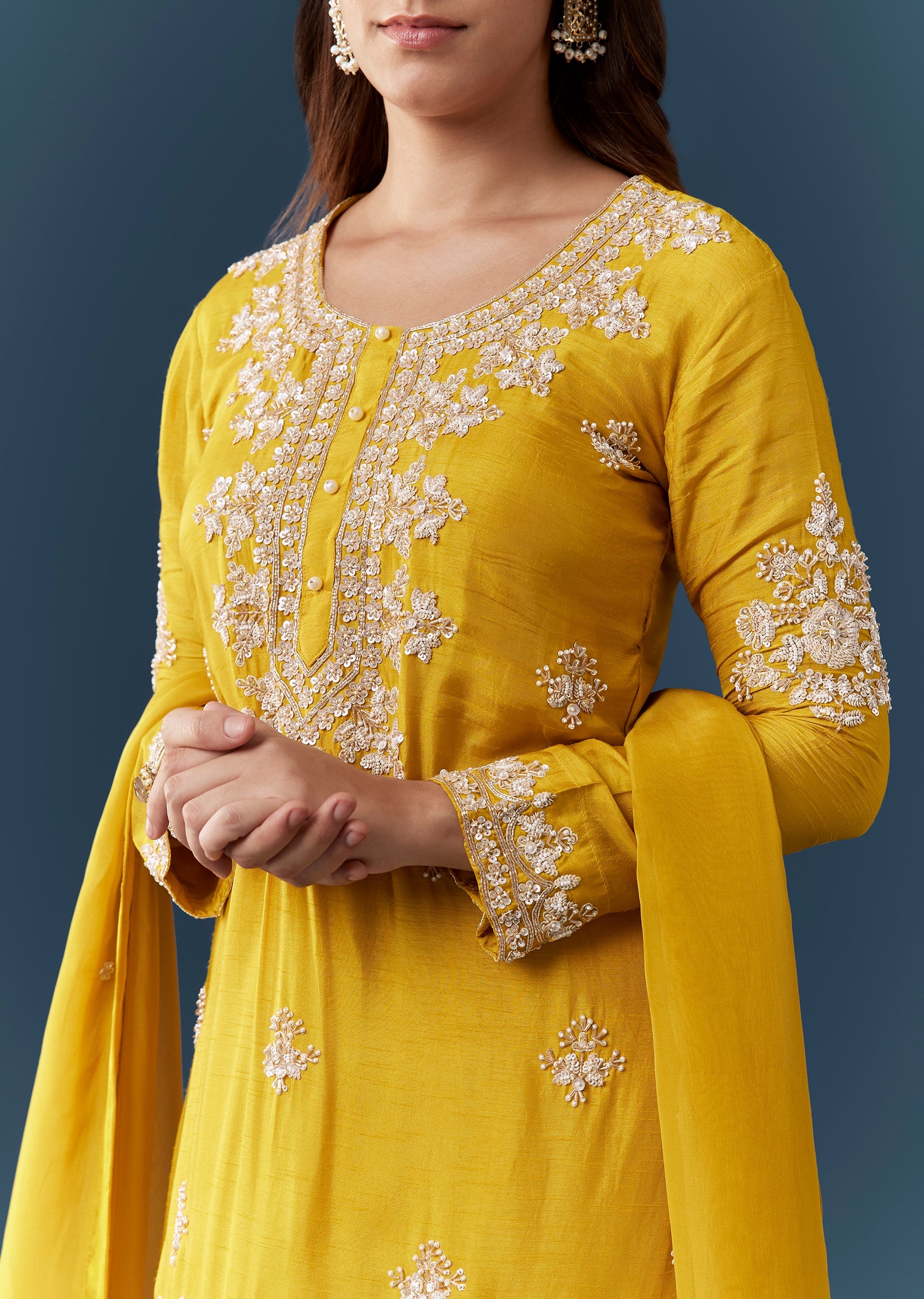 Celebrate in vibrant elegance with this yellow silk kurta set adorned with shimmering sequins, intricate cut dana accents, and fine embroidery that add a bright festive sparkle. The full sleeve... More Product Details
