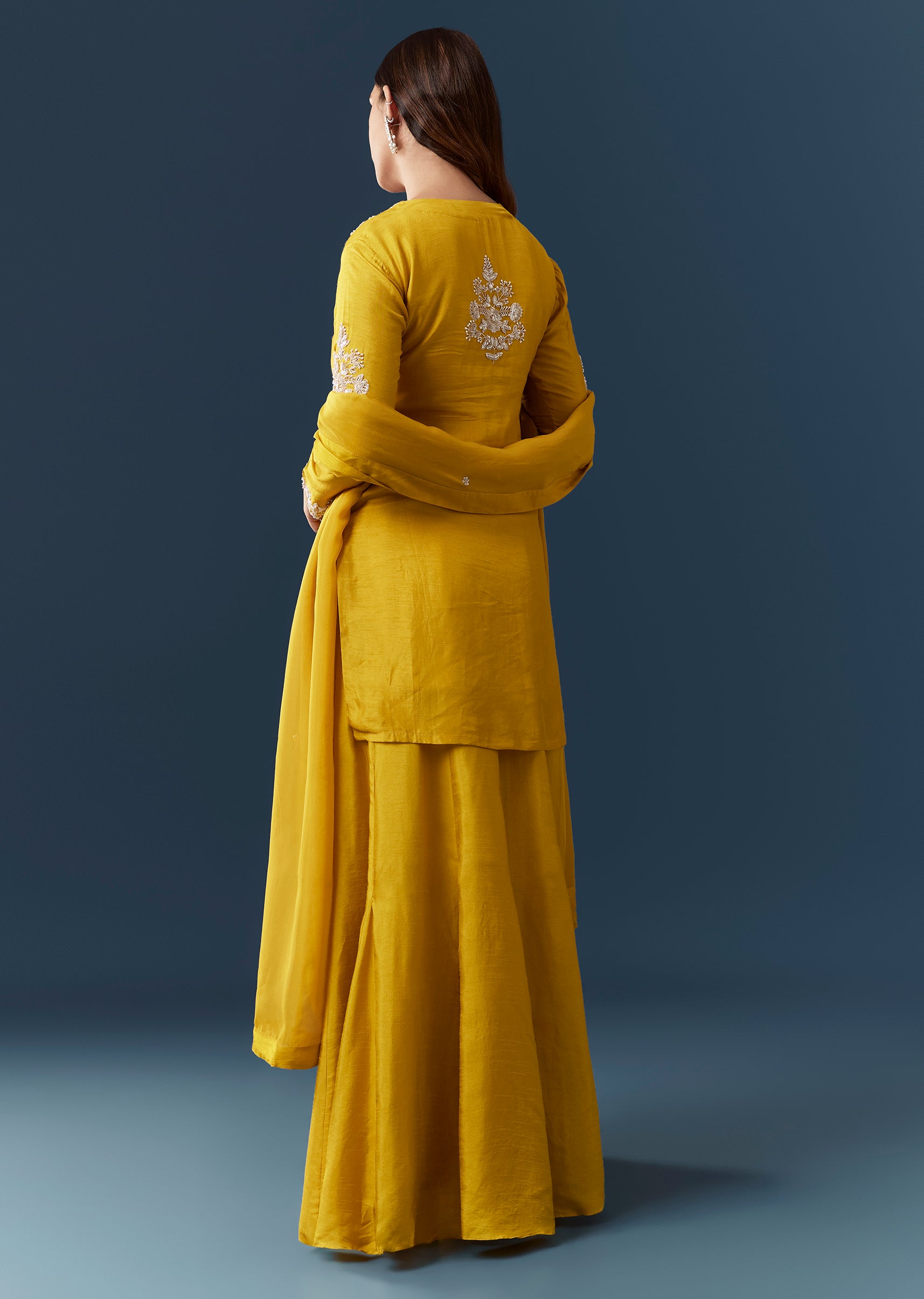Ensure the kurta fits comfortably at the shoulders and bust and check that the skirt sits securely at the waist for easy graceful movement.