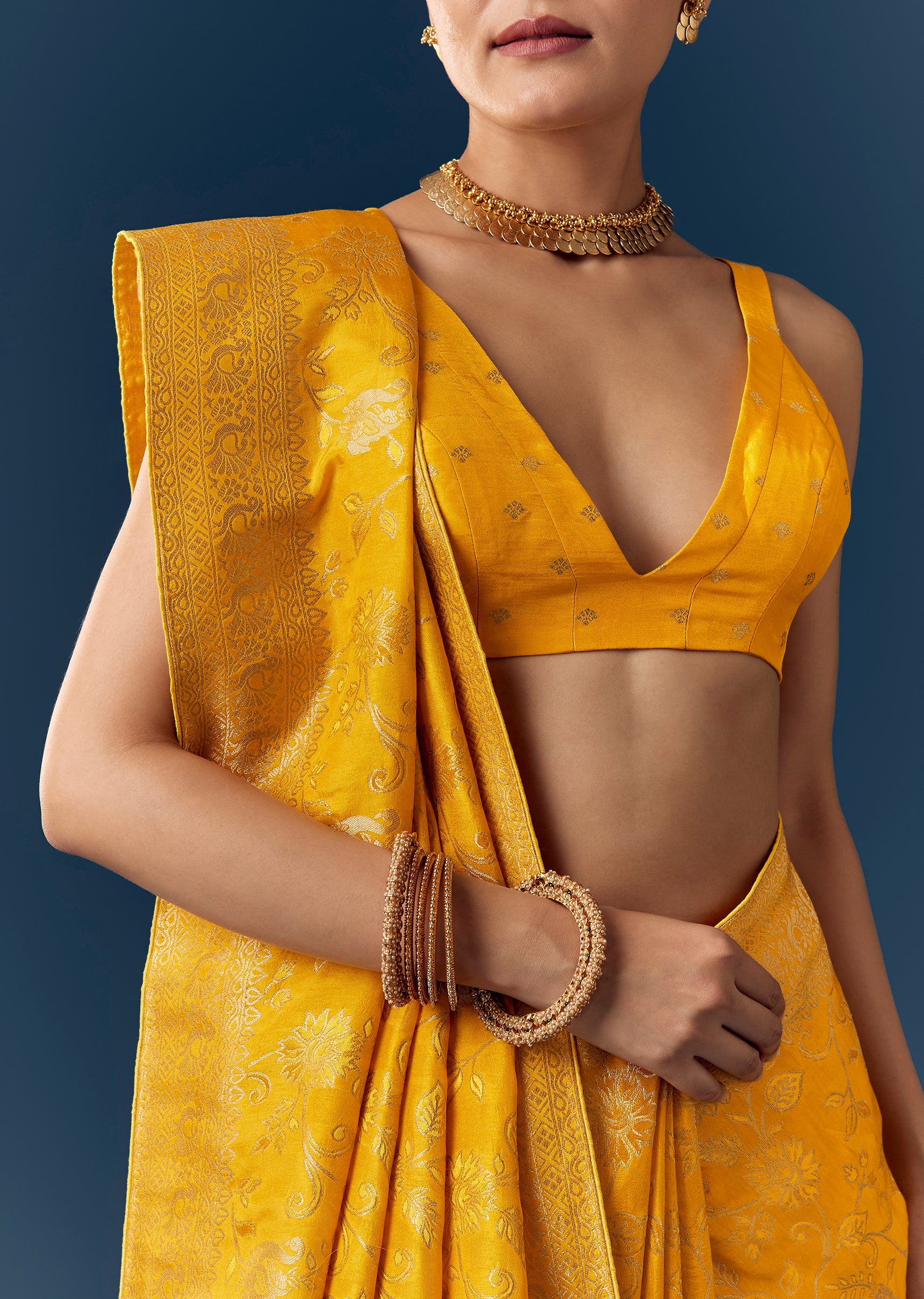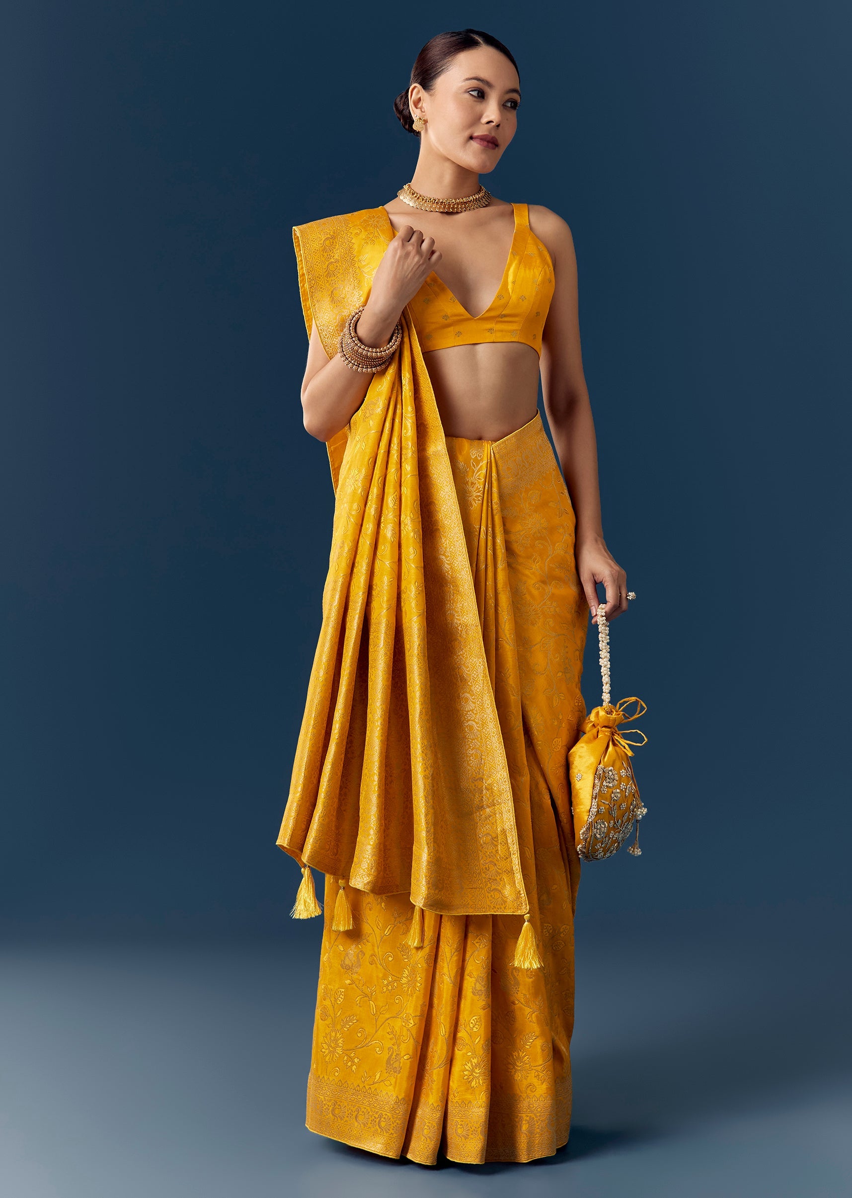A cheerful yellow dola silk saree with floral jaal woven detailing across the body and border—light, festive, and easy to drape, with unstitched blouse fabric included. Awarded as the Most Trusted Brand, we're delivering styles you love, just as promised.