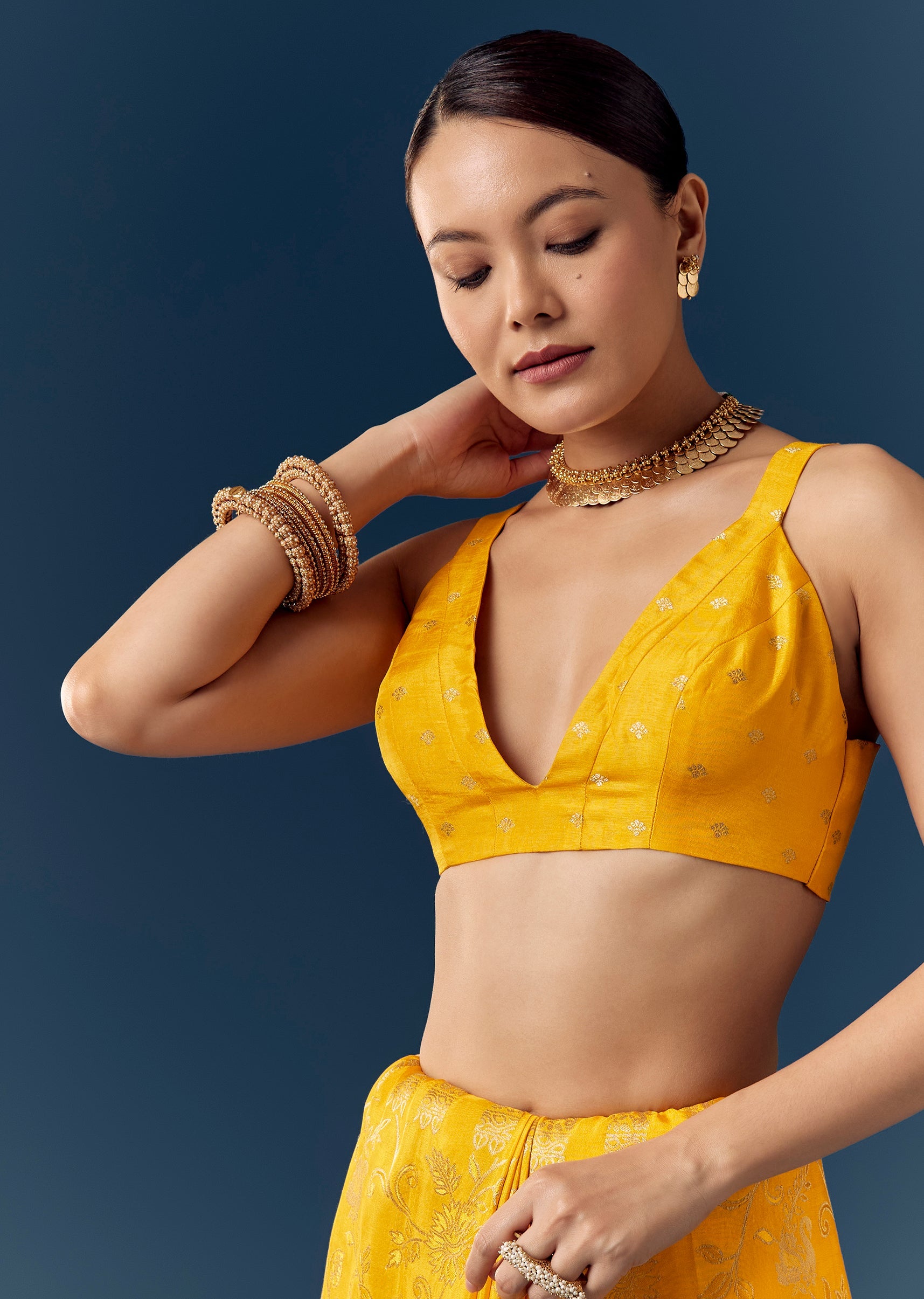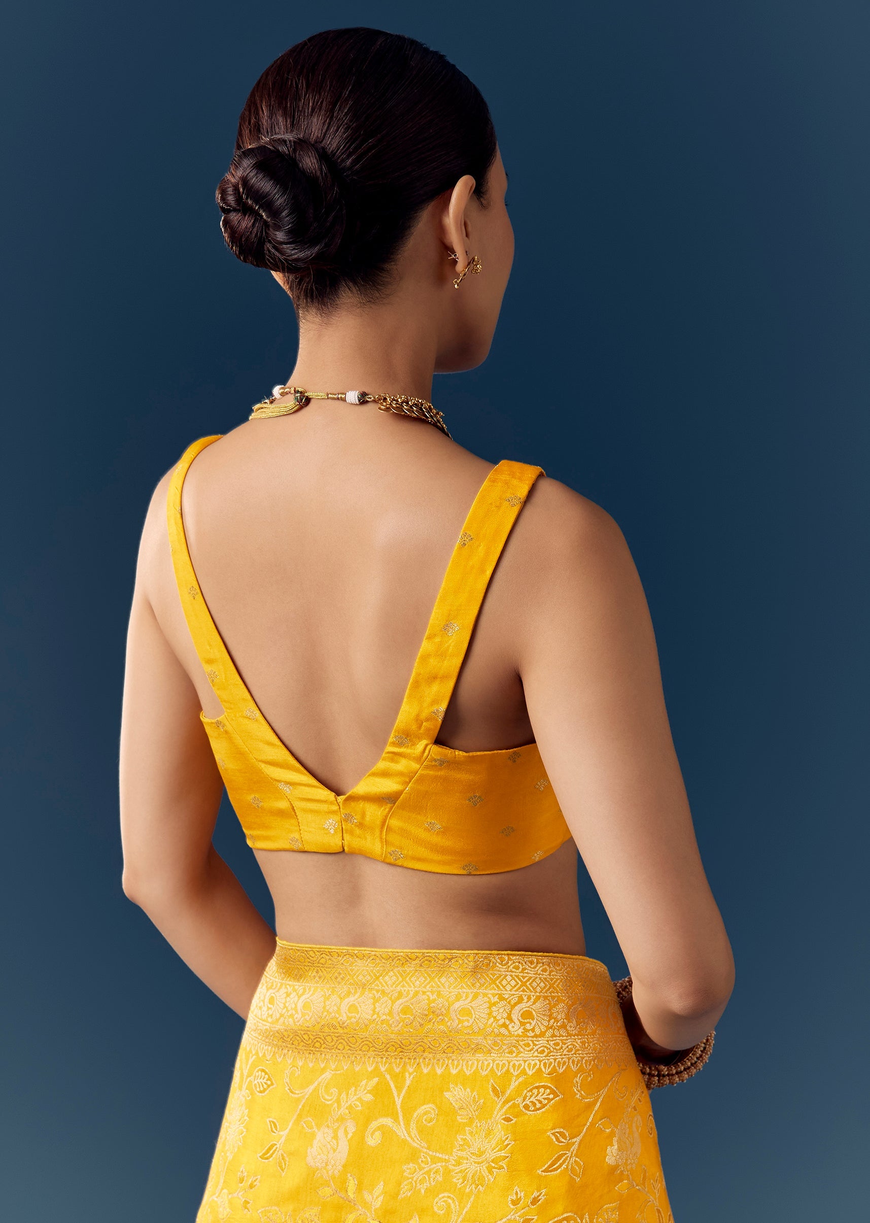 A cheerful yellow dola silk saree with floral jaal woven detailing across the body and border—light, festive, and easy to drape, with unstitched blouse fabric included. Awarded as the Most... More Product Details