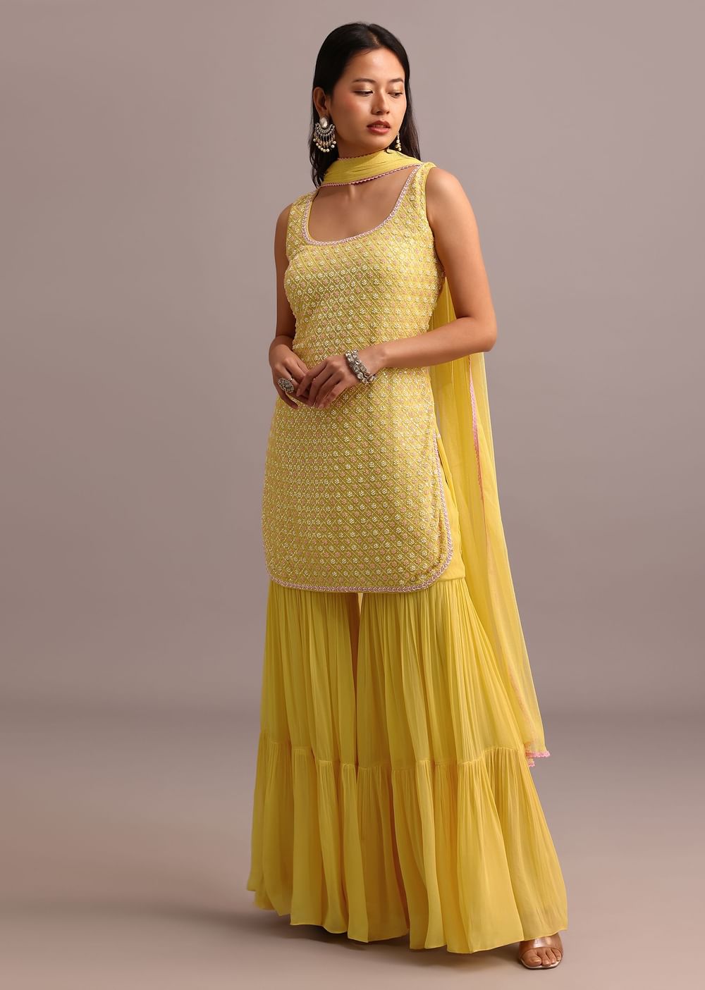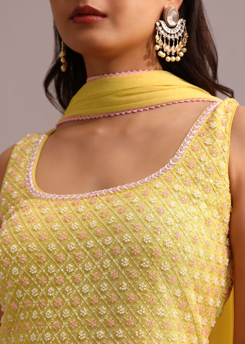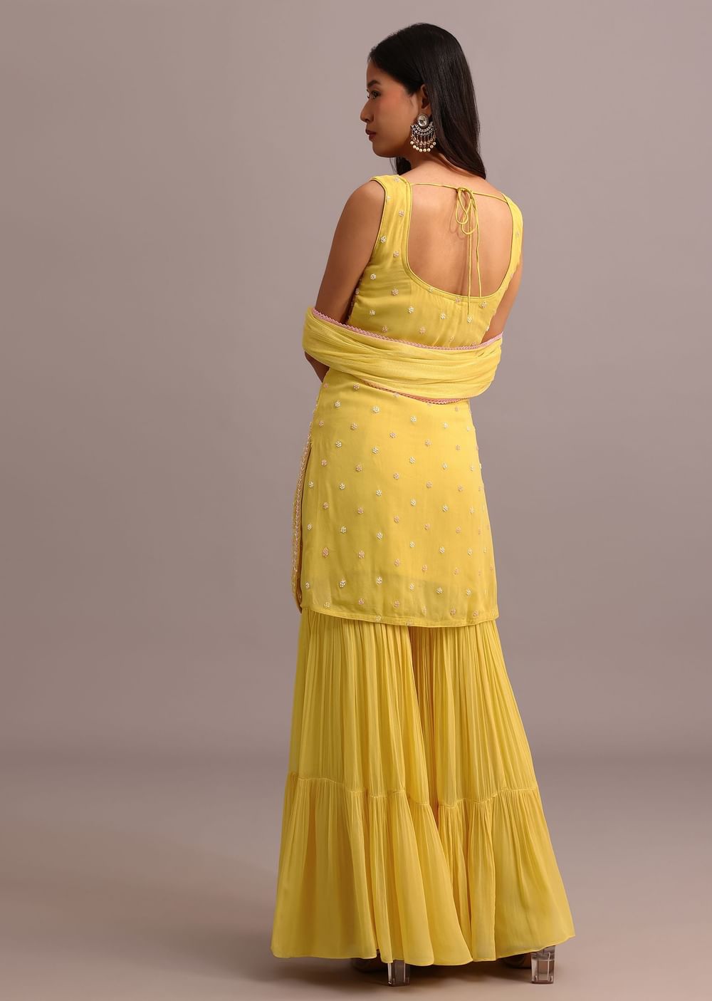 Radiating like a burst of sunshine, this vibrant yellow sharara set is a visual delight. The kurta is embellished with intricate embroidery, sequins, beads, and cut dana work, complemented by... More Product Details