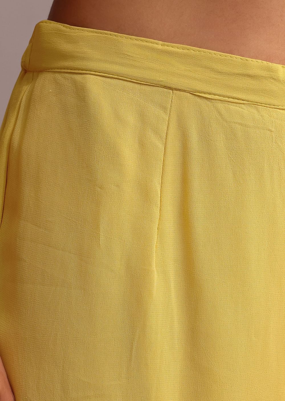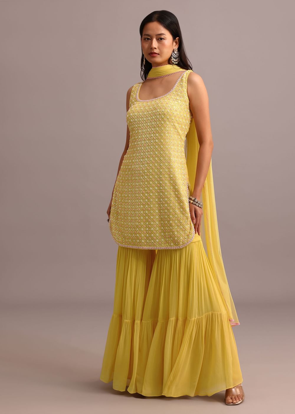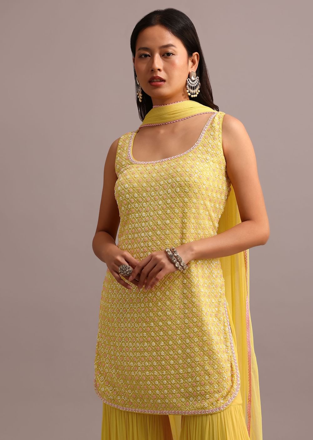 Radiating like a burst of sunshine, this vibrant yellow sharara set is a visual delight. The kurta is embellished with intricate embroidery, sequins, beads, and cut dana work, complemented by... More Product Details